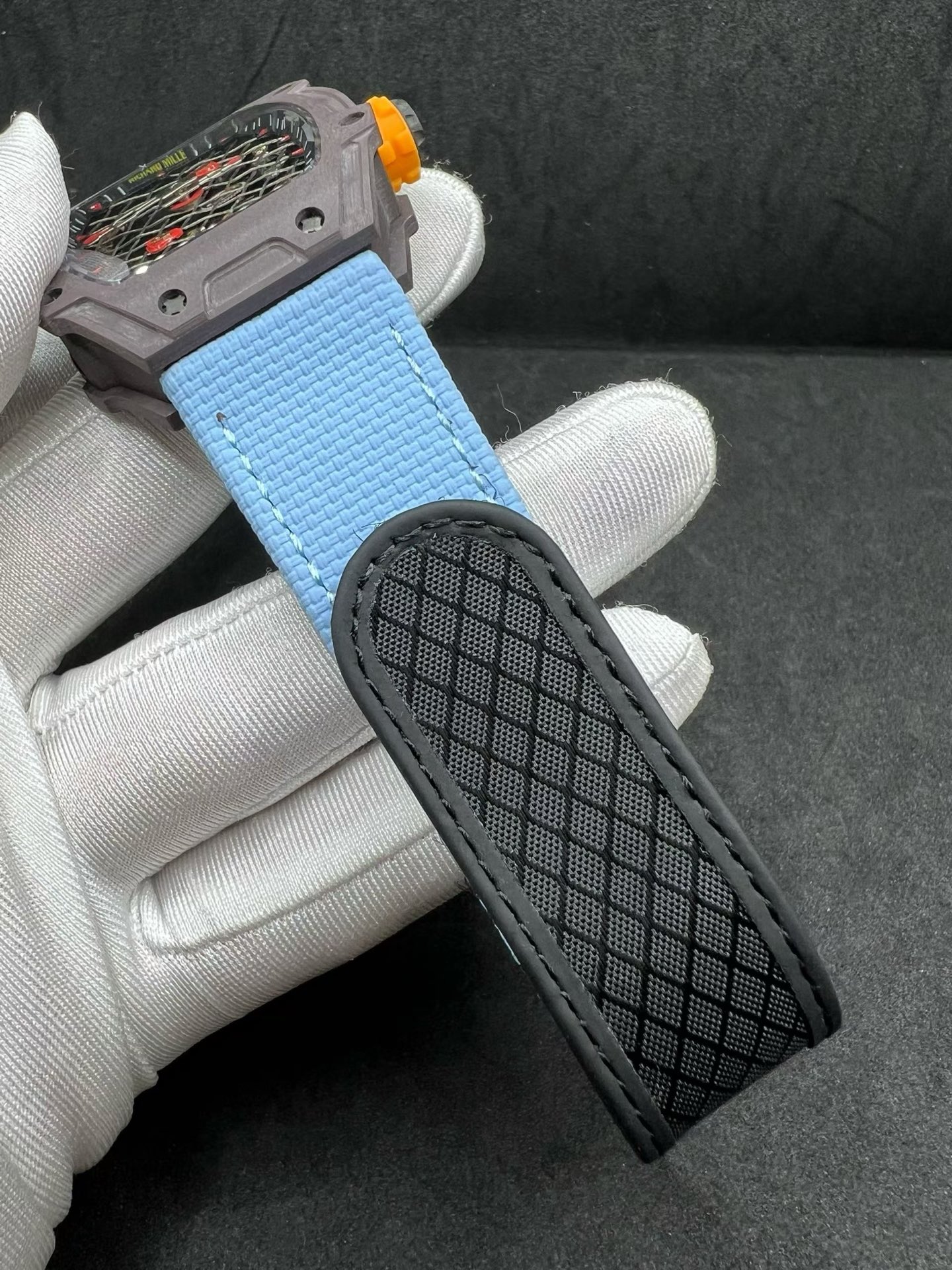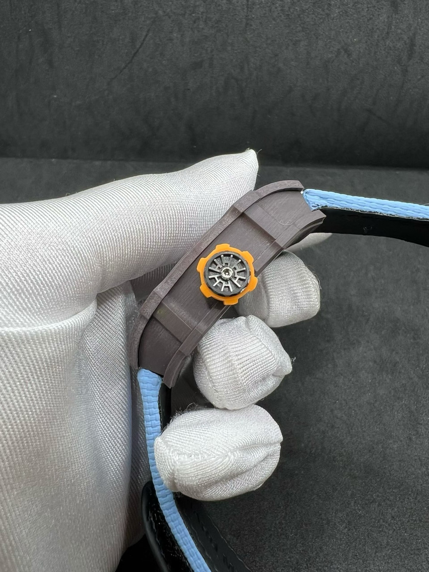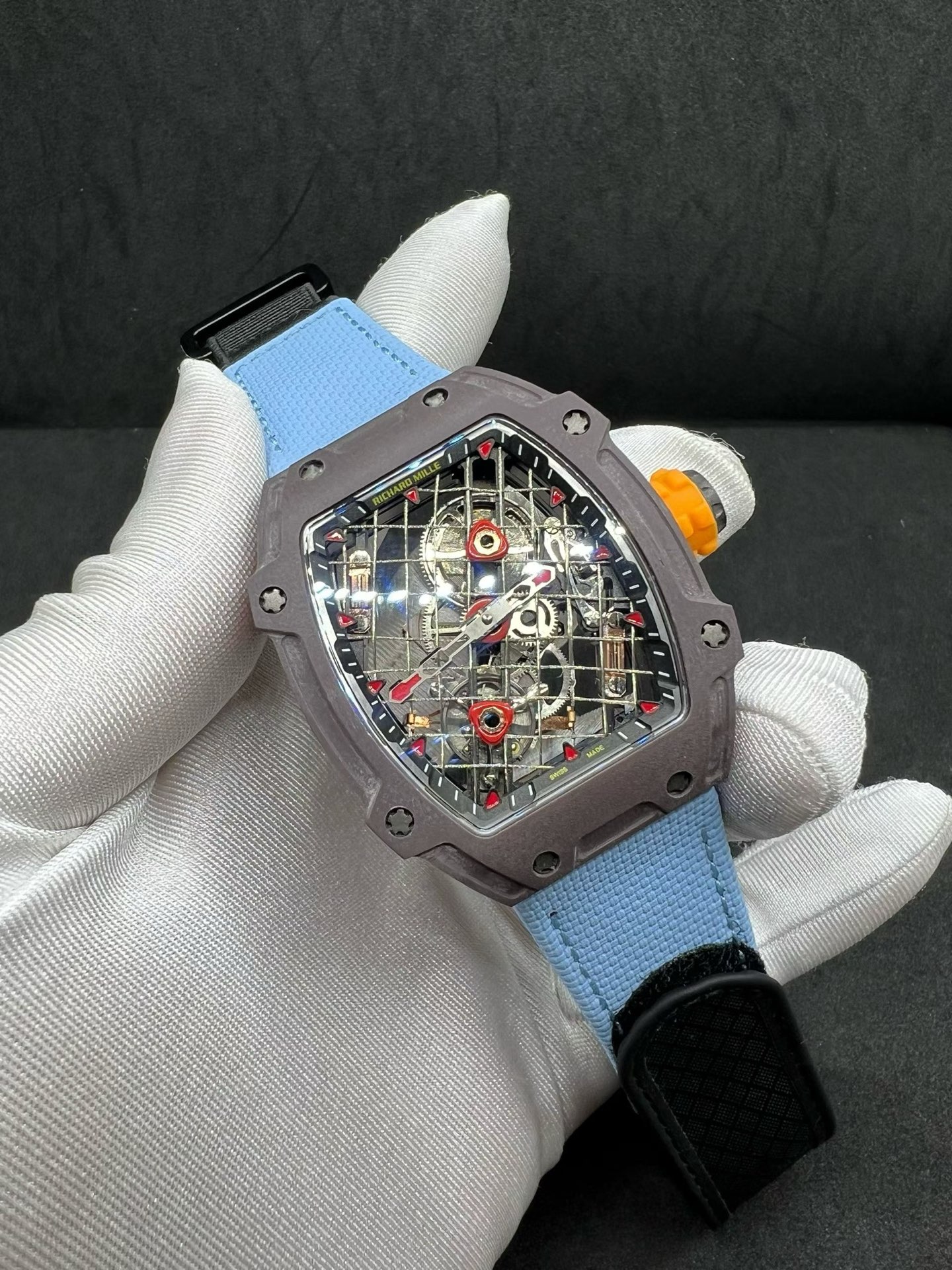 RM27-04は単なる時計ではなく、工学的な傑作です。手巻きトゥールビヨンムーブメントを搭載したこの時計は、ラファエル・ナダルのようなスポーツ選手が厳しい試合で着用することを想定して設計されています。時計の構造は、超軽量でありながら非常に頑丈な材料の組み合わせで強化されています。ストラップを含めてわずか30グラムという軽さを実現しており、チタン合金とTPTカーボンという特別に開発された複合素材を使用しています。この材料の選択は、時計の耐久性を確保するだけでなく、技術的な限界を押し広げるリシャール・ミルのコミットメントに沿っています。