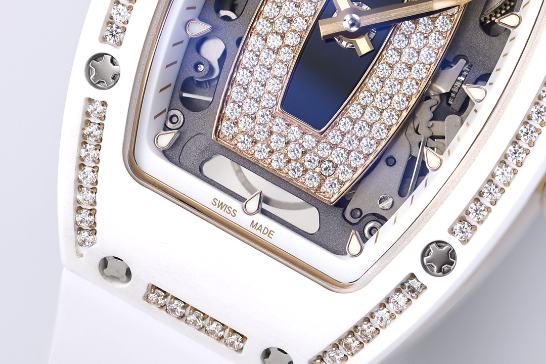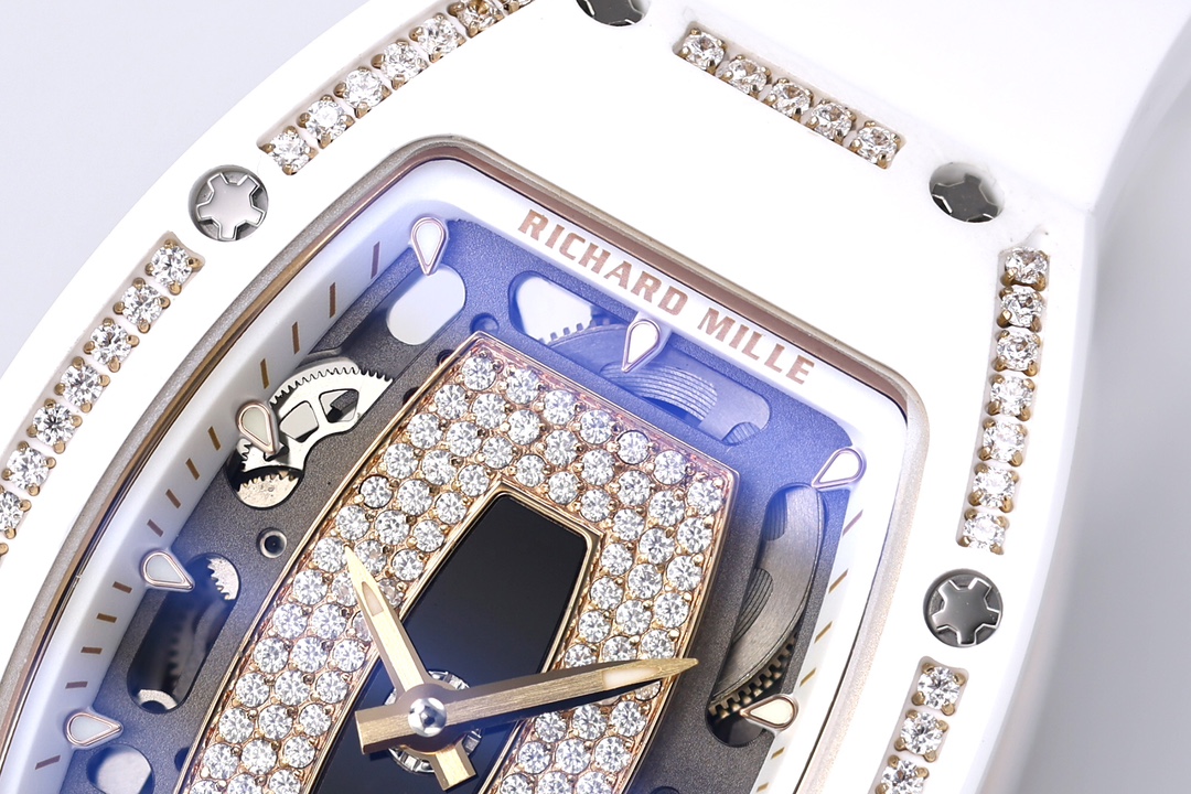 RM07-1のような時計を作り上げるには、細部への鋭い目だけでなく、時計製造の技術における卓越した専門知識も必要です。ZFは、革新的なセラミックとダイヤモンドセッティング技術によってこの技術を高めています。ダイヤモンドチップ付きの工具を備えた特殊なCNC機械を使用して、鮮やかなセラミックケースに0.25mmの微細な穴を開けています。これは個々に手作業で作られた赤金の爪セッティングを各ダイヤモンドに合わせるための精密さの証です。