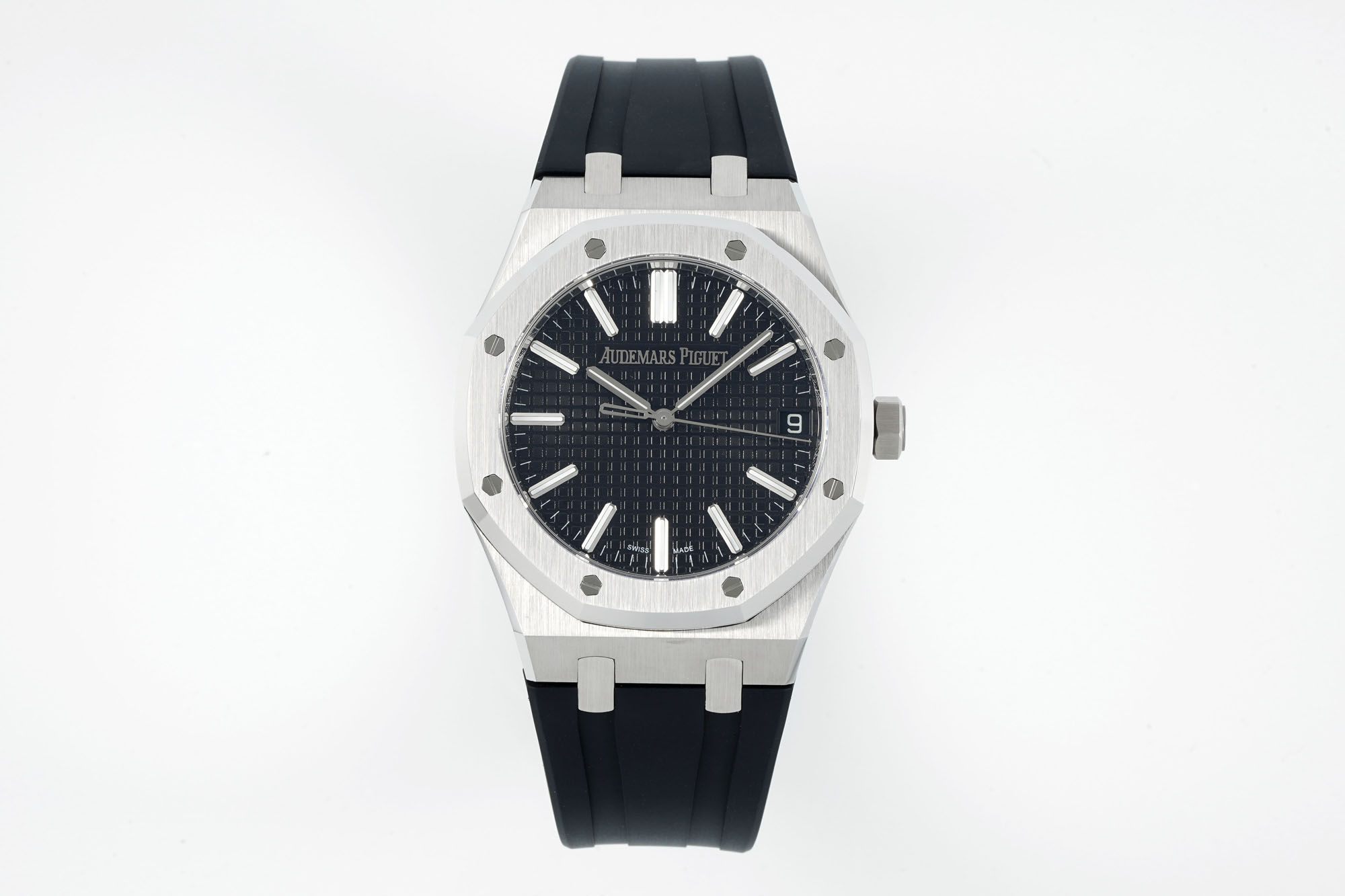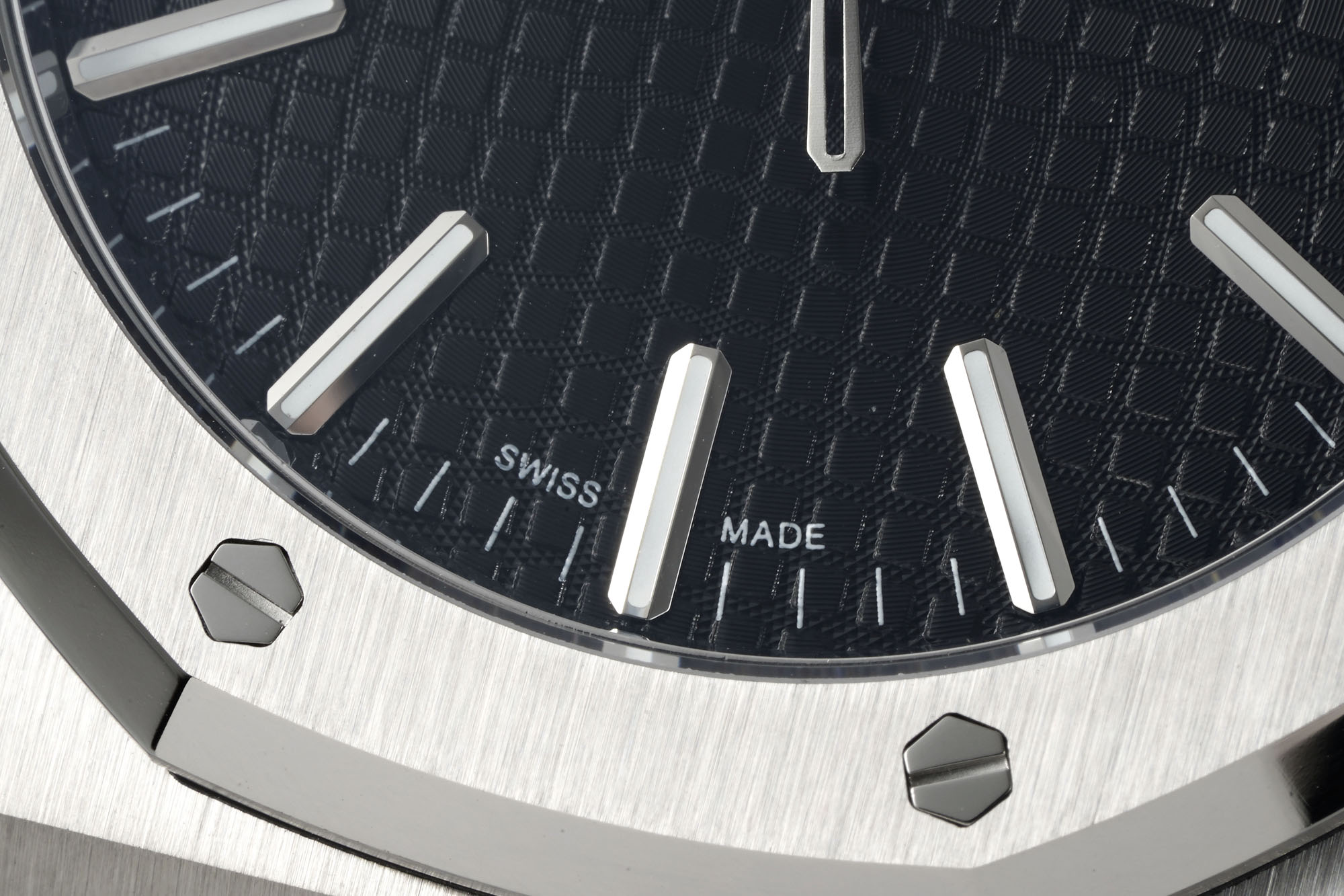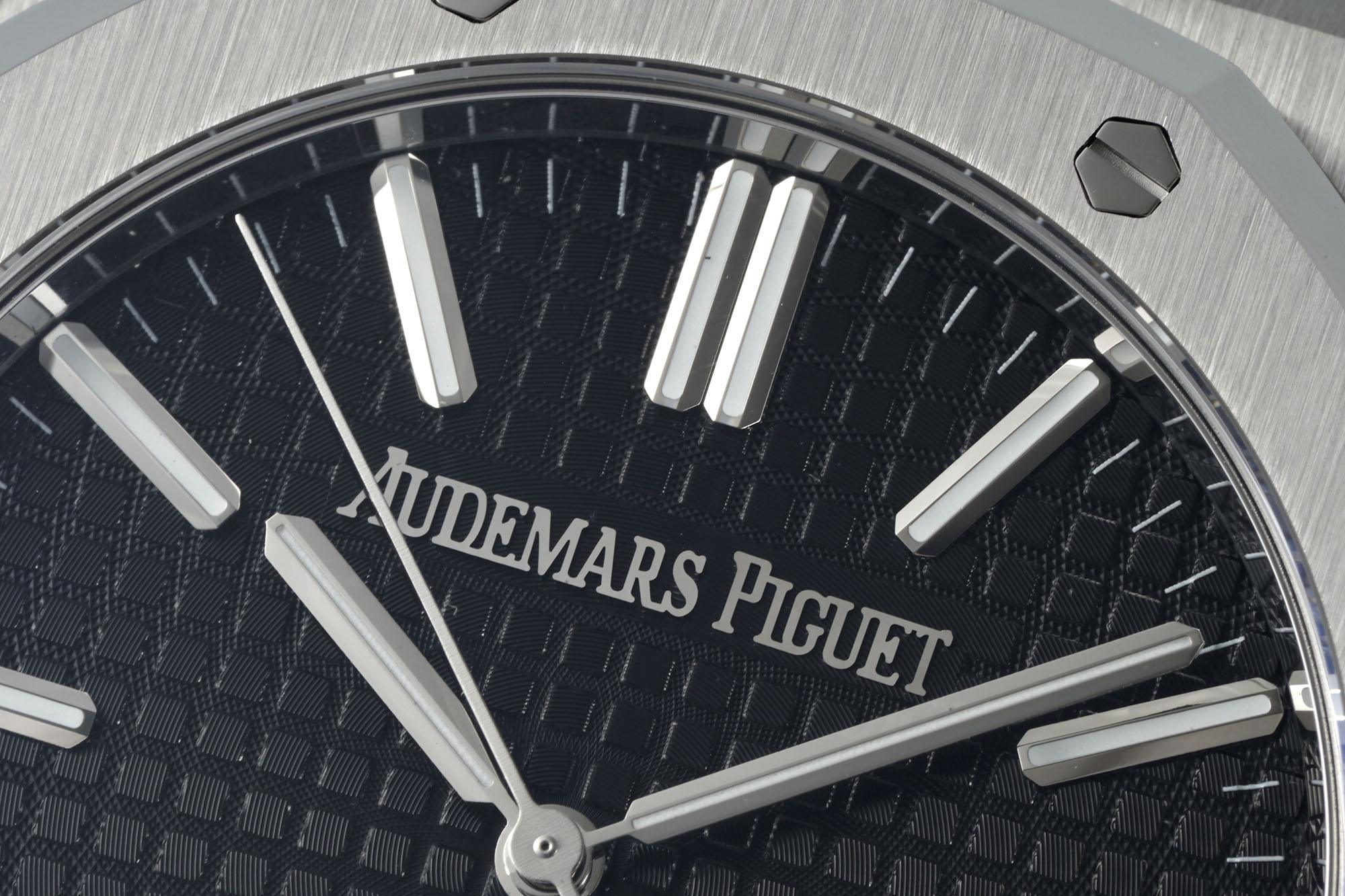 DDF ロイヤルオーク レプリカのすべての視覚要素は、卓越性へのこだわりを反映しています。針は15500モデルよりわずかに細く長く設計され、0.5mmの違いでありながら美的連続性を維持しています。さらに、文字盤のロゴはオリジナルの複雑なデザインを忠実に再現し、特有の長い足のある’A’や斜めの’E’のバーなどの特徴的なディテールを含んでいます。