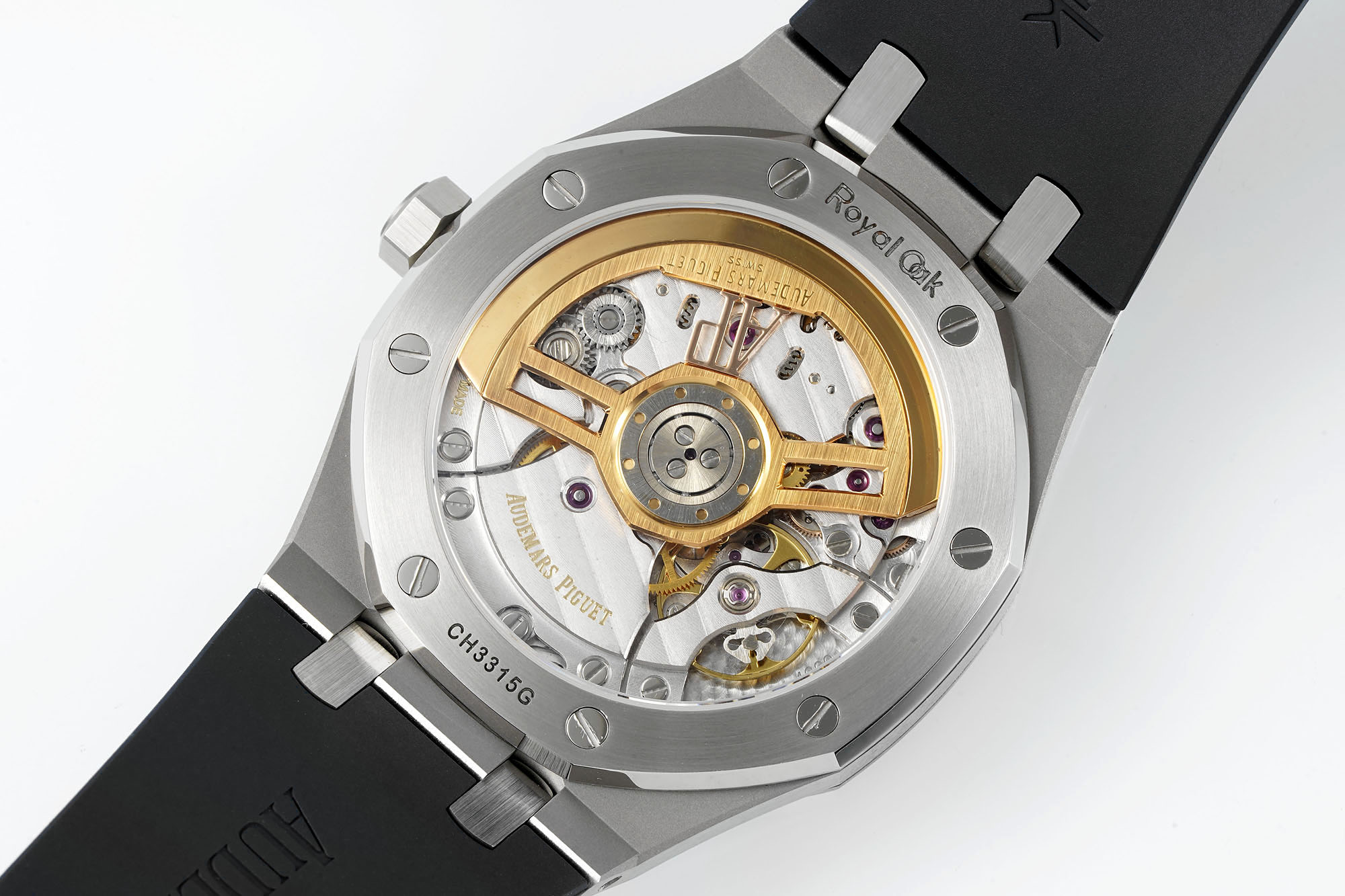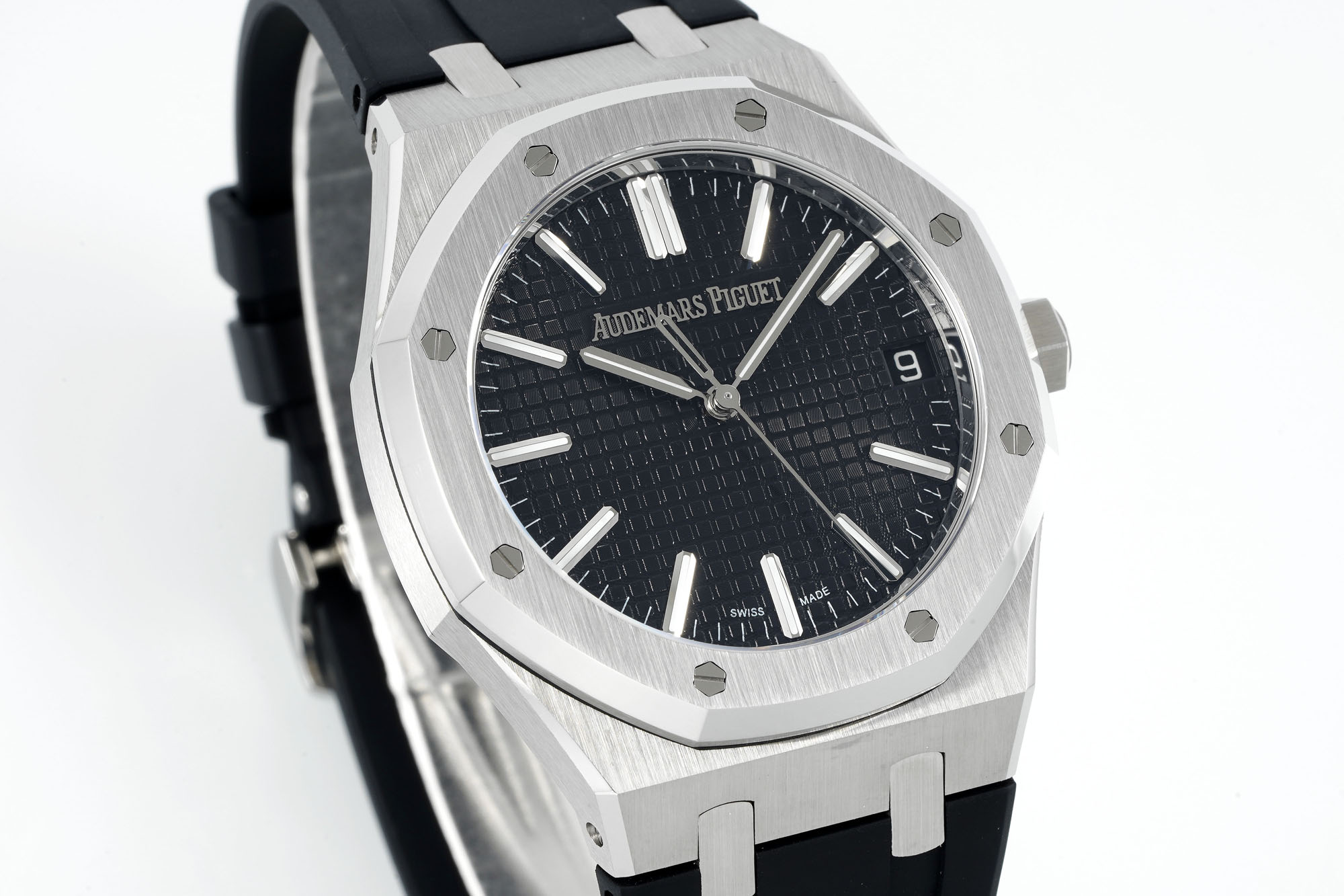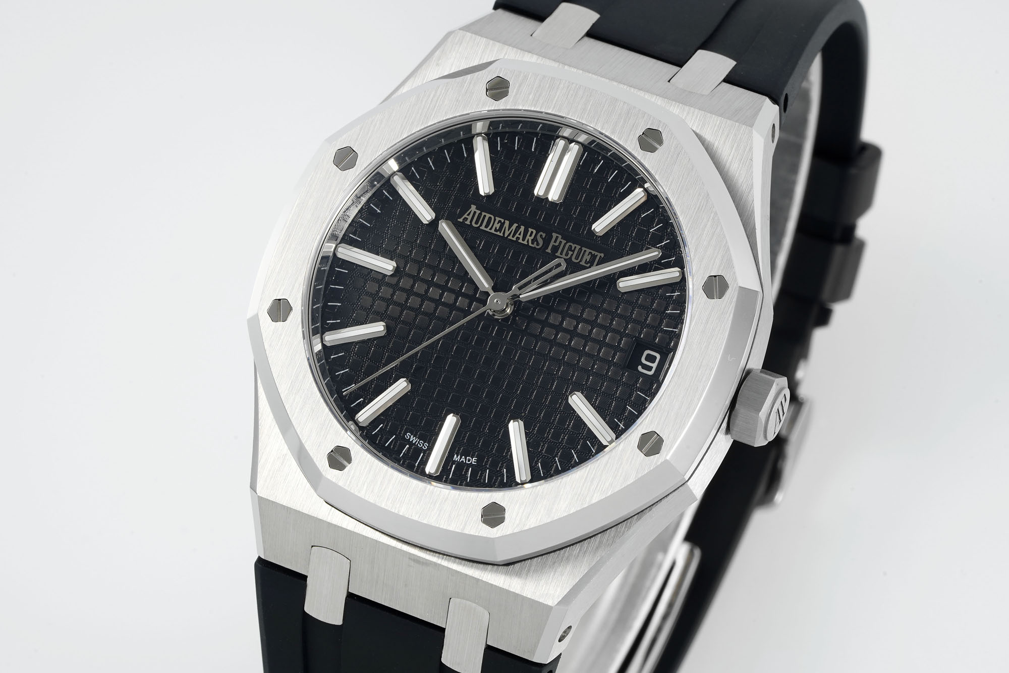 DDF ロイヤルオーク レプリカのすべての視覚要素は、卓越性へのこだわりを反映しています。針は15500モデルよりわずかに細く長く設計され、0.5mmの違いでありながら美的連続性を維持しています。さらに、文字盤のロゴはオリジナルの複雑なデザインを忠実に再現し、特有の長い足のある’A’や斜めの’E’のバーなどの特徴的なディテールを含んでいます。
