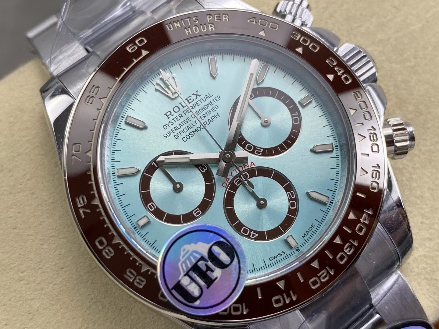 特に「アイスブルーダイヤル」バリアントのロレックス デイトナは、その独特の外観とキャリバー4131ムーブメントの技術的偉業で称賛されています。しかし、最近のUFOによるレプリカ時計製造の進展は、伝統的な認証カードなしの「UFO製4131」とラベル付けされたバージョンを導入しました。このムーブメントは、裏側が見えるケースバックのような特徴を取り入れ、本物とほとんど区別がつかないレプリカの基準を再定義しています。これは、慎重さが常に重要視されていた市場における大胆な動きです。