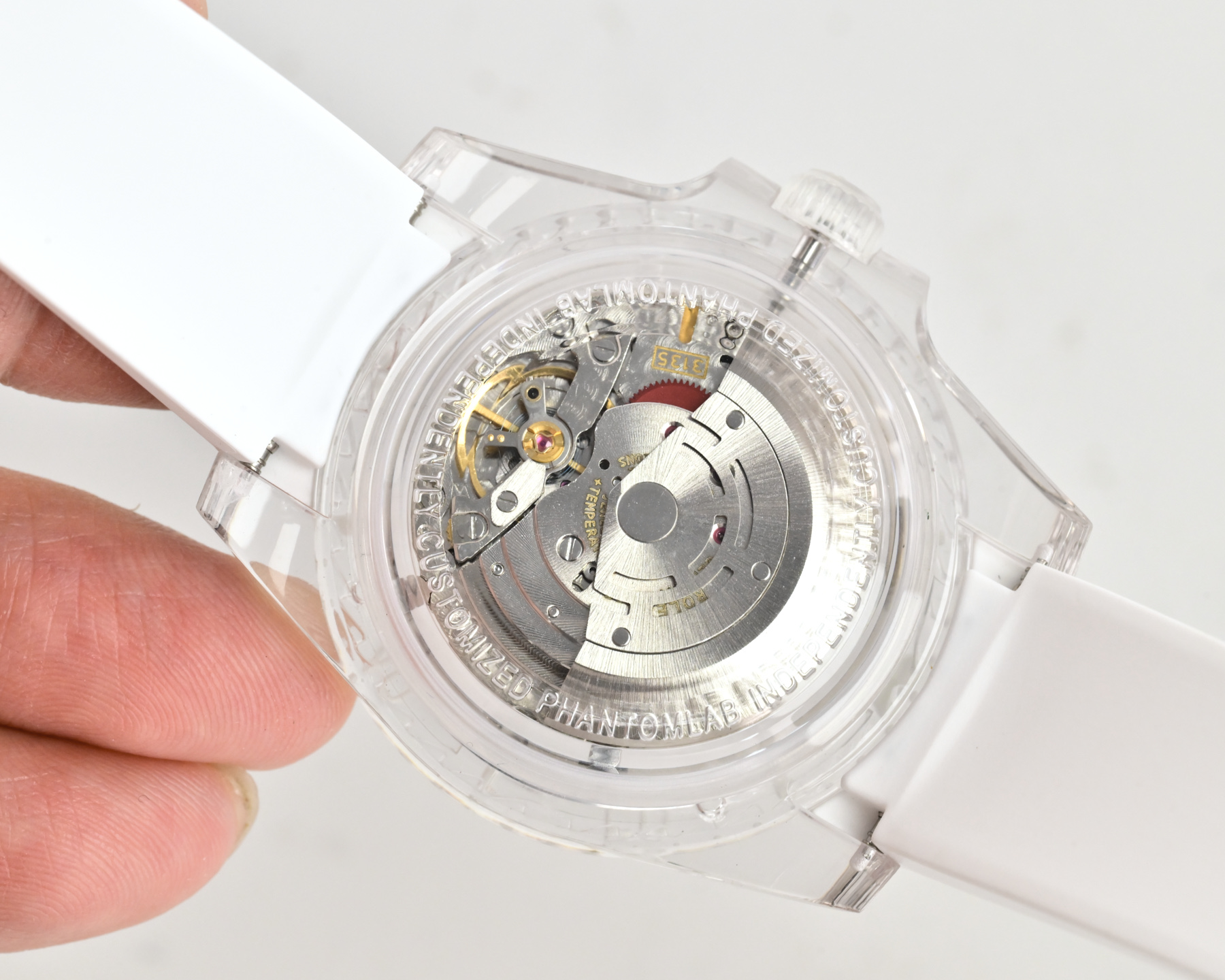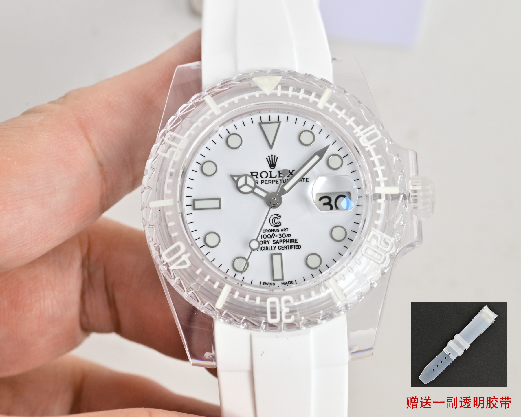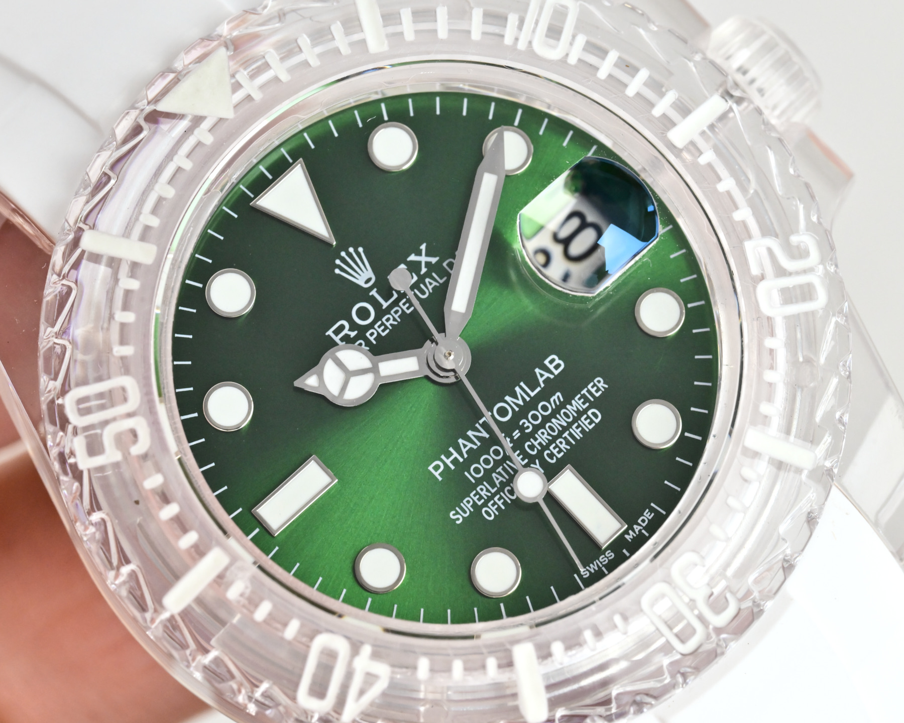この透明な驚異の内部には、精密さの心臓であるロレックスのクラシックな3135青いヒゲゼンマイムーブメントが息づいています。この自動機械式の心臓は透明な裏蓋を通して見ることができ、その内部の複雑な動作を賞賛することができます。透明性は美的な喜びを提供する以上のものであり、時を刻む正確さを決定する精密な工学を率直に見せる希少な機会を提供します。こうした開放性は、高級時計業界の神秘性を解き明かし、より広範なオーディエンスに工芸をよりアクセスしやすくし、評価される招待状と見なすことができます。