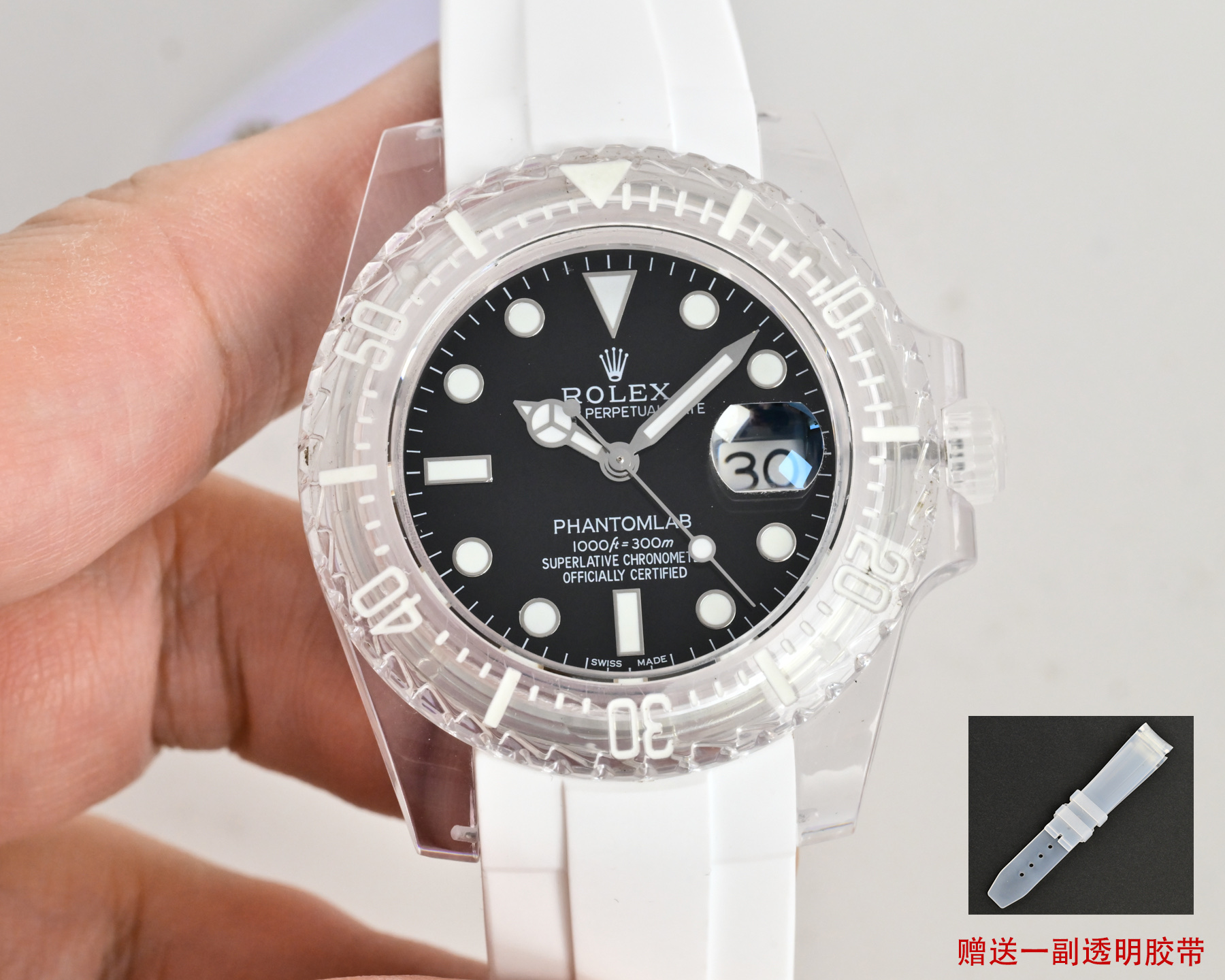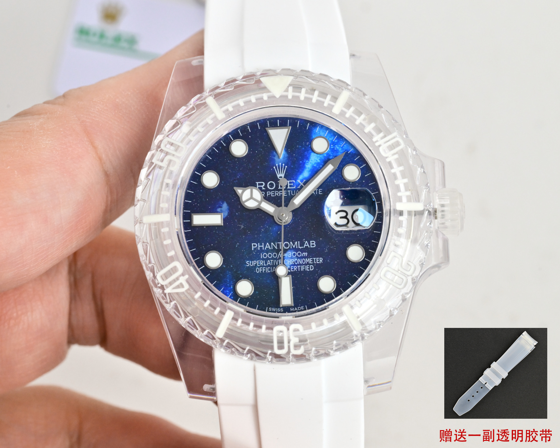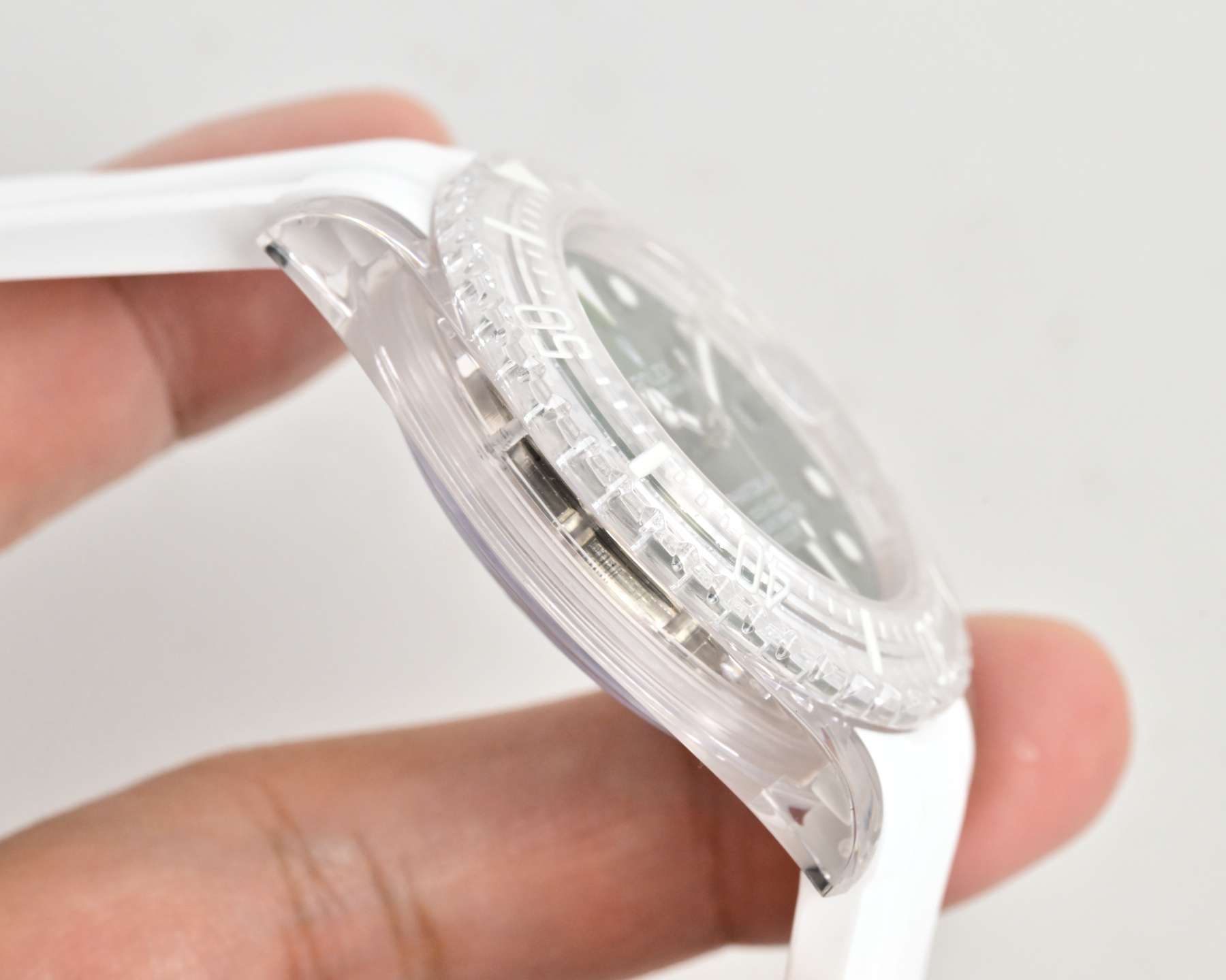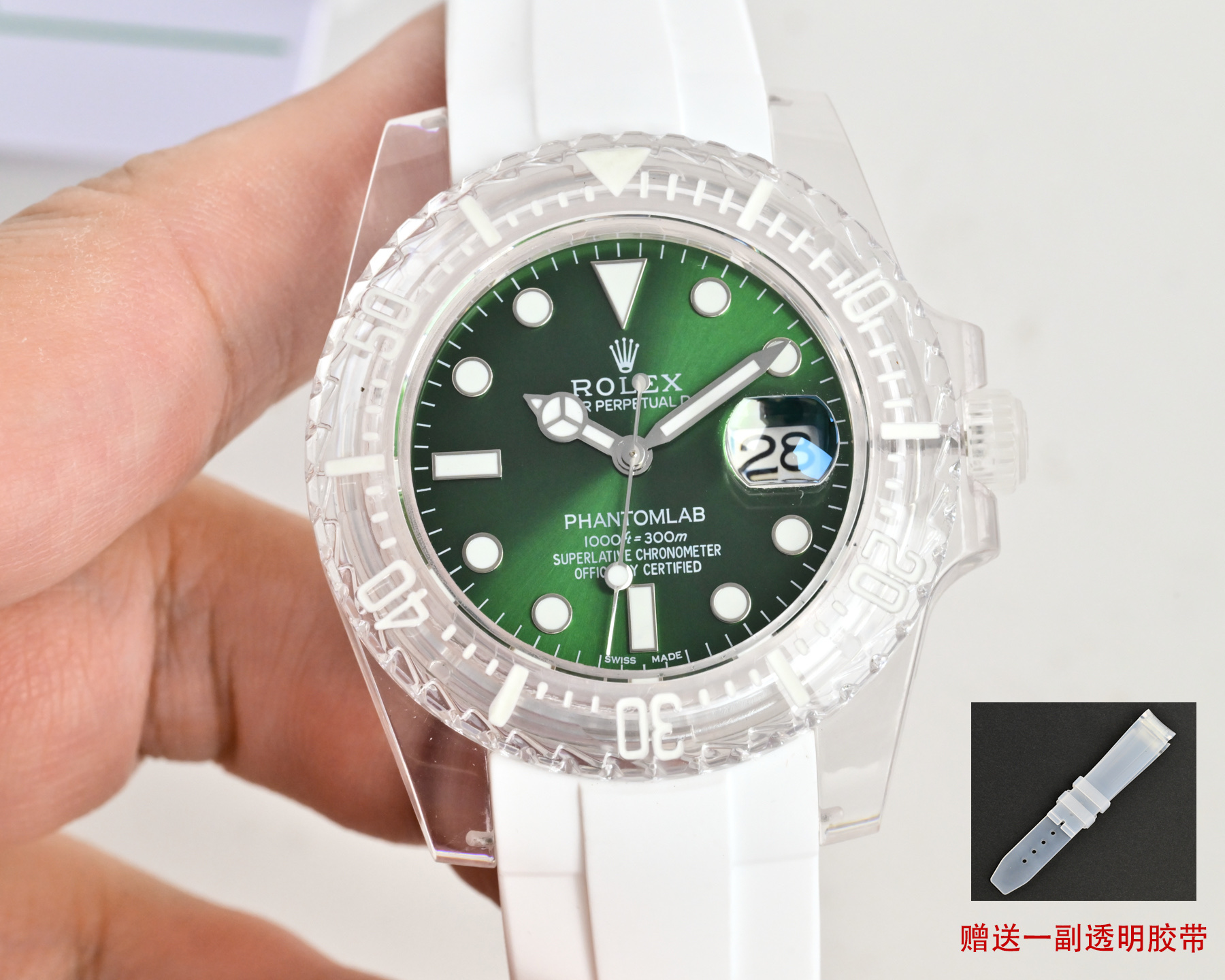 この透明な驚異の内部には、精密さの心臓であるロレックスのクラシックな3135青いヒゲゼンマイムーブメントが息づいています。この自動機械式の心臓は透明な裏蓋を通して見ることができ、その内部の複雑な動作を賞賛することができます。透明性は美的な喜びを提供する以上のものであり、時を刻む正確さを決定する精密な工学を率直に見せる希少な機会を提供します。こうした開放性は、高級時計業界の神秘性を解き明かし、より広範なオーディエンスに工芸をよりアクセスしやすくし、評価される招待状と見なすことができます。