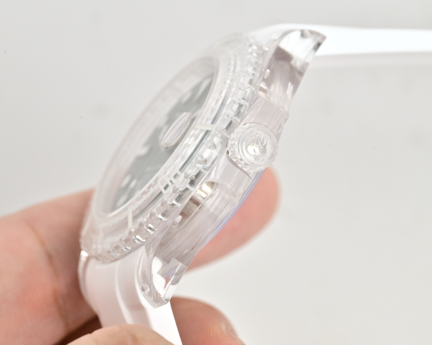 80mmの圧倒的な直径を持つクリスタルシリーズは、従来の時計のサイズに挑戦し、その大胆さを受け入れる勇気を持つ男女にアピールします。で構成された時計ケースは、永遠の透明感と耐久性を約束し、黄ばみを防ぎ傷を耐える革新的な素材選択の特徴です。この素材選択は、美観を犠牲にすることなく耐久性へのコミットメントを強調します。ここに倫理的な次元があります。外見が優先されることが時に批判される業界において、クリスタルシリーズは持続可能性と長寿命の証として立ちます。