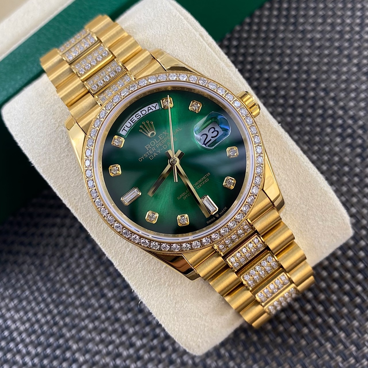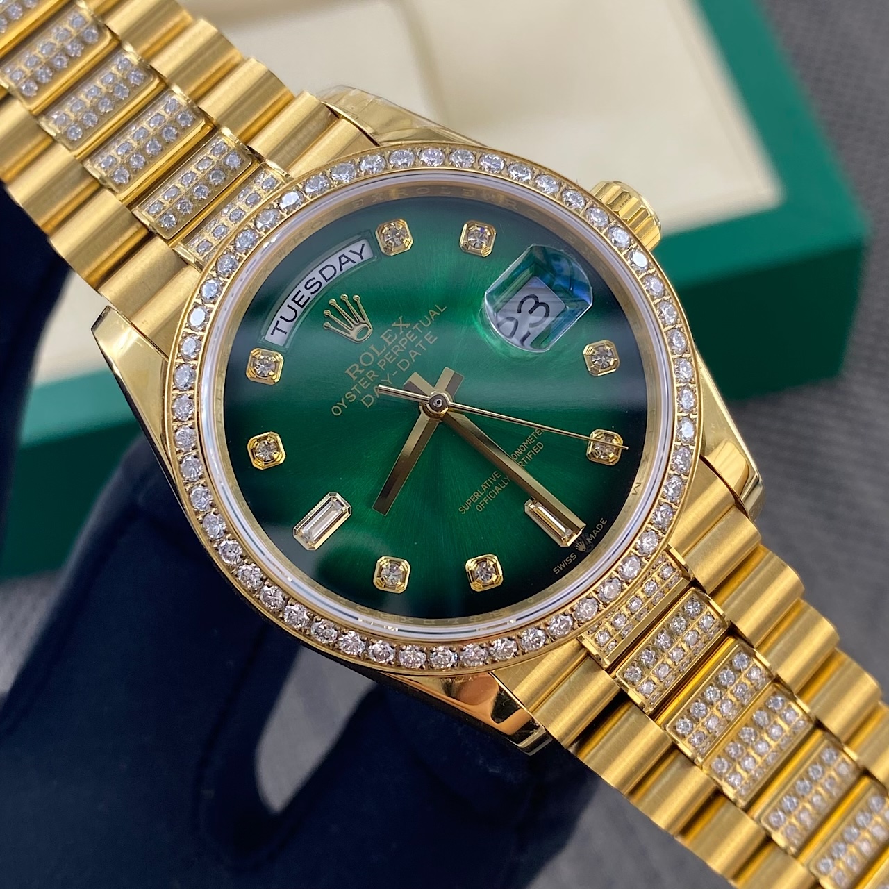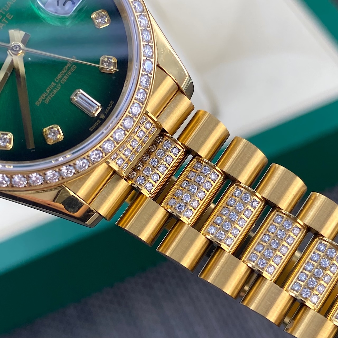 新しいデイデイトの緑のグラデーション文字盤は、ロレックスの歴史を彷彿とさせるだけでなく、時計デザインにおける偉業でもあります。この36mmの傑作は、本物のダイヤモンドで装飾され、高級顧客向けに完全にカスタマイズされたバージョンも提供される一方で、オリジナルのエッセンスを求める人々向けに標準版も用意されています。緑色の選択は美的なもの以上に、富、活力、排他性を連想させ、ロレックスのイメージに完璧に一致しています。