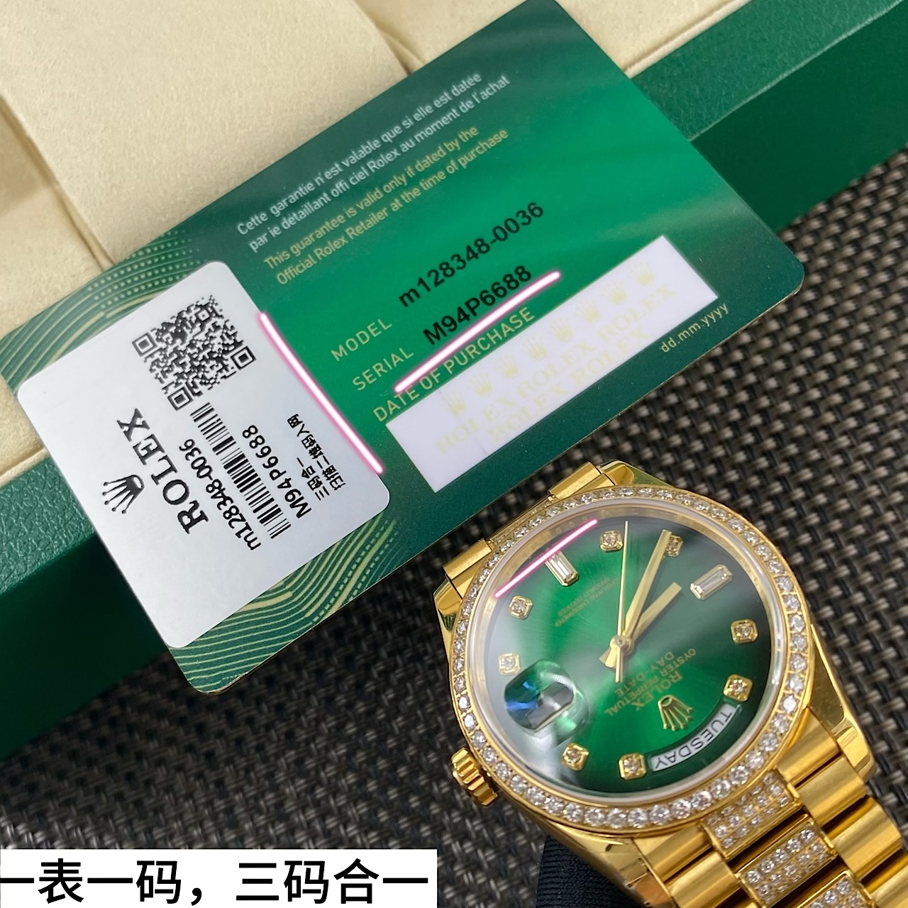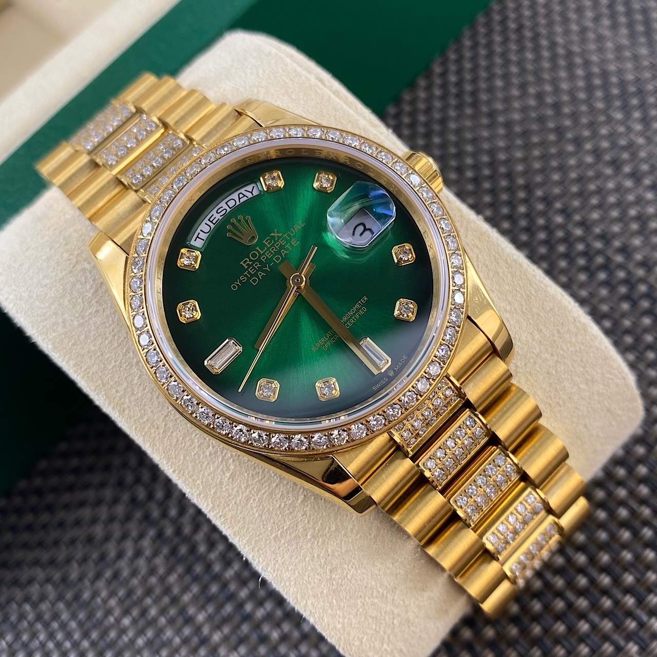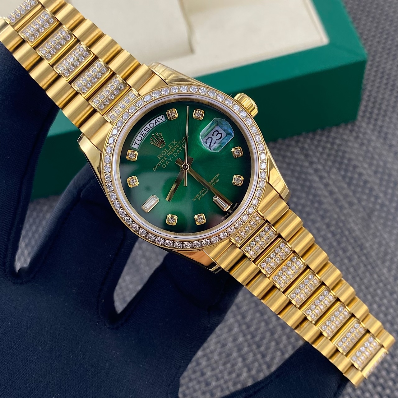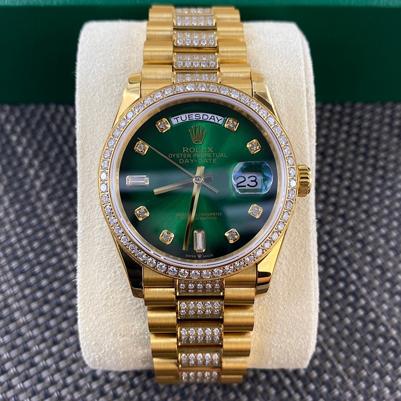 新しいデイデイトの緑のグラデーション文字盤は、ロレックスの歴史を彷彿とさせるだけでなく、時計デザインにおける偉業でもあります。この36mmの傑作は、本物のダイヤモンドで装飾され、高級顧客向けに完全にカスタマイズされたバージョンも提供される一方で、オリジナルのエッセンスを求める人々向けに標準版も用意されています。緑色の選択は美的なもの以上に、富、活力、排他性を連想させ、ロレックスのイメージに完璧に一致しています。