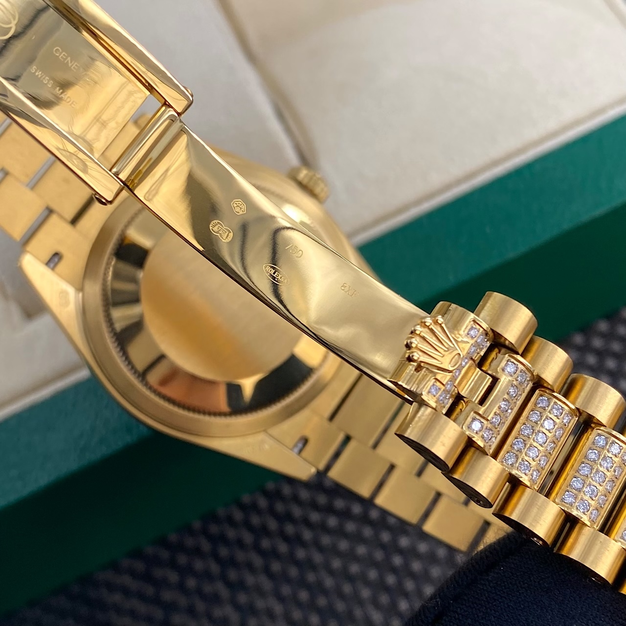 職人技はブレスレットにも及び、ロレックスの隠しフォールディングクラスプはセキュリティと美的連続性を両立させています。これらの要素は、ロレックスの専門技術のほぼ80%を体現しており、デイデイトを単なる時計以上の、革新、優雅さ、精度の遺産としています。