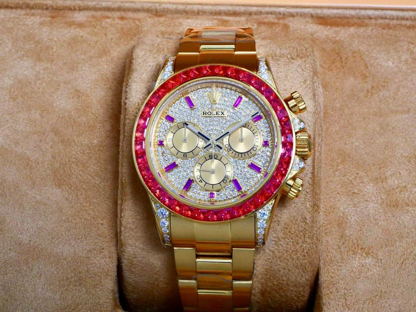 RXカスタマイゼーションは、ダイヤモンドの代わりに高品質のモアサナイトを使用するなど、最高級の素材を優先して使用し、輝きと耐久性を確保しています。文字盤には、白金の電気メッキによって色の鮮やかさを高めたカラフルな宝石のインデックスがしばしば施されています。この改造アプローチは、デイトナの本質的なデザイン要素を尊重しつつも向上させ、新たな解釈を提供しながらもその核心を保っています。
