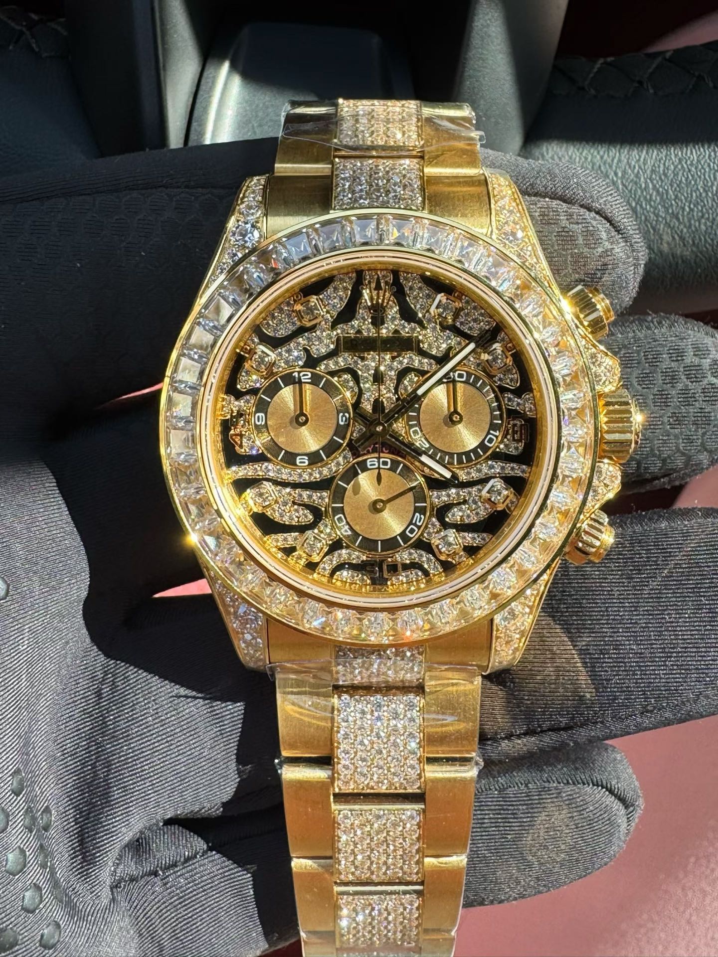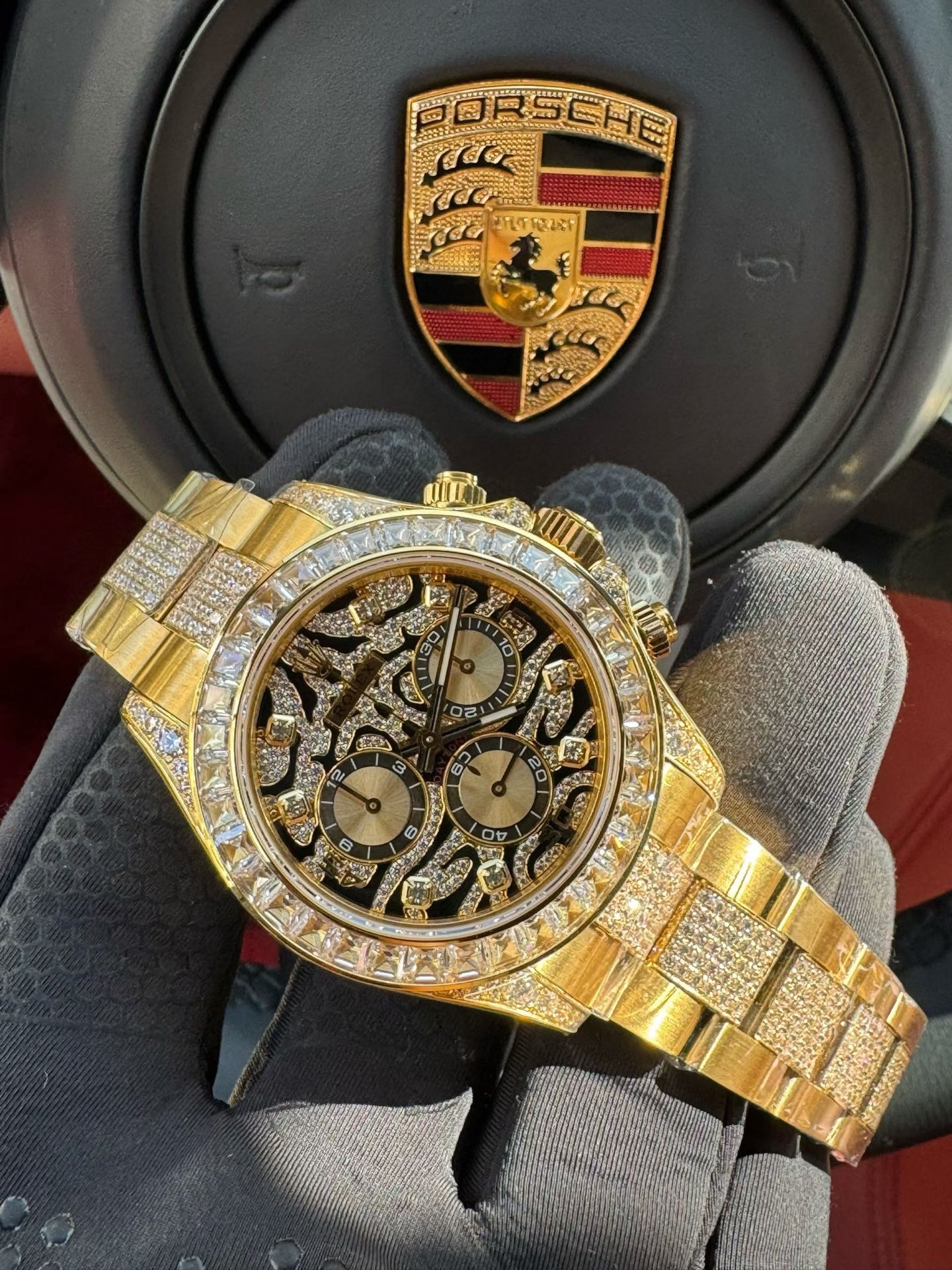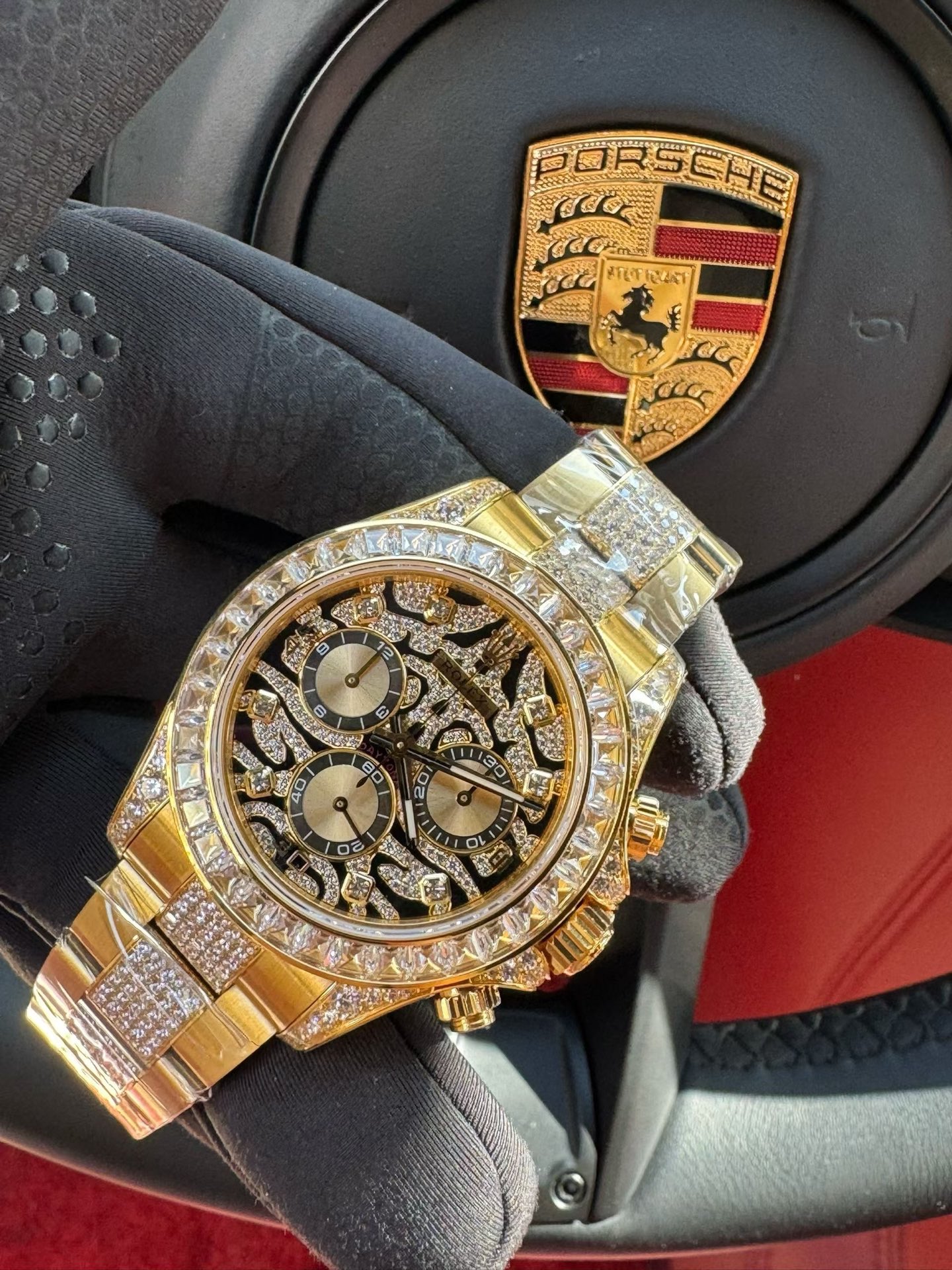 ロレックスのレインボー デイトナは、その鮮やかな色彩と豪華さの融合で称賛を集めています。この特定のレプリカは、オリジナルの伝説的な美学を忠実に再現しています。際立った特徴であるベゼルは、色のスペクトラムで輝き、オリジナルに近づけるために宝石の角度とサイズを慎重にアップグレードしています。この本物の色彩体験を再現するためのこだわりは、サテン仕上げの文字盤によって支持され、時計の輝かしい魅力を引き立てています。細部への配慮は、人間工学的側面にも及んでおり、時計ケースには微調整された滑り止めボタンギアが搭載され、美しさと実用性を両立しています。