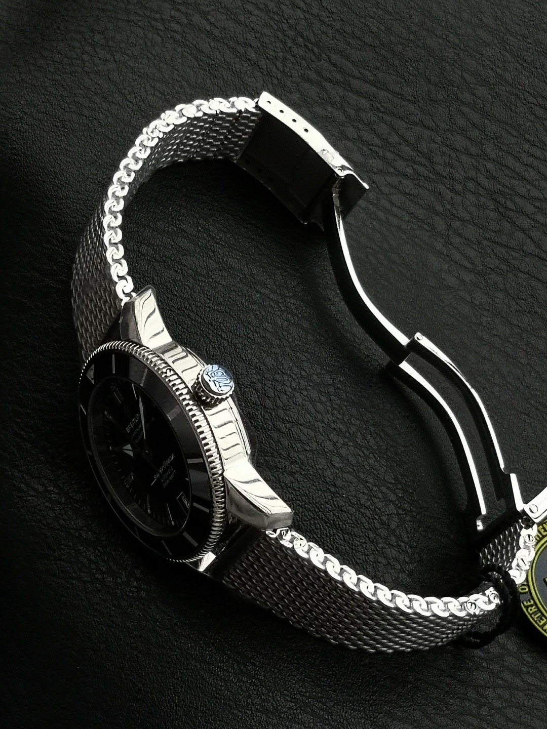 ダイバーズウォッチの世界は、頑丈なデザインと荒々しい美学で特徴づけられることが多いですが、ブライトリングのスーパーオーシャン ヘリテージラインはこれらの慣習からの爽やかな逸脱を提供します。1957年に最初に発売されたスーパーオーシャン プロフェッショナル ダイブウォッチは、ダイビング愛好者の間で瞬く間に人気を集め、今日でもその人気を保っています。最新のブライトリング スーパーオーシャン ヘリテージは、20世紀中頃の前モデルの優れた特性を保持しつつ、現代的なスタイルを融合させたエレガントでプロフェッショナルな外観を呈しています。本日は、この独特なダイブウォッチ、モデルRB2010121B1S1の細部に迫ります。