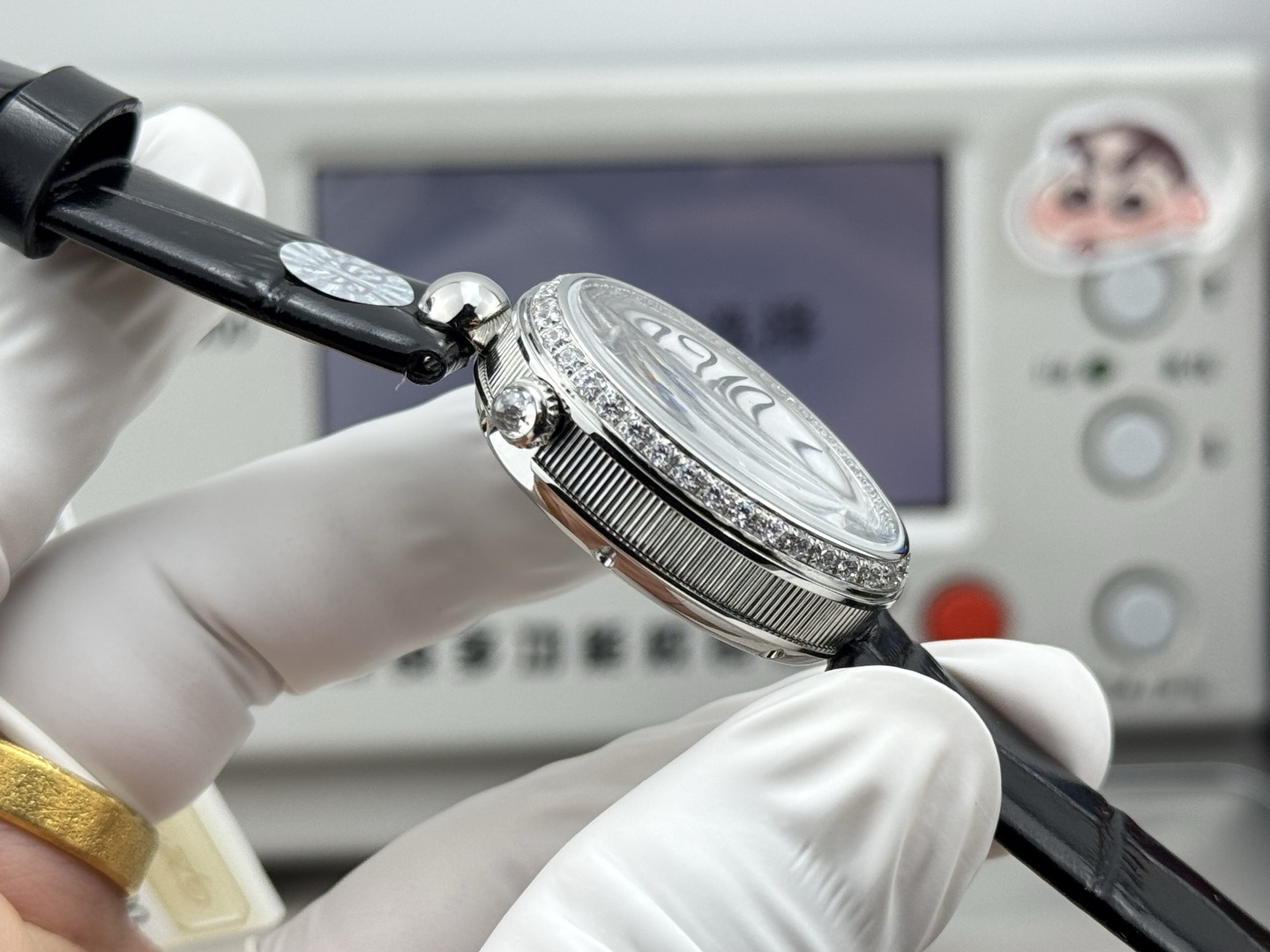 時計ケースは控えめな33 x 25ミリメートルで、豪華なオリジナルを思わせる優雅なオーバル形状を採用しています。ケースはコインエッジデザインで装飾され、117個のスワロフスキークリスタルが約0.99カラットのベゼルに埋め込まれています。約0.26カラットの梨形クリスタルが時計の頂部を飾り、その魅力を一層引き立てています。