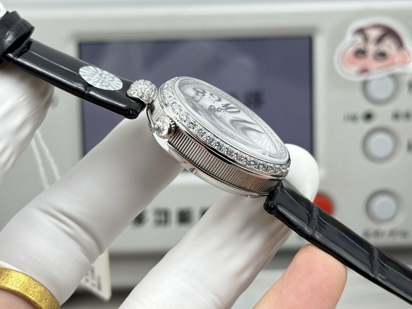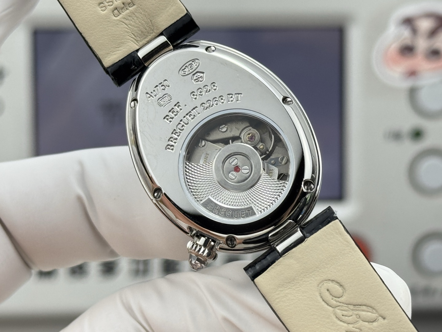 GRのブレゲレプリカは、33 x 25ミリメートルという洗練されたオーバルケースを備え、控えめな贅沢の象徴となっています。そのコインエッジケースはクラシックなヨーロッパの優雅さを醸し出し、より一般的なデザインとは一線を画しています。合計約0.99カラットの117個のスワロフスキークリスタルが埋め込まれたベゼルとケースは、豪華さを放っています。さらに、クラウンには約0.26カラットの単一の洋梨型クリスタルが特徴です。