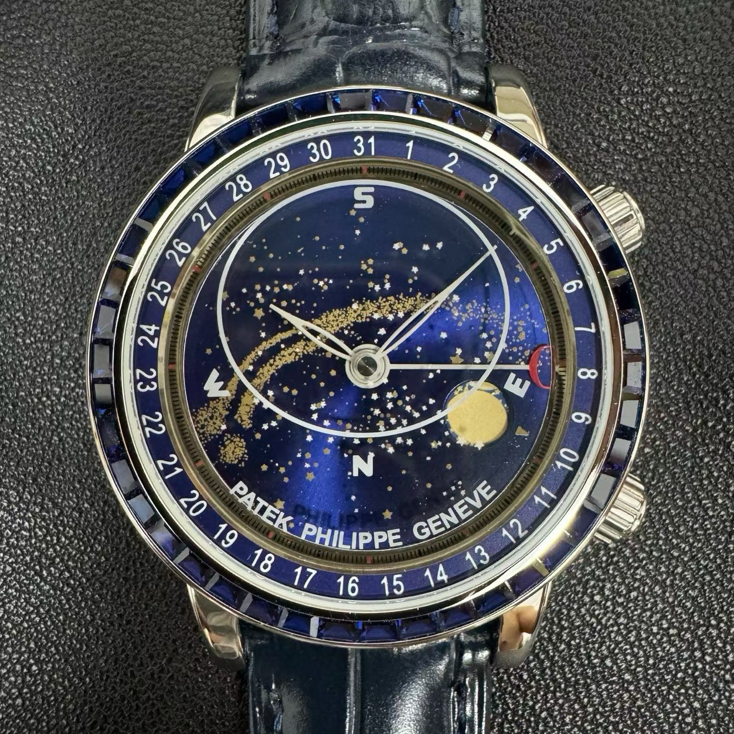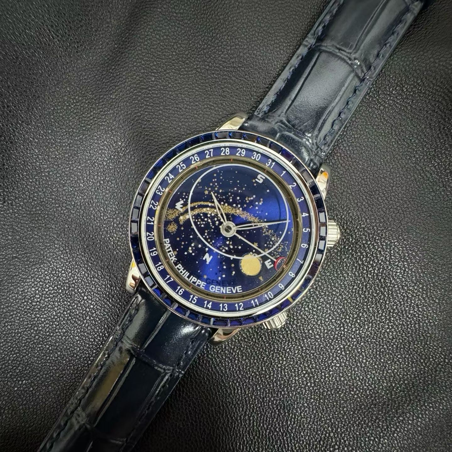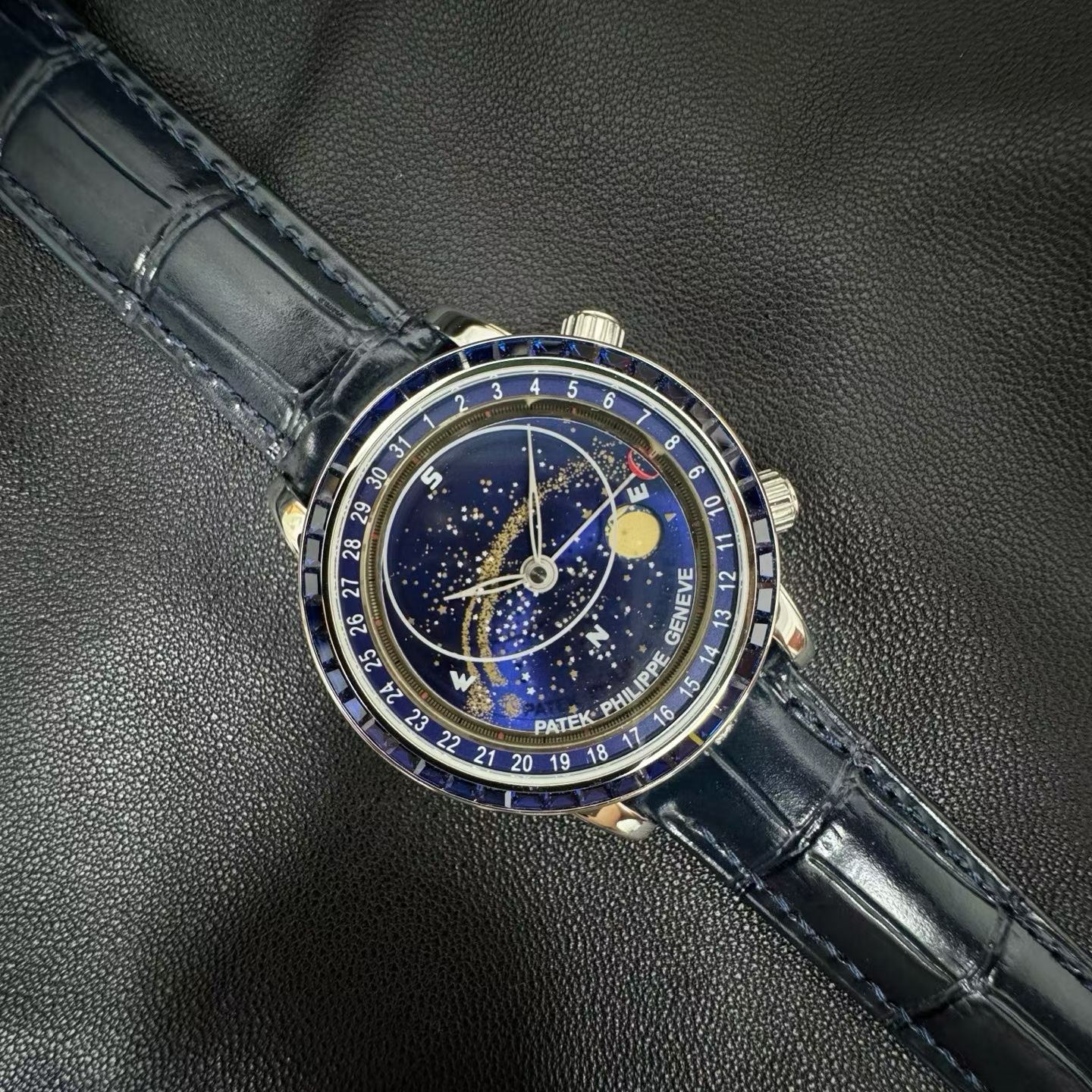 PP-6104Pは単なる時計ではなく、天文ショーそのものです。直径42.5mm、厚さ10mmのケースには、ジュネーブ上空の夜空を表示する見事な天体図が収められています。文字盤にはエナメル製のムーンフェイズ表示があり、月の輝きとその満ち欠けの流動的な動きを捉えています。このレベルの細部は、2年にわたる丹念な職人技によって達成され、ベゼルには45個の輝く宝石、クラスプには28個の宝石が埋め込まれ、時計全体を豪華なオーラで包み込みます。