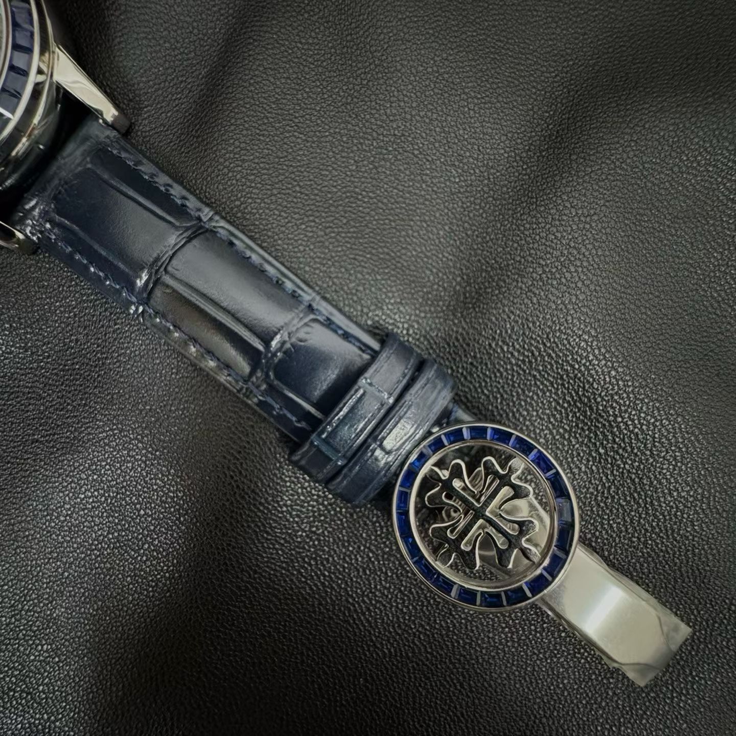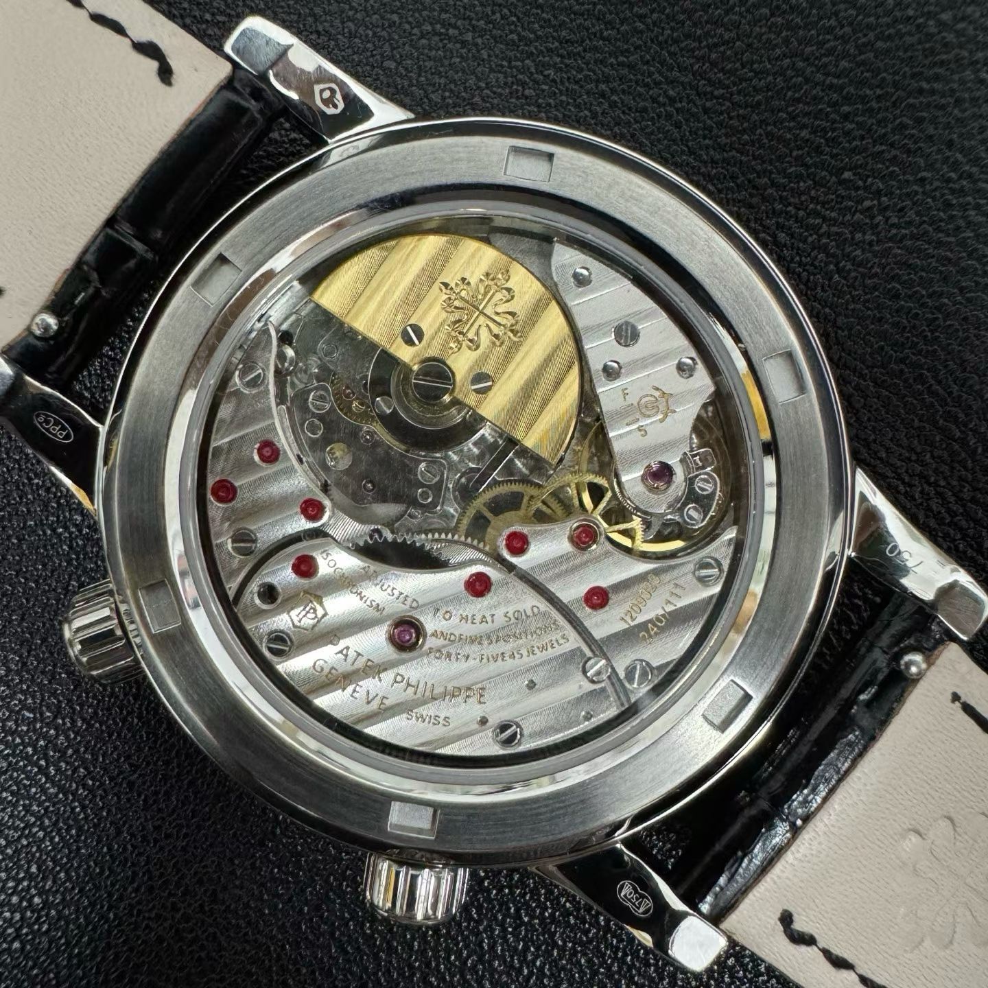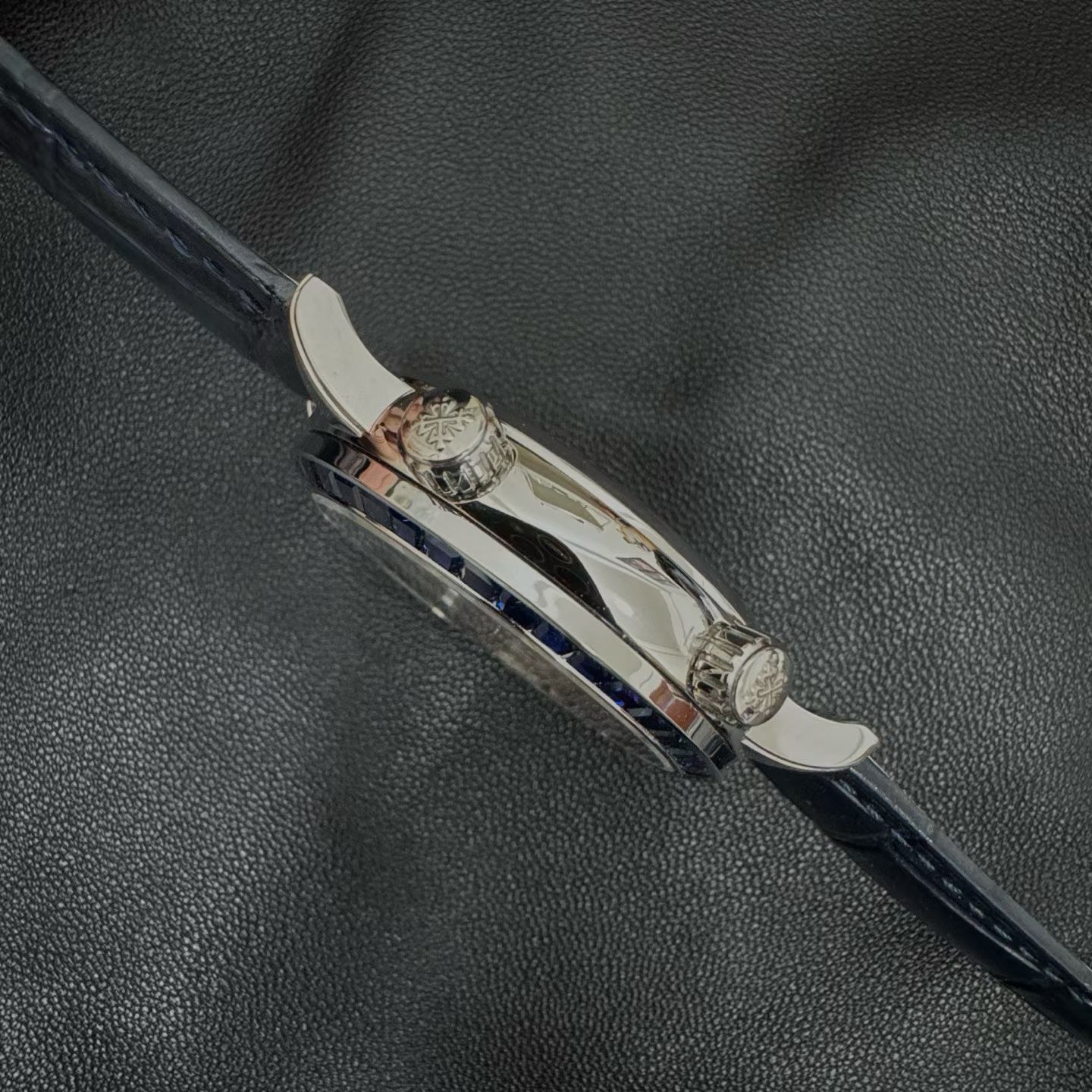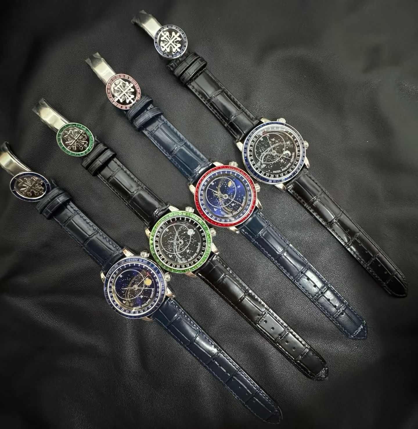 PP-6104Pは単なる時計ではなく、天文ショーそのものです。直径42.5mm、厚さ10mmのケースには、ジュネーブ上空の夜空を表示する見事な天体図が収められています。文字盤にはエナメル製のムーンフェイズ表示があり、月の輝きとその満ち欠けの流動的な動きを捉えています。このレベルの細部は、2年にわたる丹念な職人技によって達成され、ベゼルには45個の輝く宝石、クラスプには28個の宝石が埋め込まれ、時計全体を豪華なオーラで包み込みます。