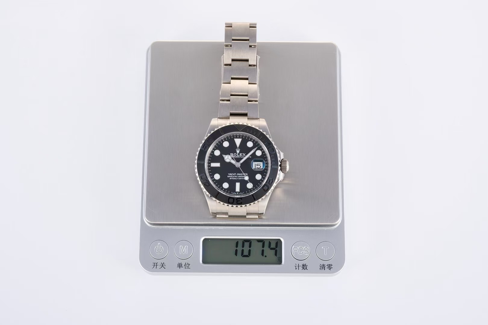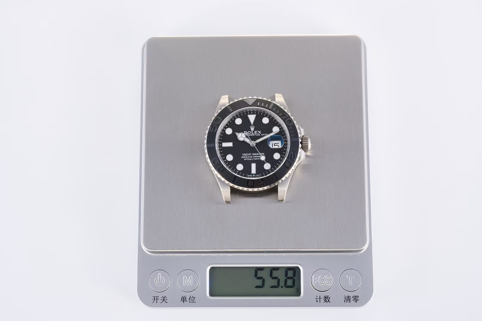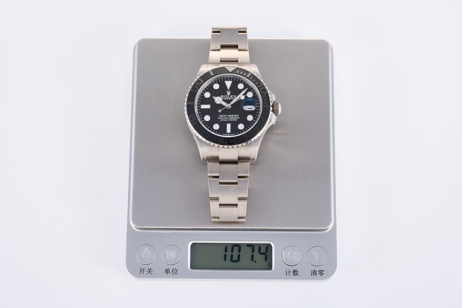新しいヨットマスターのRLXグレードのチタン構造は、素材使用の大きな転換点を示しています。わずか107グラムの重量は、耐久性を損なうことなく羽のような装着感を提供します。航空宇宙グレードのチタンは、優れた強度と耐腐食性を備え、オリジナルに匹敵する長寿命と耐久性を保証します。ケースの曲線と面は高強度のブラッシング処理が施され、伝統的なモデルの輝きに匹敵する仕上げを実現しています。面取りされたエッジの細部にまでこだわった職人技は、真のロレックスモデルと見分けがつかない金属光沢を表現しています。