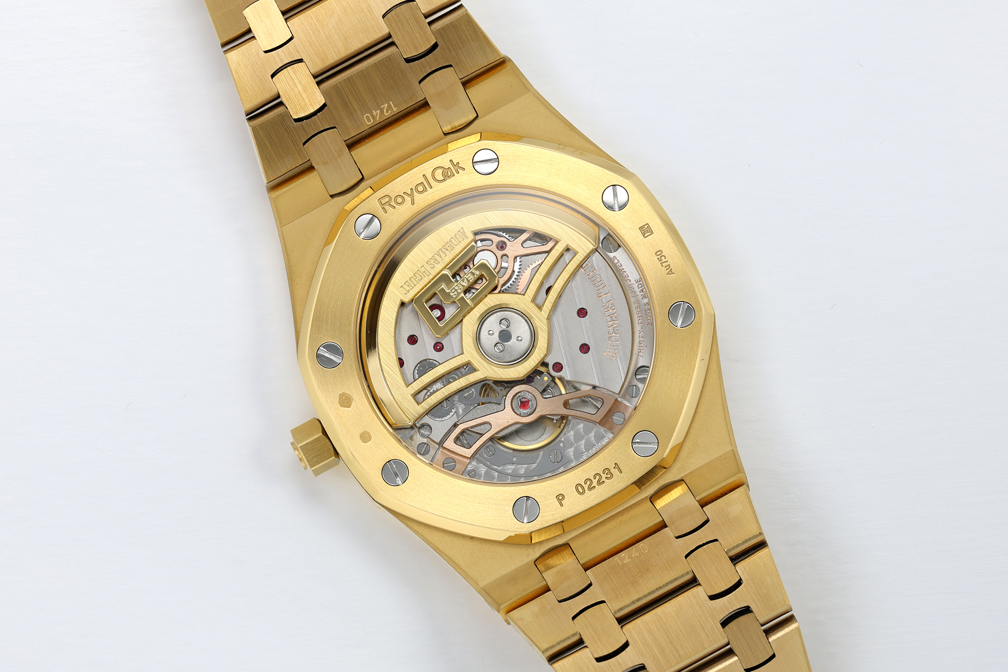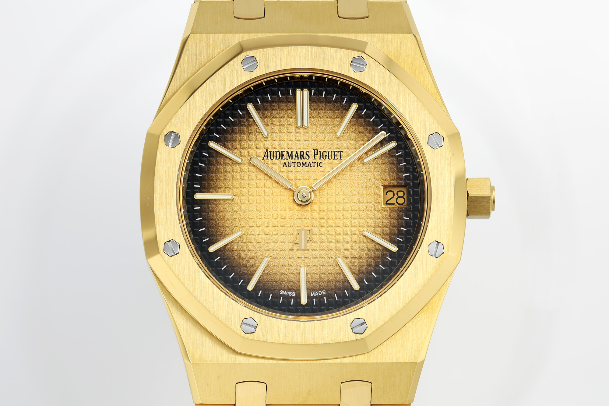 16202BAの魂は、その文字盤に宿っています。放射状の中心から深いインク色の周縁へと移行する独特のスモークゴールドグラデーションが特徴で、黄昏に沈む夕日のように印象的です。この効果は「プティ・タペスリー」パターン—深みと興味を引き出すテクスチャーの格子模様—によって強化されています。金の蛍光時刻表示とロイヤルオークの針は、昼夜を問わず視認性を確保し、実用性と美しさを兼ね備えています。文字盤はシンプルさとディテールのバランスを取り、6時位置のAPロゴと3時位置の日付窓がブランドのデザインの熟練を示しています。
