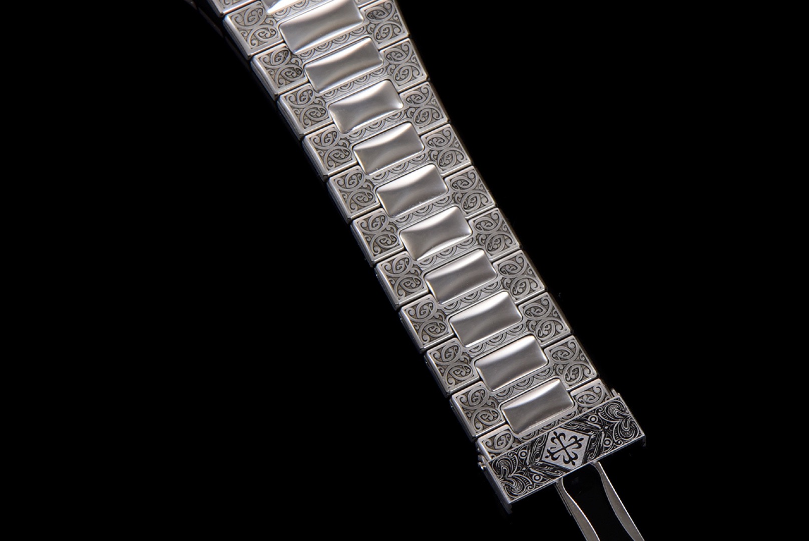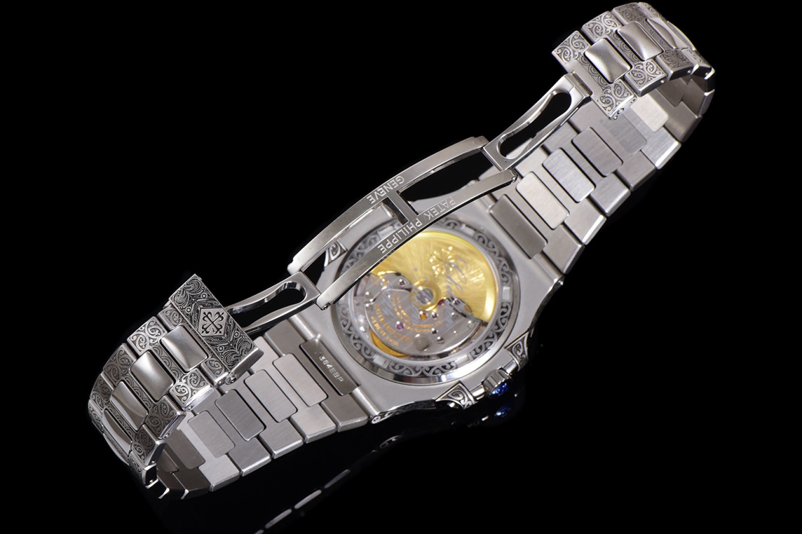 ブランドの完璧を追求する姿勢を称える形で作られたRef. 5711/1500Aは、ニュージーランドのマオリ文化を反映した手彫りのスチールケースでその特異性を際立たせています。ノーチラスシリーズの中で唯一、この複雑な彫刻が施されたケースを持つこのモデルは、前例のない美的基準を打ち立てています。40mmのスチールケースは、厚さわずか8.3mmで、クラシックな12角形のベゼルデザインを継承しています。ラグから一体化したブレスレットに至るまで、すべての表面に手彫りのモチーフが施され、深みのあるグレーダイヤルと鮮やかで調和のとれたコントラストを生み出しています。