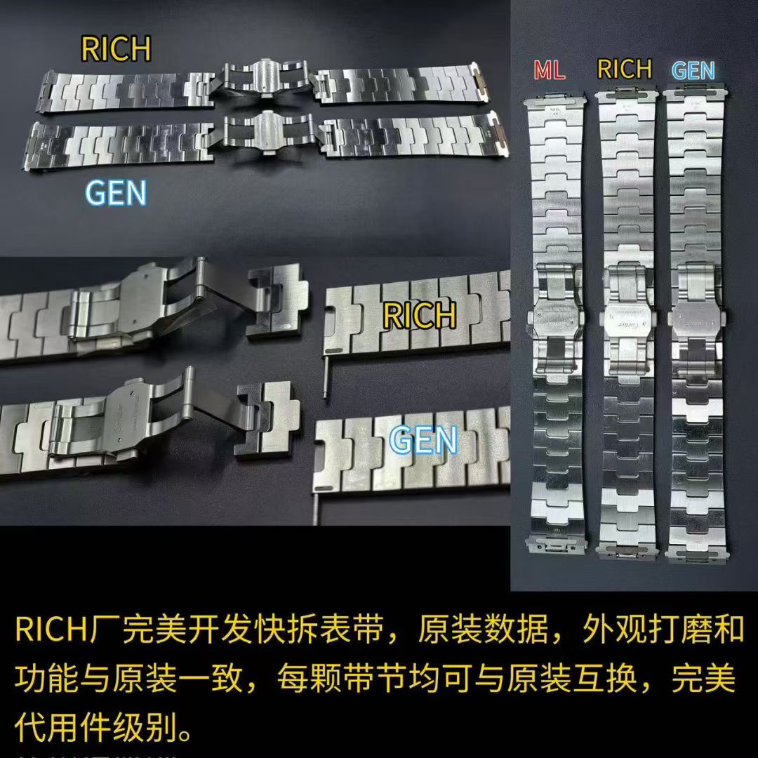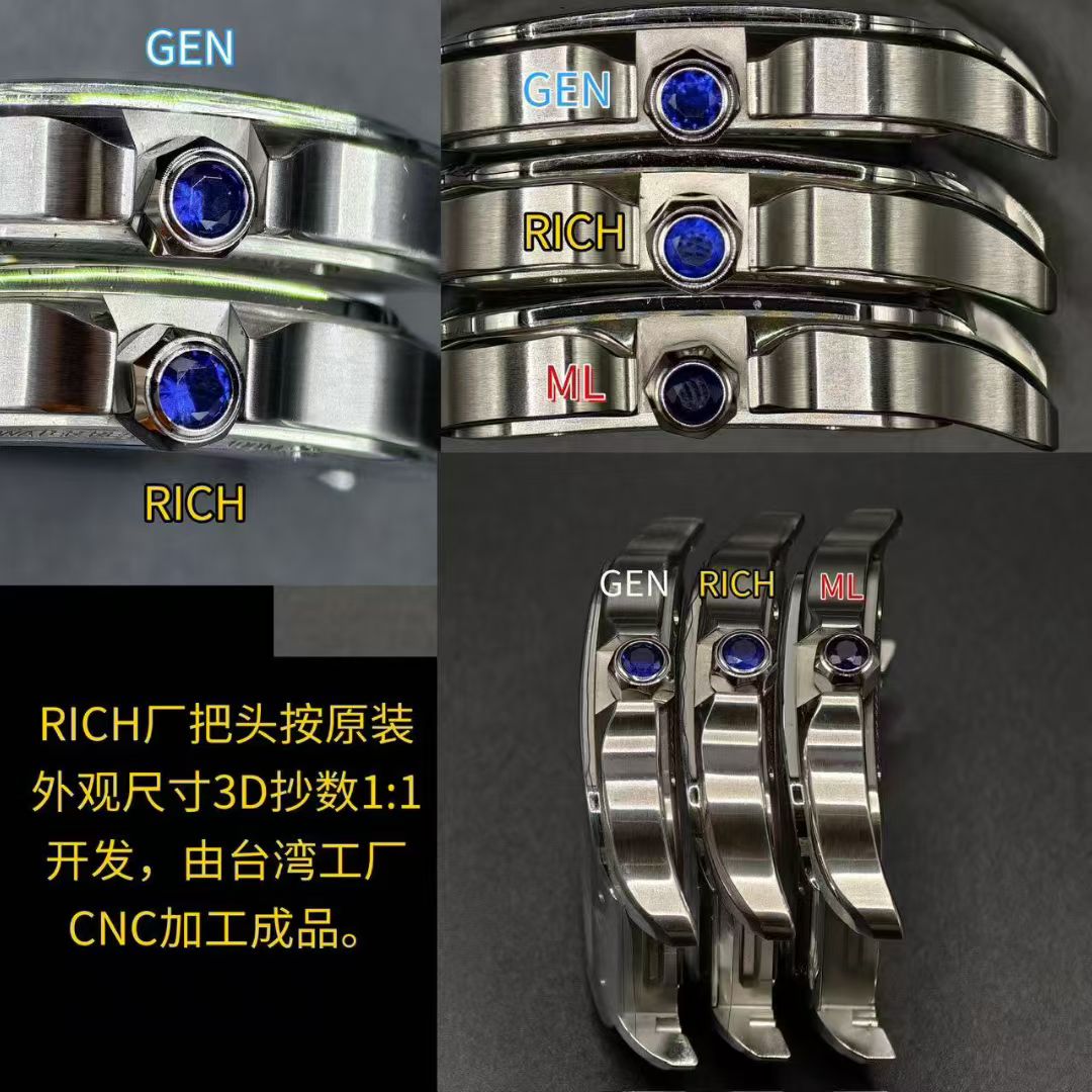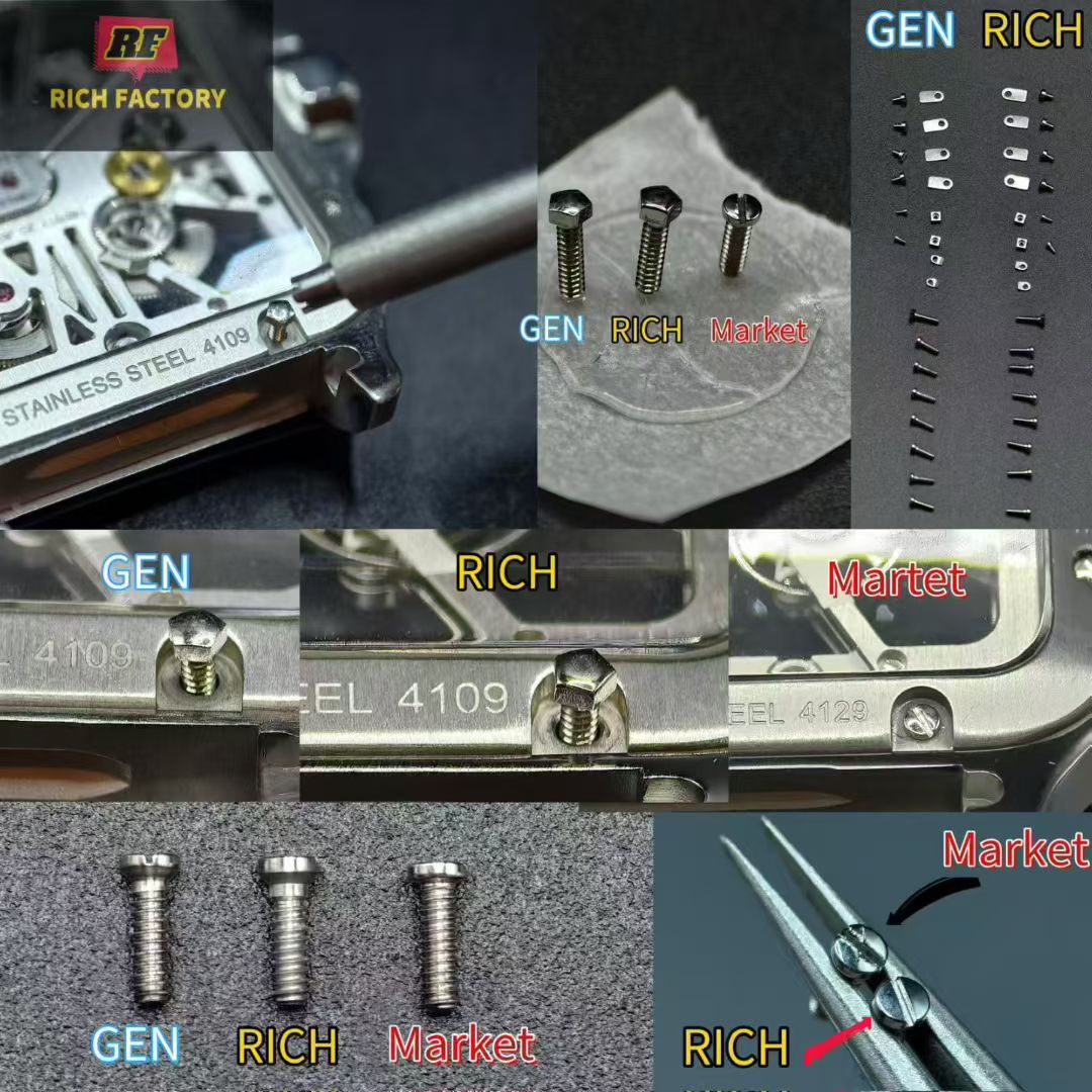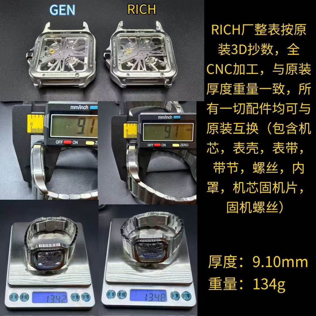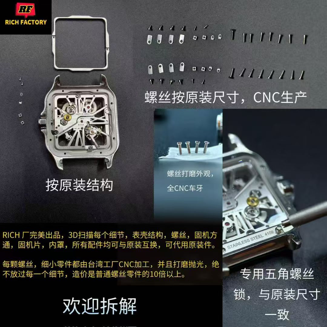 RICH Factoryのアプローチは、細部に至るまで精密に再現することを目指し、3Dスキャン技術を採用しています。この真正性へのこだわりは表面的なものに留まらず、時計の核心部であるメカニズムにまで及んでいます。WHSAシリーズはカルティエのオリジナル9611MCムーブメントの1:1再現を実現しており、その技術的な力量を物語っています。このレベルのエンジニアリングは、オリジナルのカルティエ部品との互換性を可能にし、ムーブメントからケース、ブレスレットリンクに至るまでCNC加工され、オリジナルと同じ質感や機能性を提供します。
