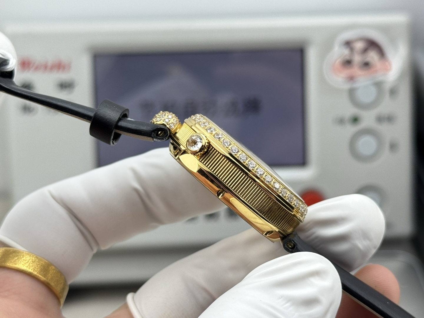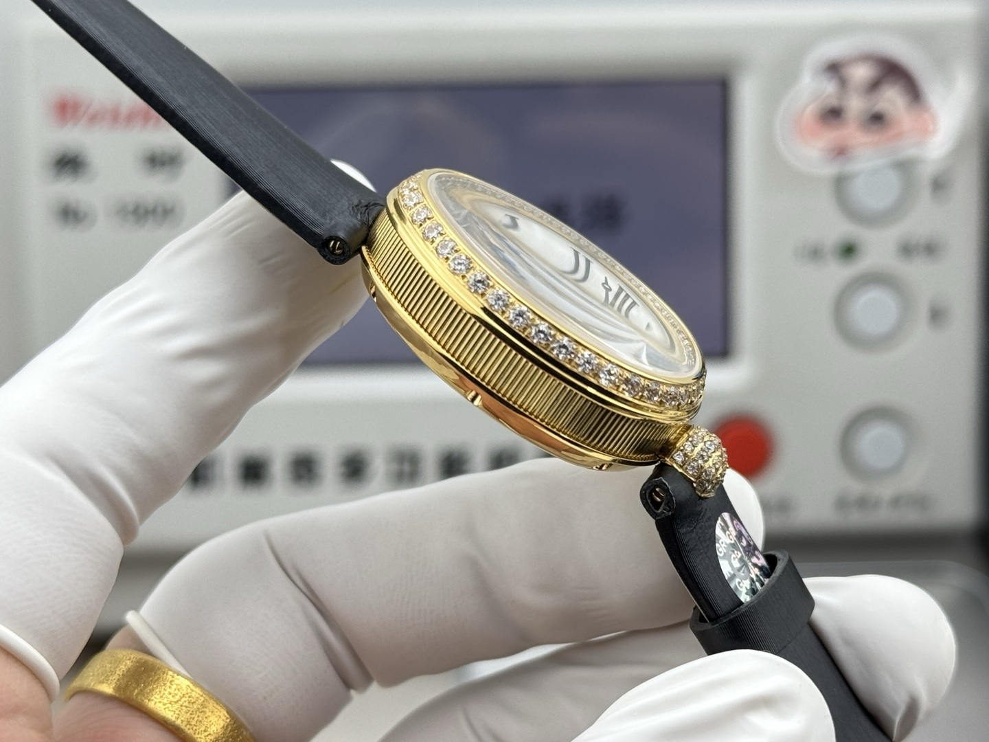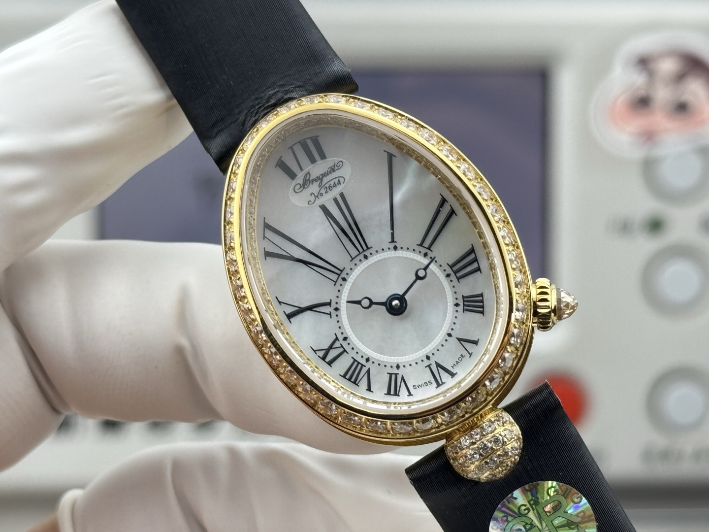 ケースサイズは33 x 25 mmと小ぶりで、卵型のコインエッジの外観が古典的なブレゲの洗練を捉えています。合計117個、約0.99カラットのスワロフスキークリスタルがベゼルとケースを飾ります。また、王冠には洋梨型のクリスタルが0.26カラット加えられ、この豪華な構成をさらに引き立てます。