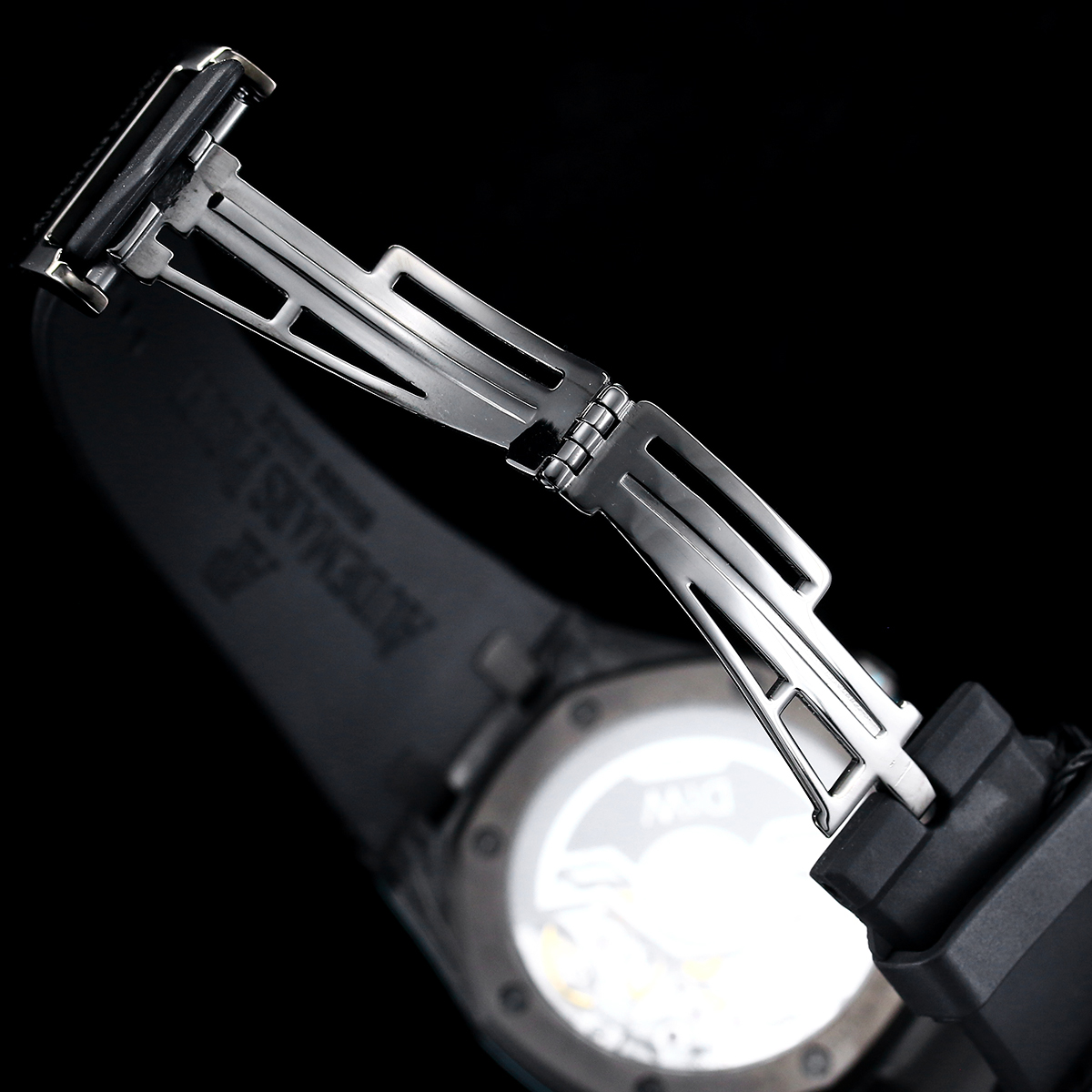 VOIDLINE APコレクションのロイヤル オーク 15500は、時、分、中央秒針、日付機能を備えた自社製ムーブメントCaliber 4302で駆動されます。この時計は約70時間の大容量パワーリザーブを誇り、軽量であることが性能を犠牲にしないことを示しています。素材選択へのこだわりは、41mmのカーボンファイバーケース、黒のDLCコーティングが施されたベゼルとケースバックにまで及び、現代的でありながら時を超えた魅力を放っています。ラバーストラップと黒のDLCコーティングが施されたクラスプは、快適さと耐久性を保証します。