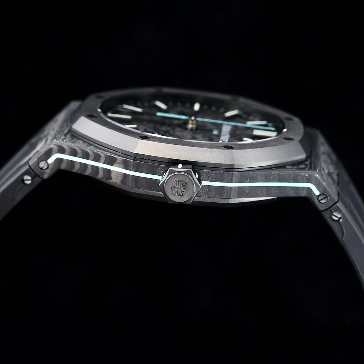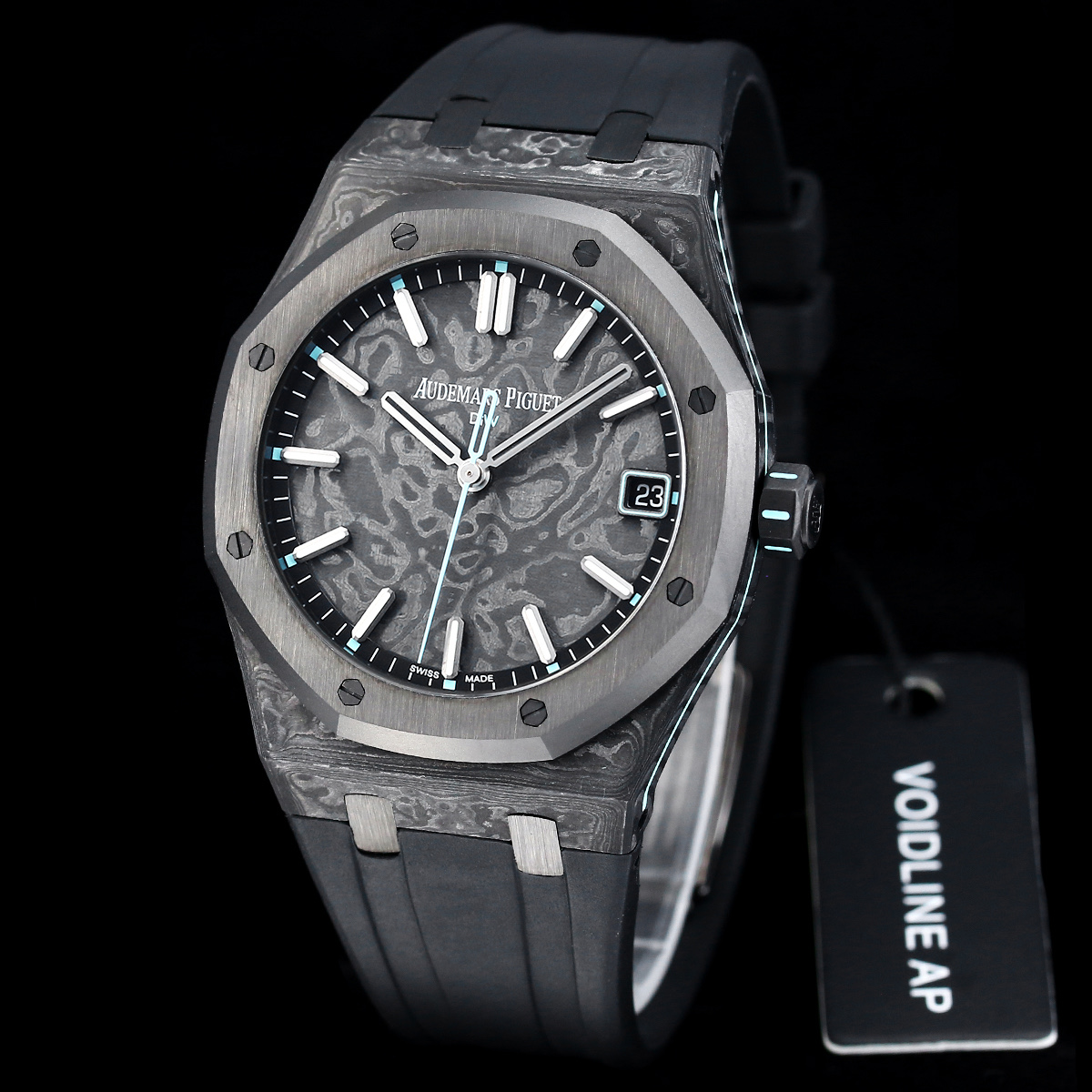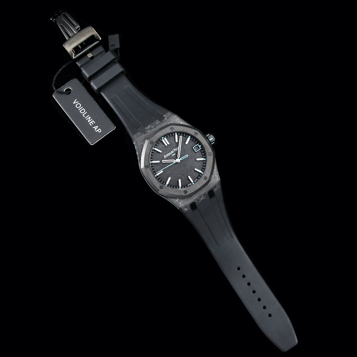 VOIDLINE APシリーズの中心には、最先端の素材と前衛的なデザインを通して再構築されたロイヤル オーク 15500があります。このシリーズは単なる時計ではなく、アウデマ ピゲの象徴的なデザイン言語を失うことなく、伝統的な重量を排し、体験を提供します。その魔法は素材にあります。カーボンファイバーは、その強度と羽のように軽い特性で知られており、この時計の基盤を形成し、わずか85グラムの重さを実現しています。