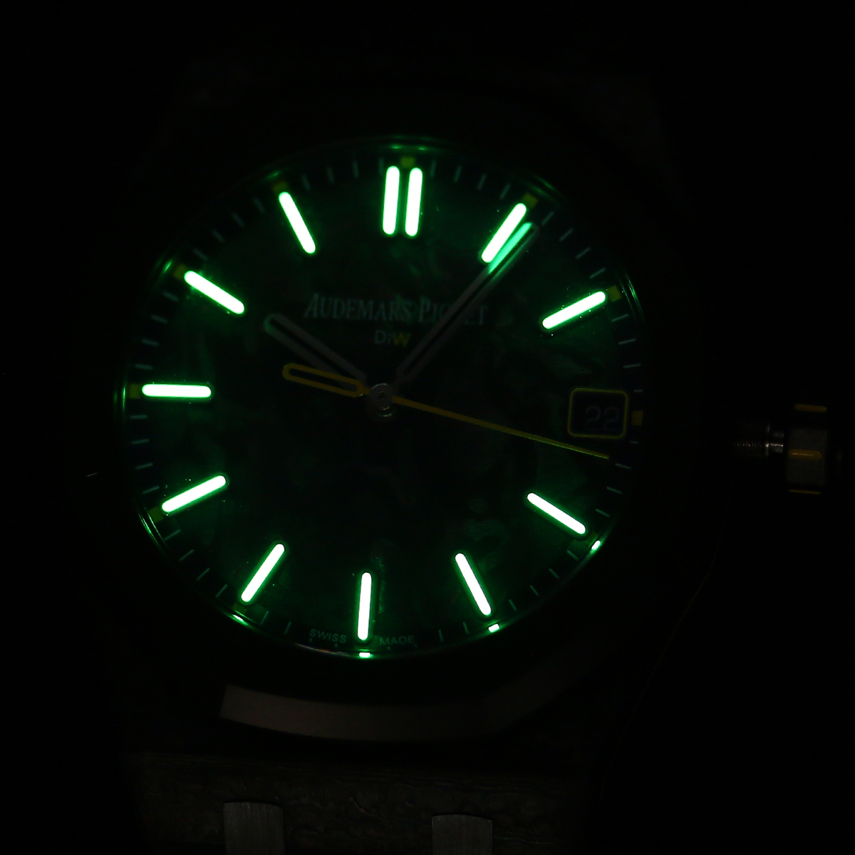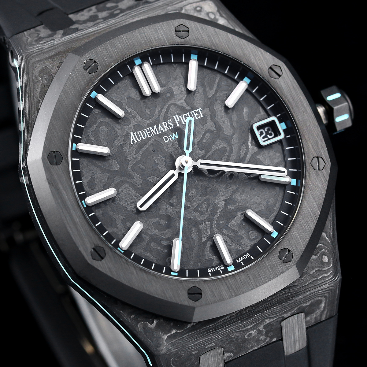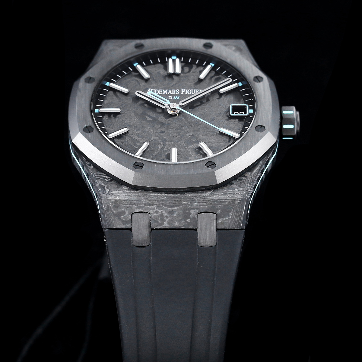 VOIDLINE APシリーズの中心には、最先端の素材と前衛的なデザインを通して再構築されたロイヤル オーク 15500があります。このシリーズは単なる時計ではなく、アウデマ ピゲの象徴的なデザイン言語を失うことなく、伝統的な重量を排し、体験を提供します。その魔法は素材にあります。カーボンファイバーは、その強度と羽のように軽い特性で知られており、この時計の基盤を形成し、わずか85グラムの重さを実現しています。