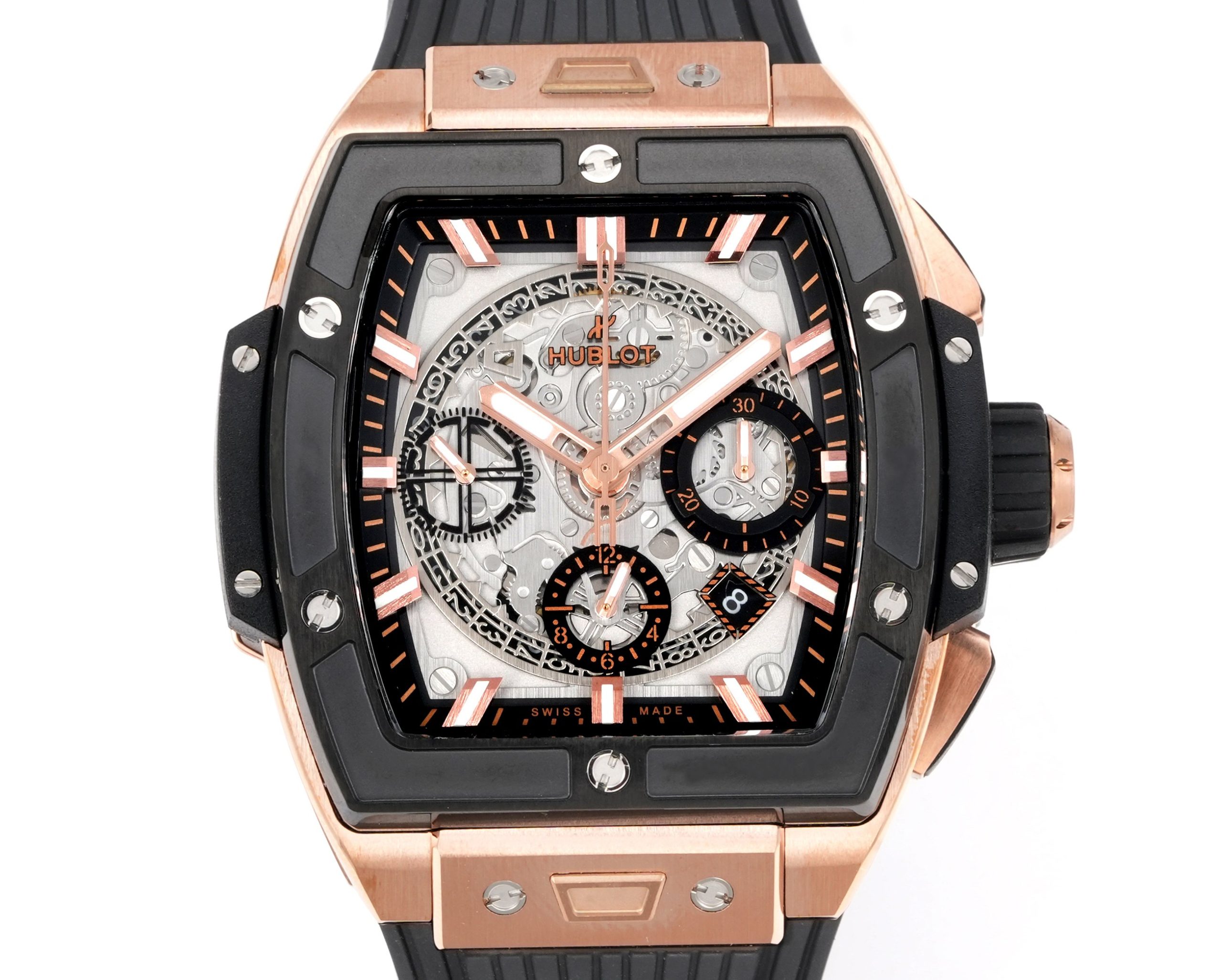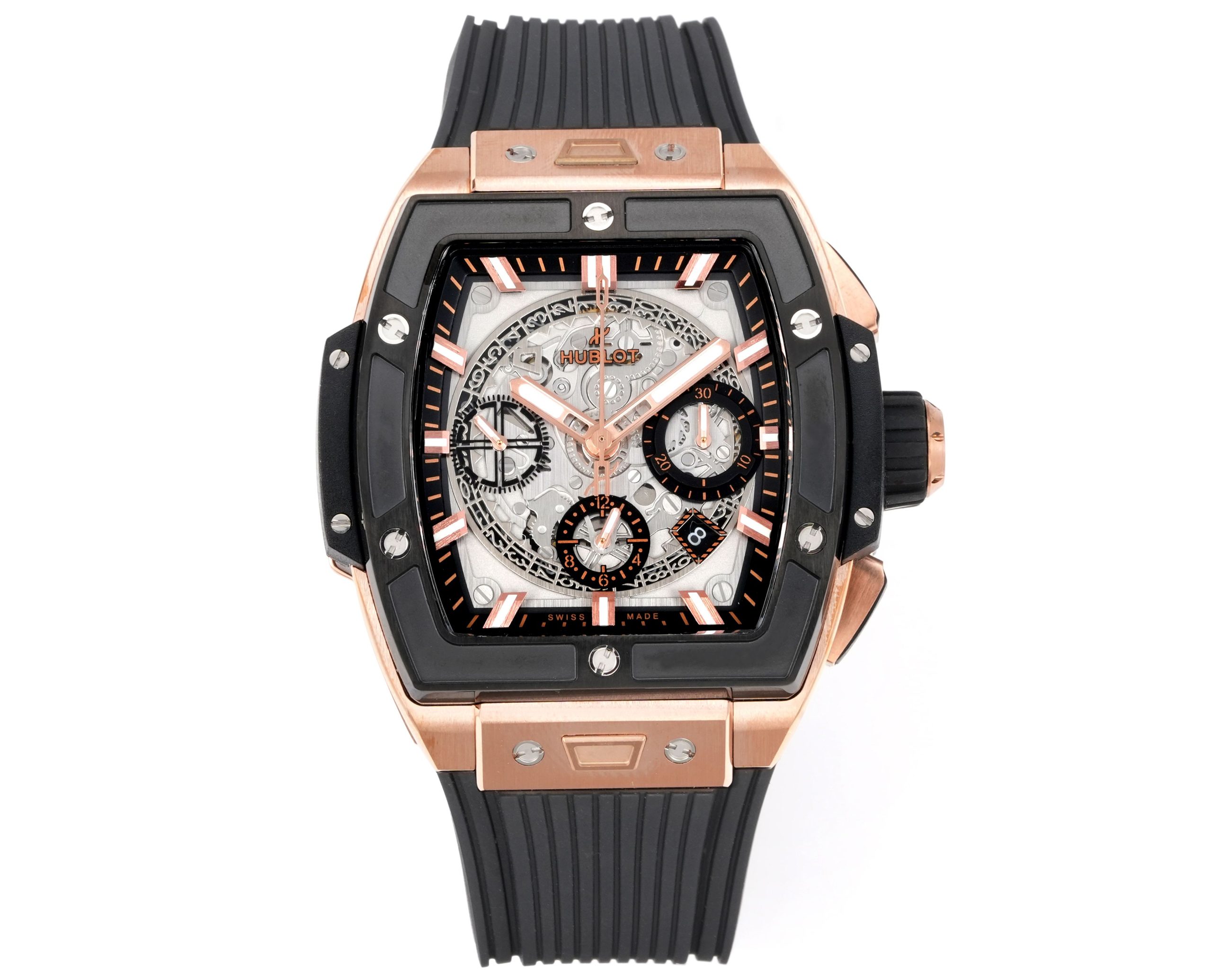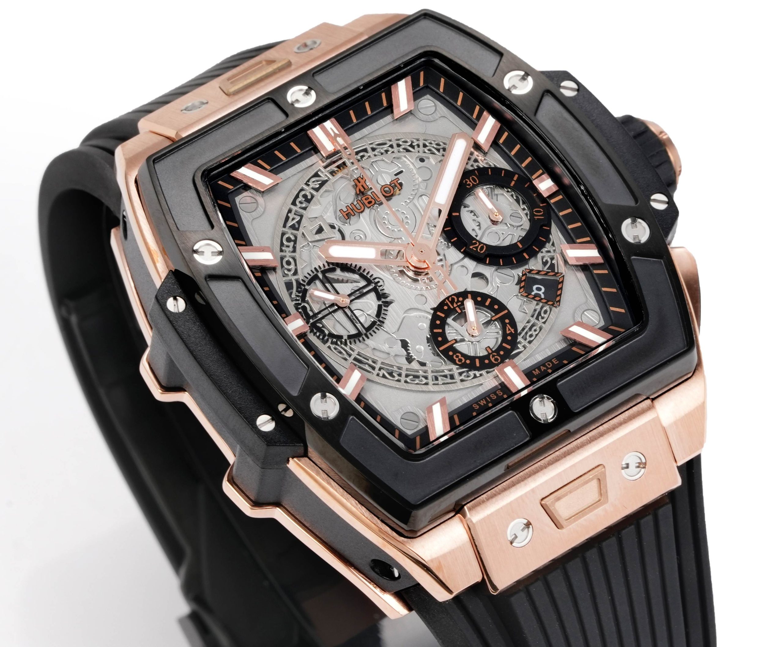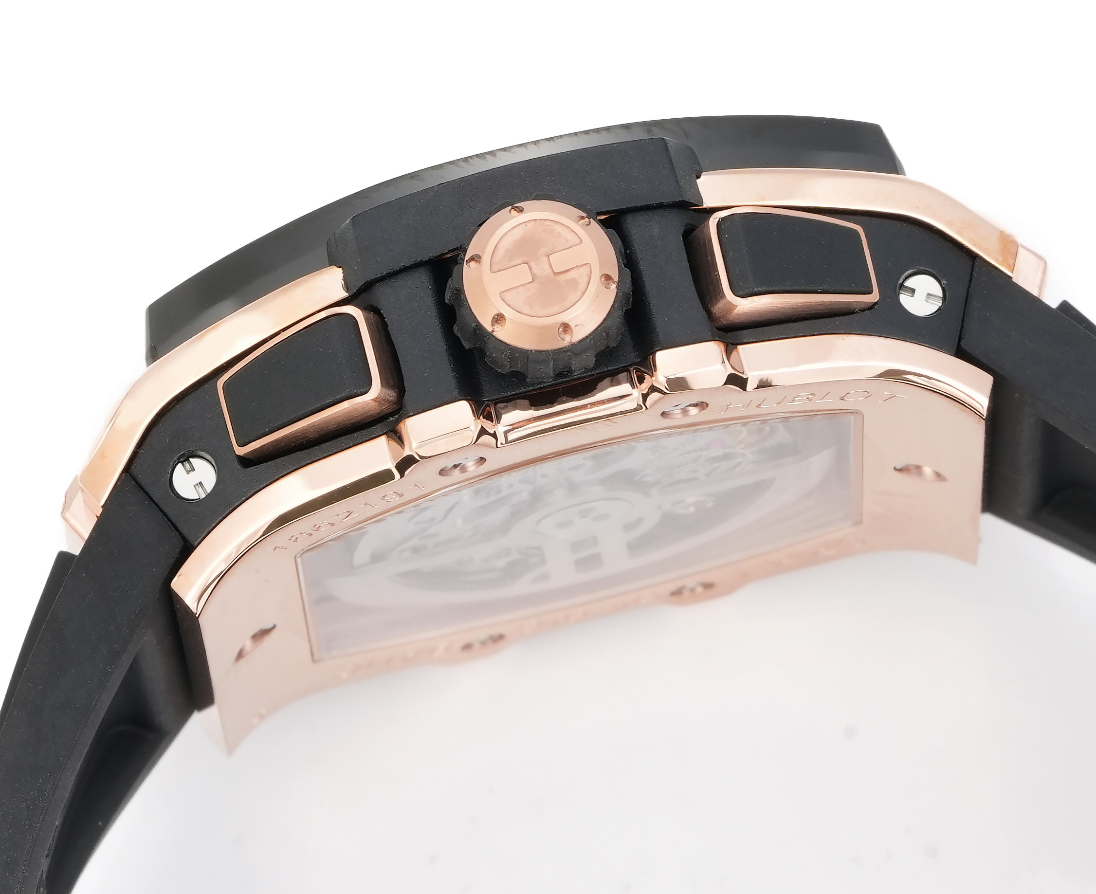 ウブロ スピリット オブ ビッグバンは、伝統的な丸型時計のデザインの中で際立つユニークなバレル型ケースを特徴としています。チタンと樹脂の融合から作られたこのケースは、6本のH型ネジで強化された「サンドイッチ」構造を採用しています。このデザインは、ウブロの革新への取り組みを強調するだけでなく、異なる素材と技術を融合させて何か特別なものを生み出すという「融合の芸術」の哲学を体現しています。