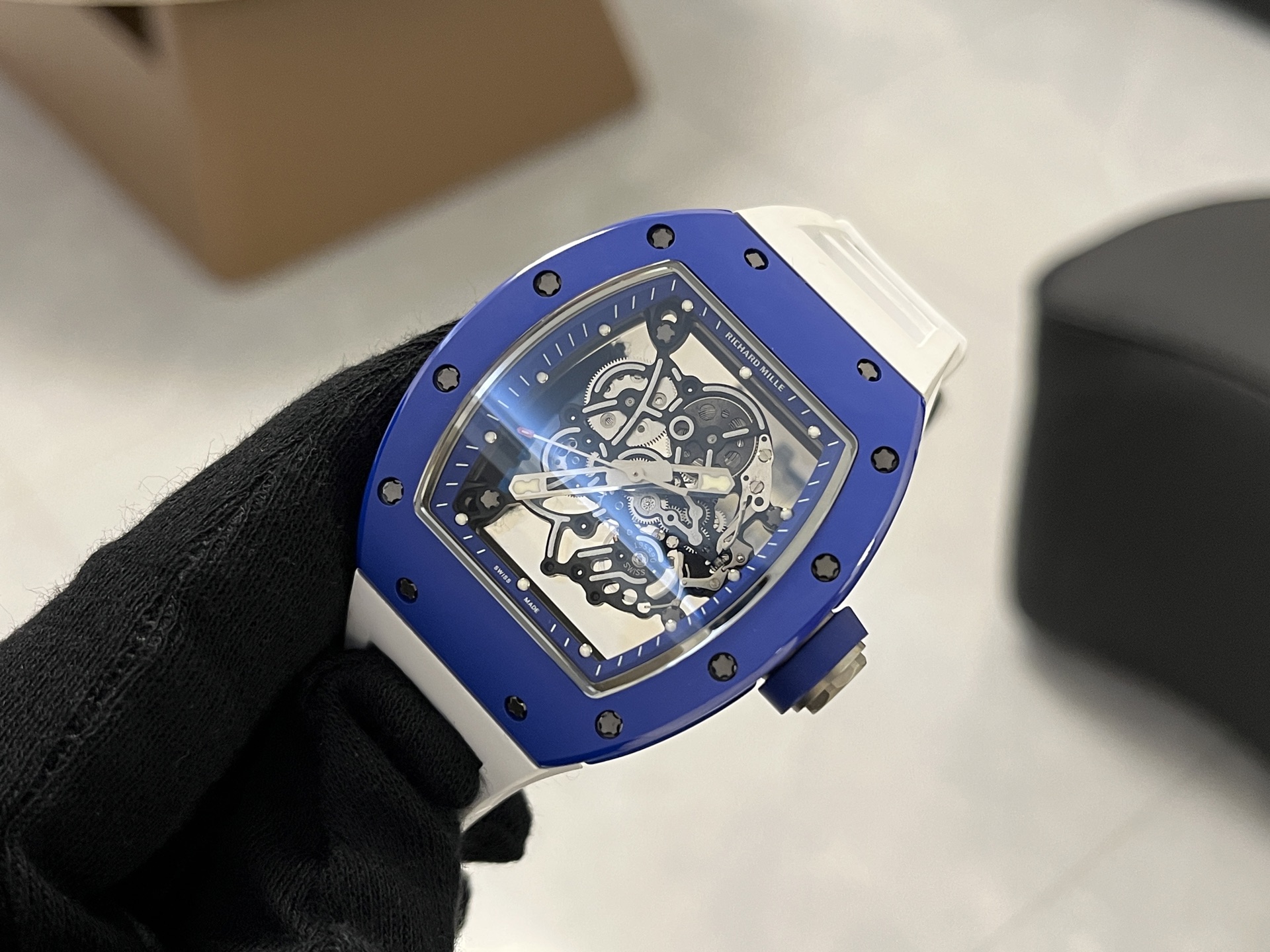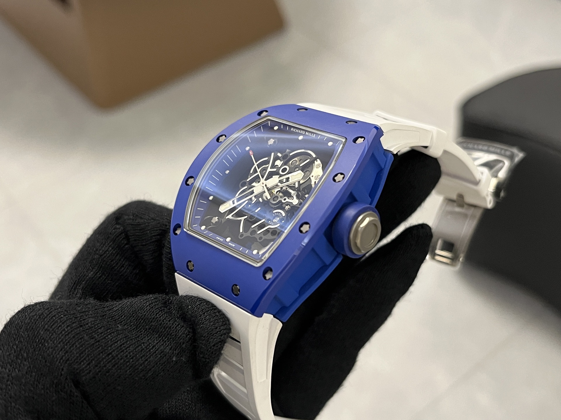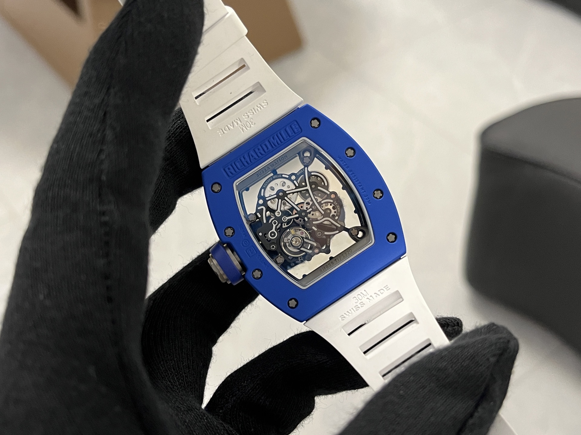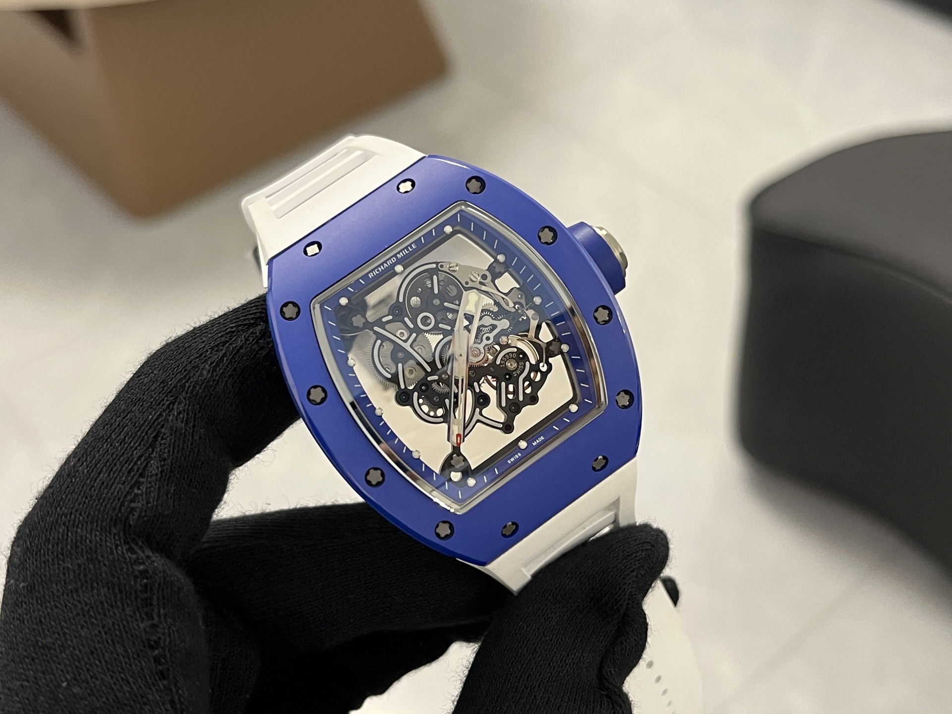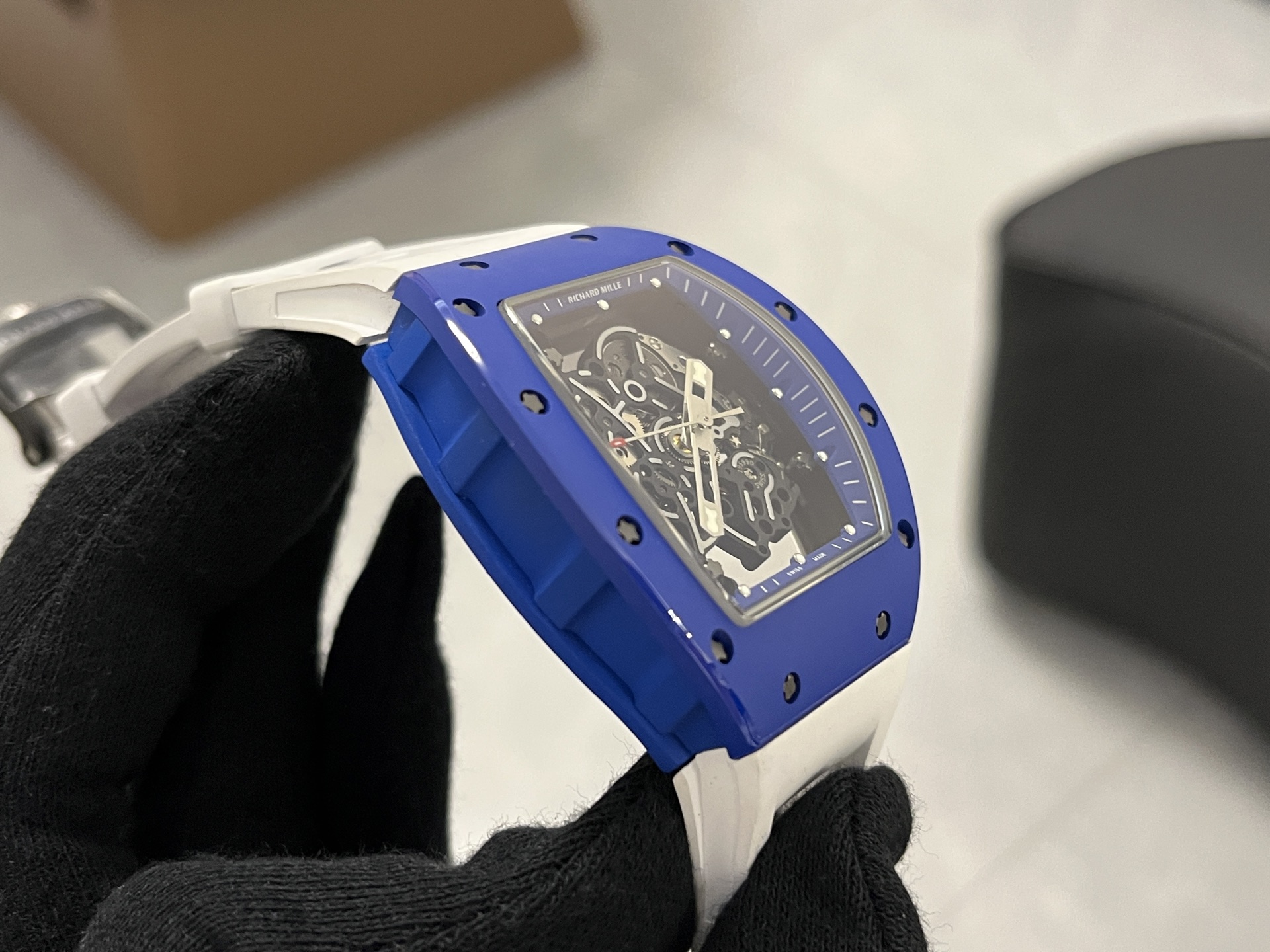 RM055レプリカ時計は、オリジナルのデザイン理念を忠実に反映した黒と白のセラミック素材を使用しています。カーボンファイバー構造は堅牢性を確保しつつ、軽量化を実現しています。ケースの面取り角度やベースカバーの改良における微細な変更は、オリジナルに非常に近づけることに成功し、レプリカの品質へのこだわりを示しています。寸法はオリジナルと全く同じ49.90 x 42.70mm、厚さ13.5mmであり、細部への細心の注意が払われていることを証明しています。