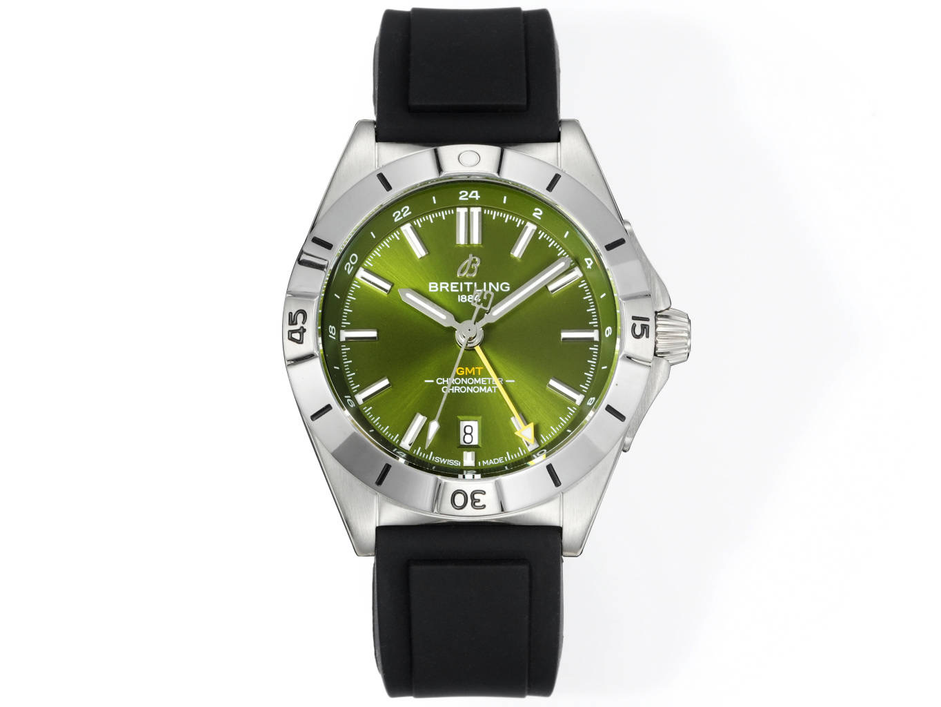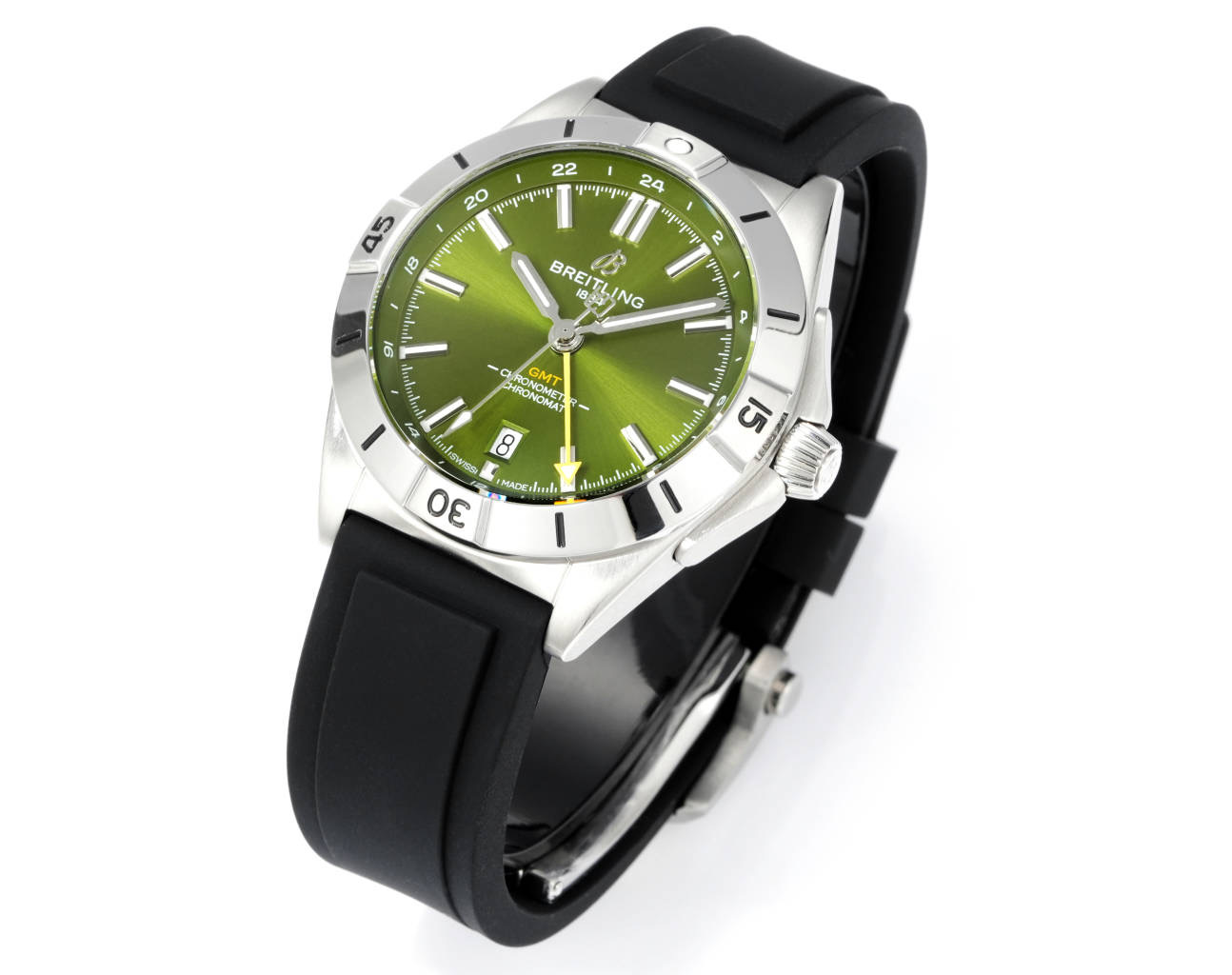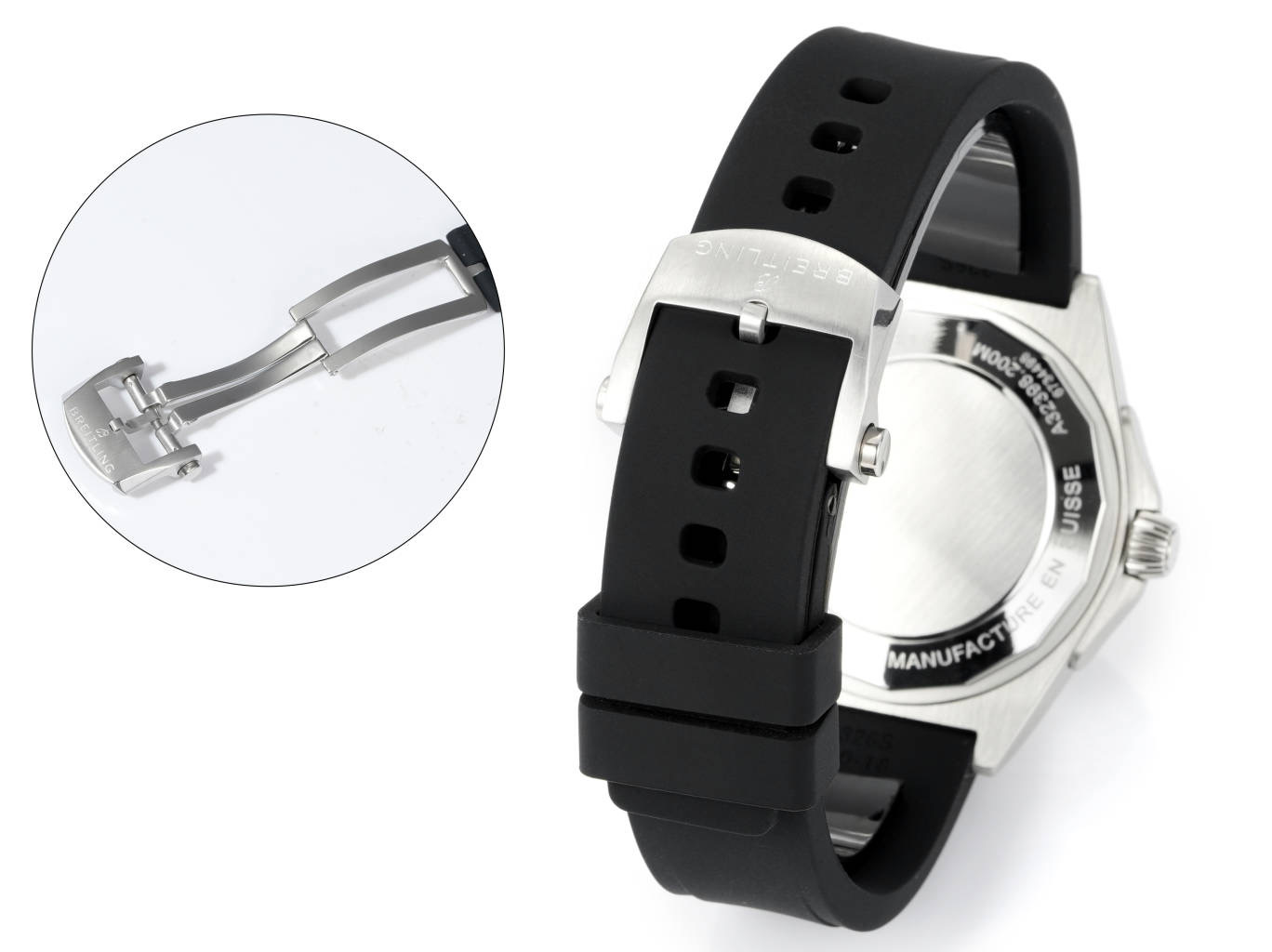 時計の職人技は、精密に設計されたステンレススチールケースから始まります。40mmのサイズは、アジアや中国の手首に適しており、スタイルや存在感を損なうことなく、文化を超えた魅力を抱えています。ケースはさらに、ダブルガスケットを備えたねじ込み式のリューズを持ち、水への耐性に優れた堅牢性を確保しています。この実用的な特徴は、Breitlingの豊かな伝統を反映した象徴的な15分の「ライダータブ」で飾られた一方向回転ベゼルによって補完されています。ラバーストラップの採用は、日常の冒険や国際的な旅において、快適な装着感を提供します。