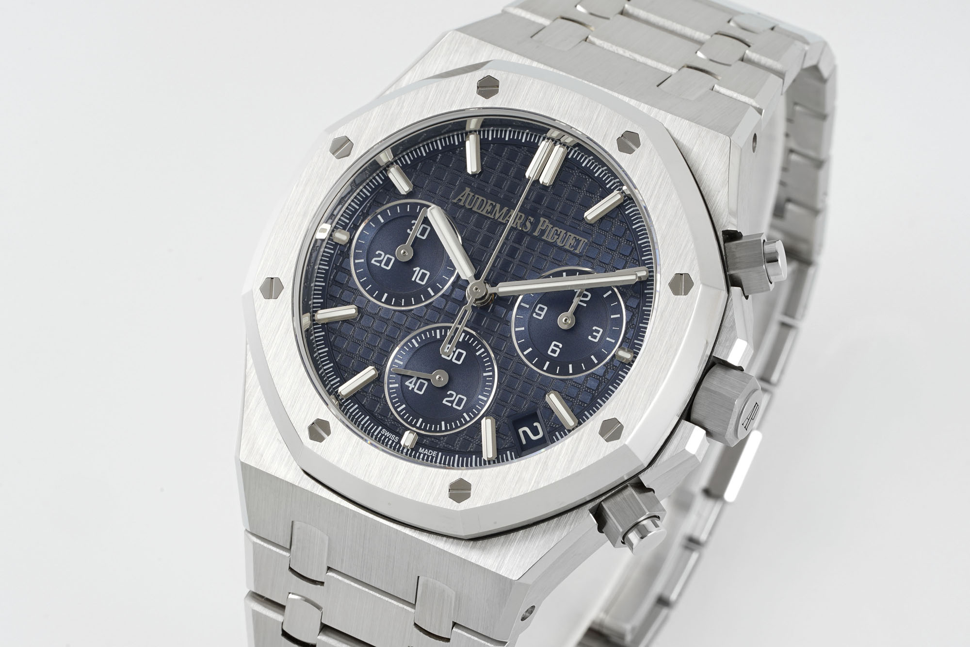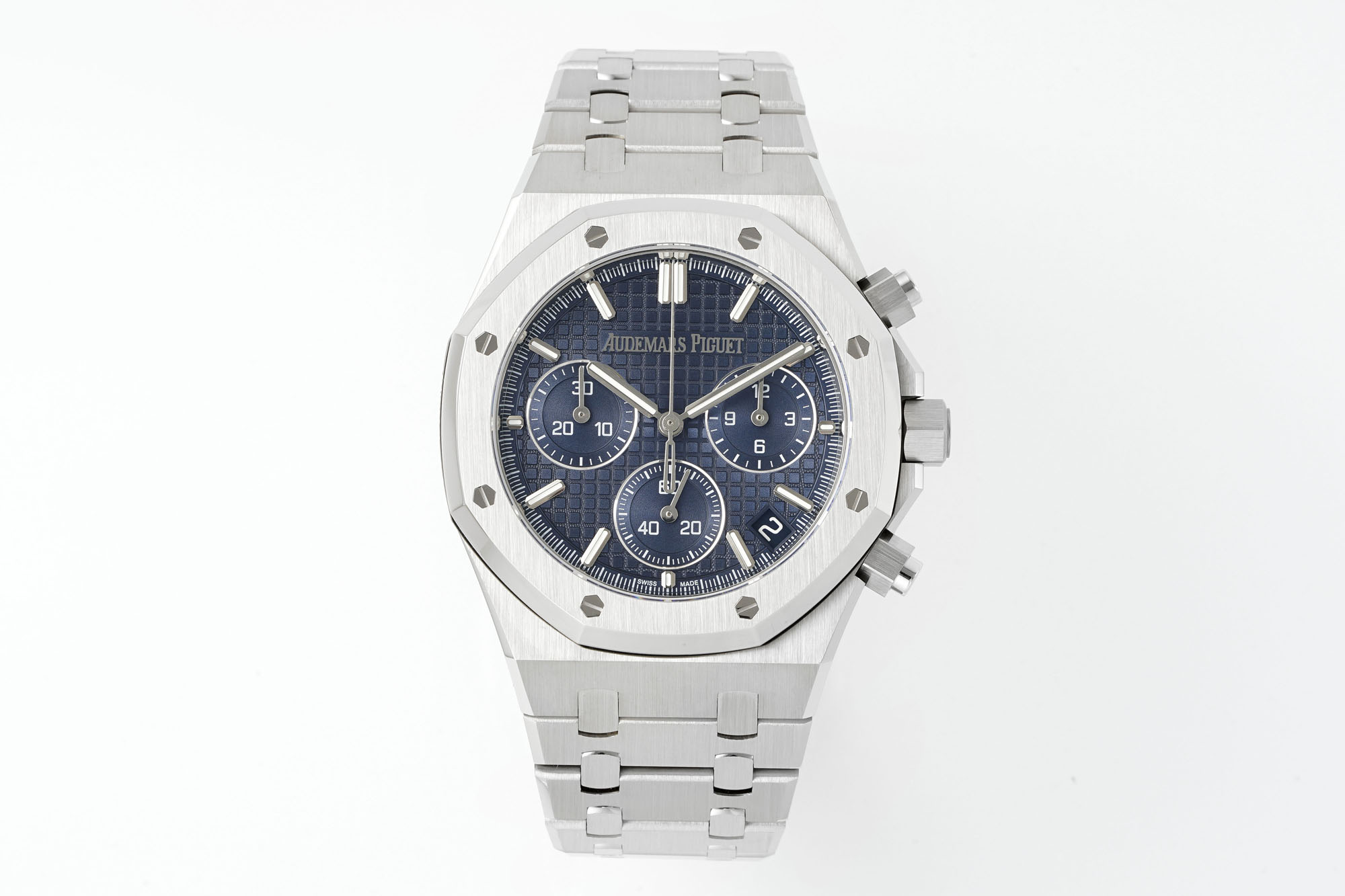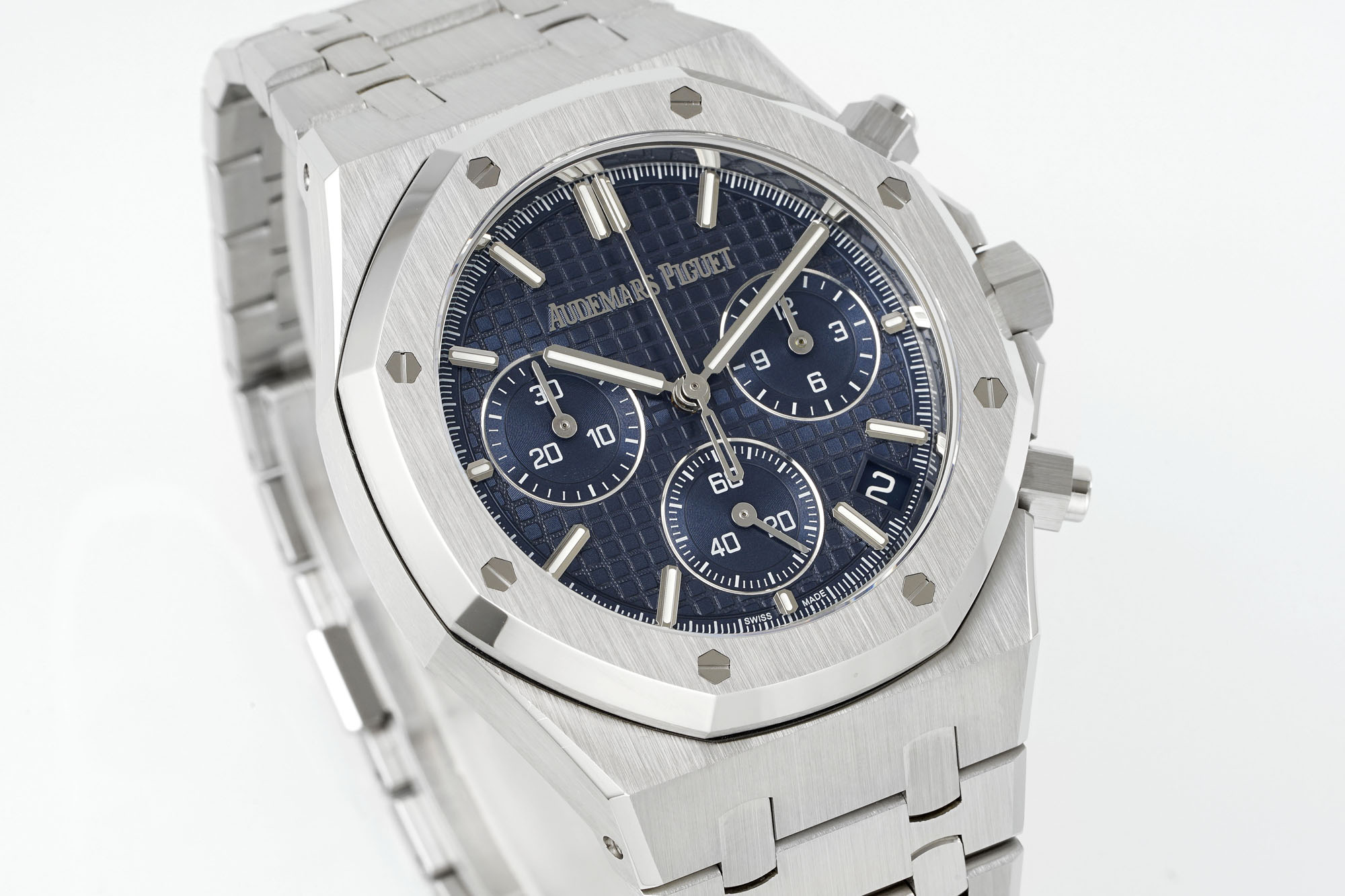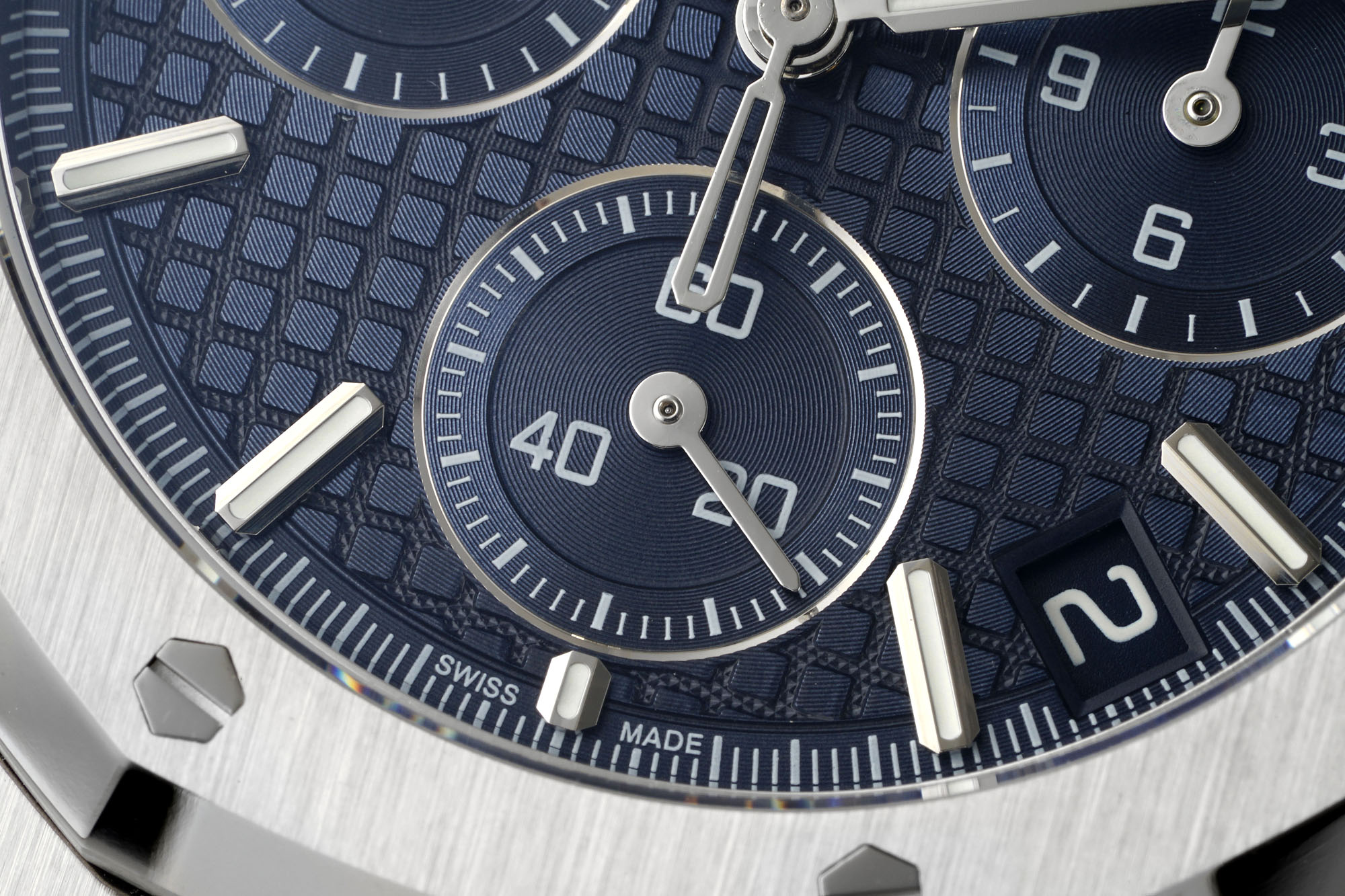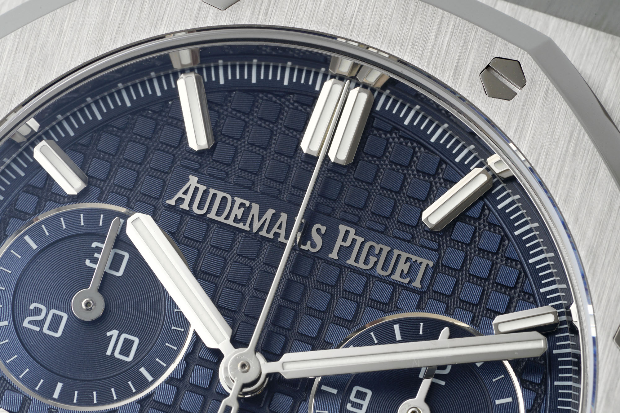 時計の文字盤は、細部への卓越した献身を示しています。ロゴの文字はオリジナルのデザインを反映し、Aの長い足やEの斜めの角度が薄い水平のマークと一致するように丹念に彫られています。オリジナルのワッフルパターンに似た、文字盤の拡大されたグリッド状のテクスチャは同様に調和的で、時計の立体的な魅力を高めます。このような精緻な職人技は、技術的な専門知識を示すだけでなく、ロイヤルオーク系譜の遺産へのコミットメントも反映しています。