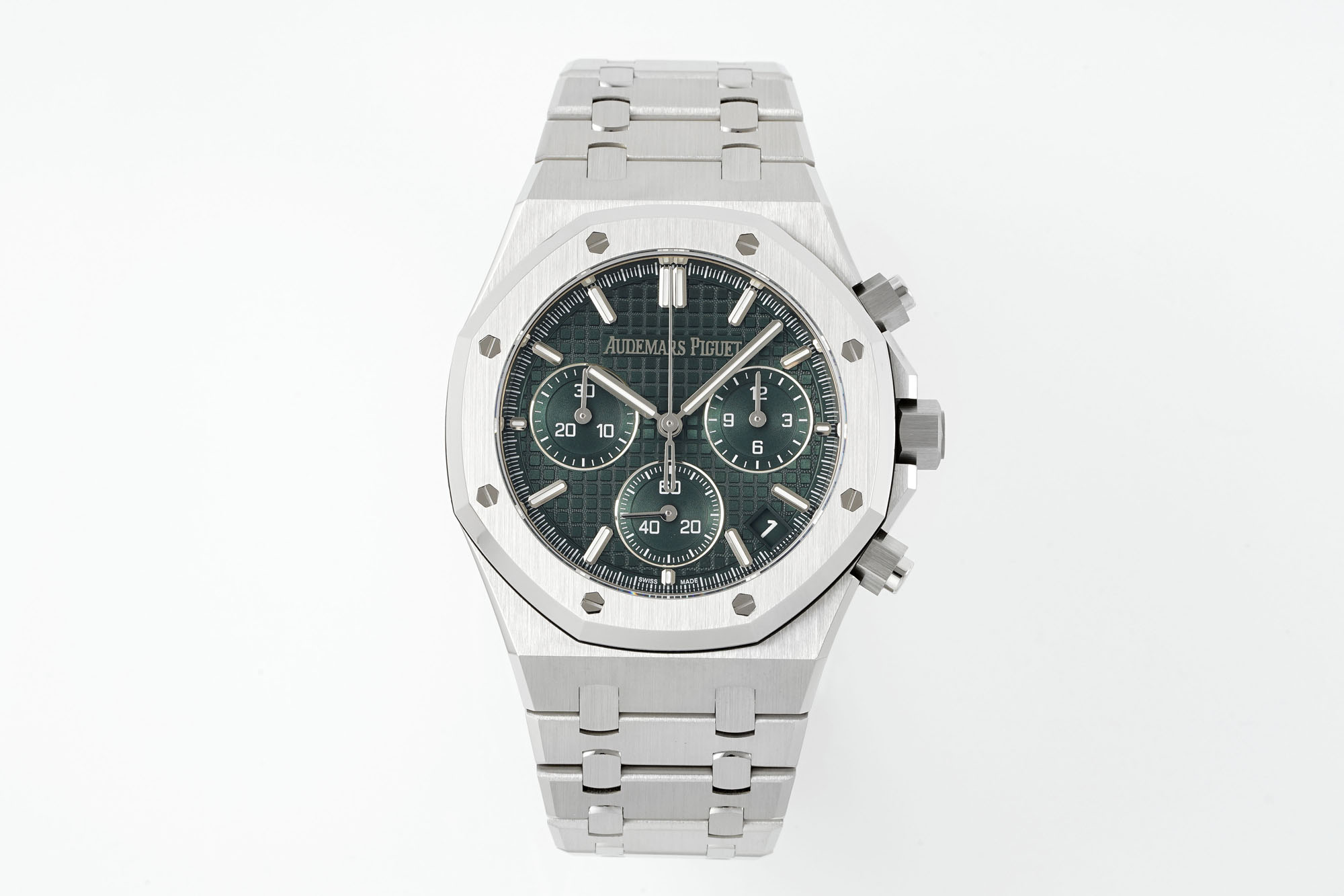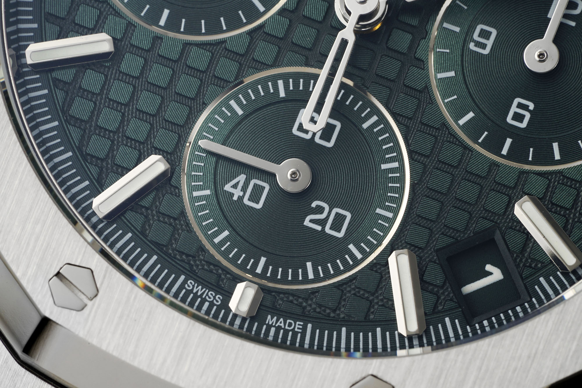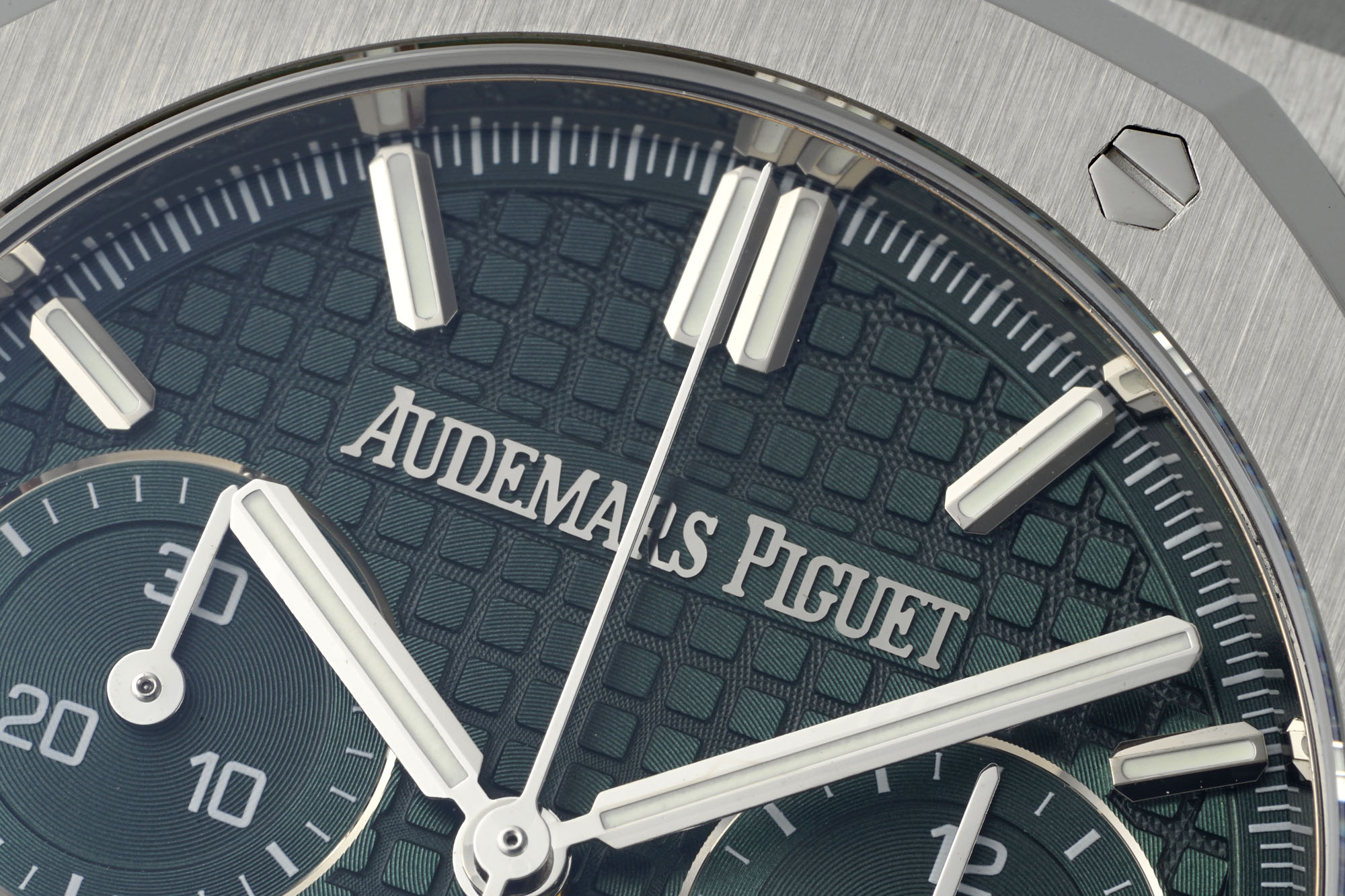DDF 26240レプリカの文字盤は、オリジナルを緻密に再現しています。「AP」ロゴとタイポグラフィは、オリジナルモデルの華やかさを反映するように精密に彫刻されており、特徴的な長い「A」と角度の付いた「E」の中線を含んでいます。文字盤のテクスチャは、格子状のパターンに拡大され、立体的なワッフル効果でロイヤルオークシリーズの商標として知られています。この緻密なディテールへの配慮は、サブダイヤルや大胆な日付窓にも及んでおり、四軸レーザー彫刻によってオリジナルの美学をほぼ完全に再現しています。