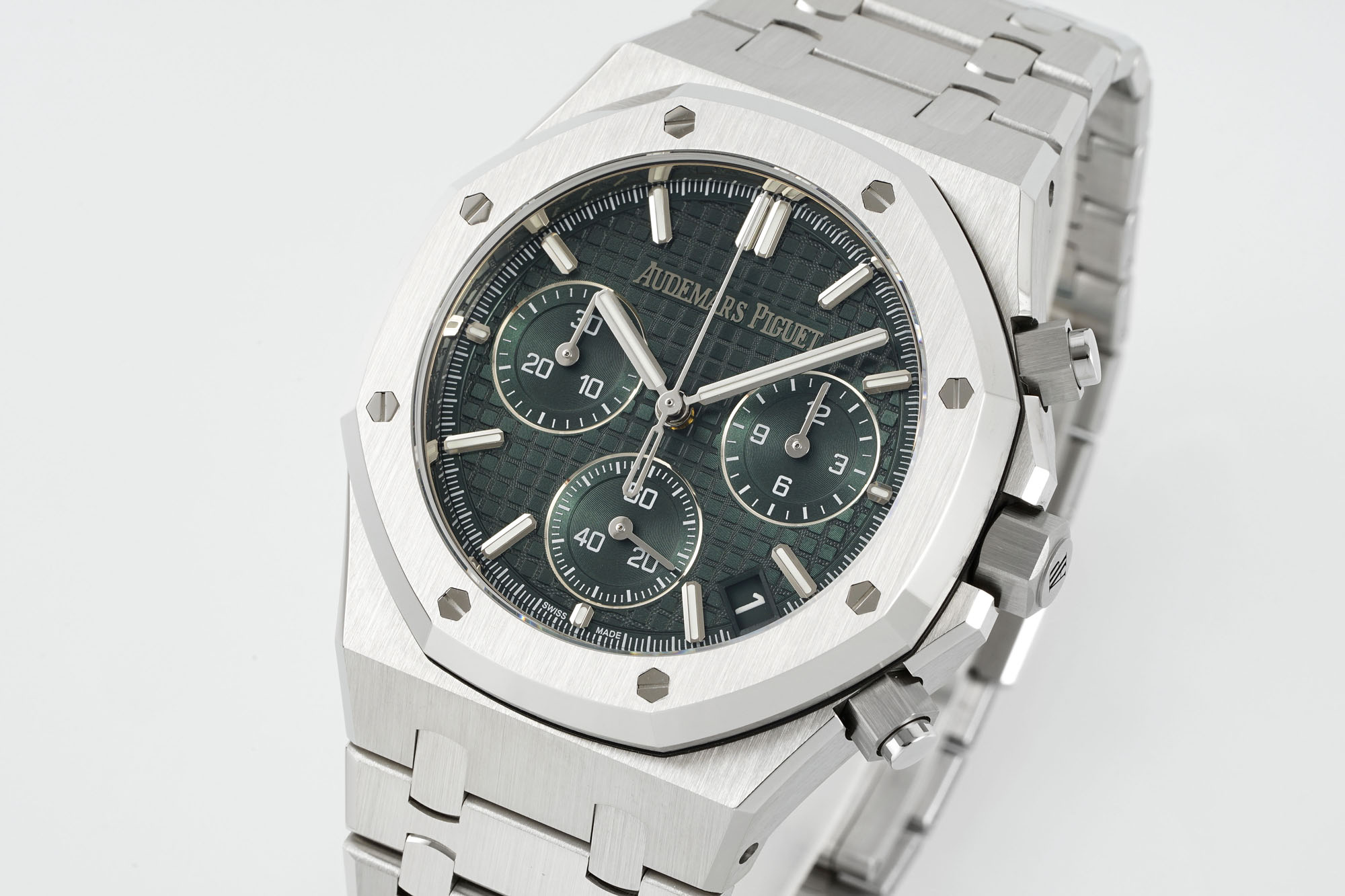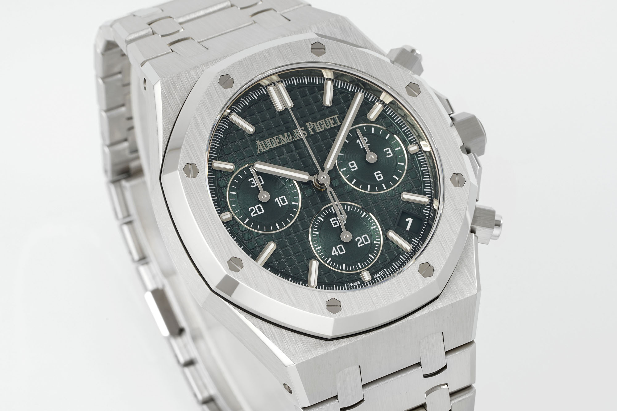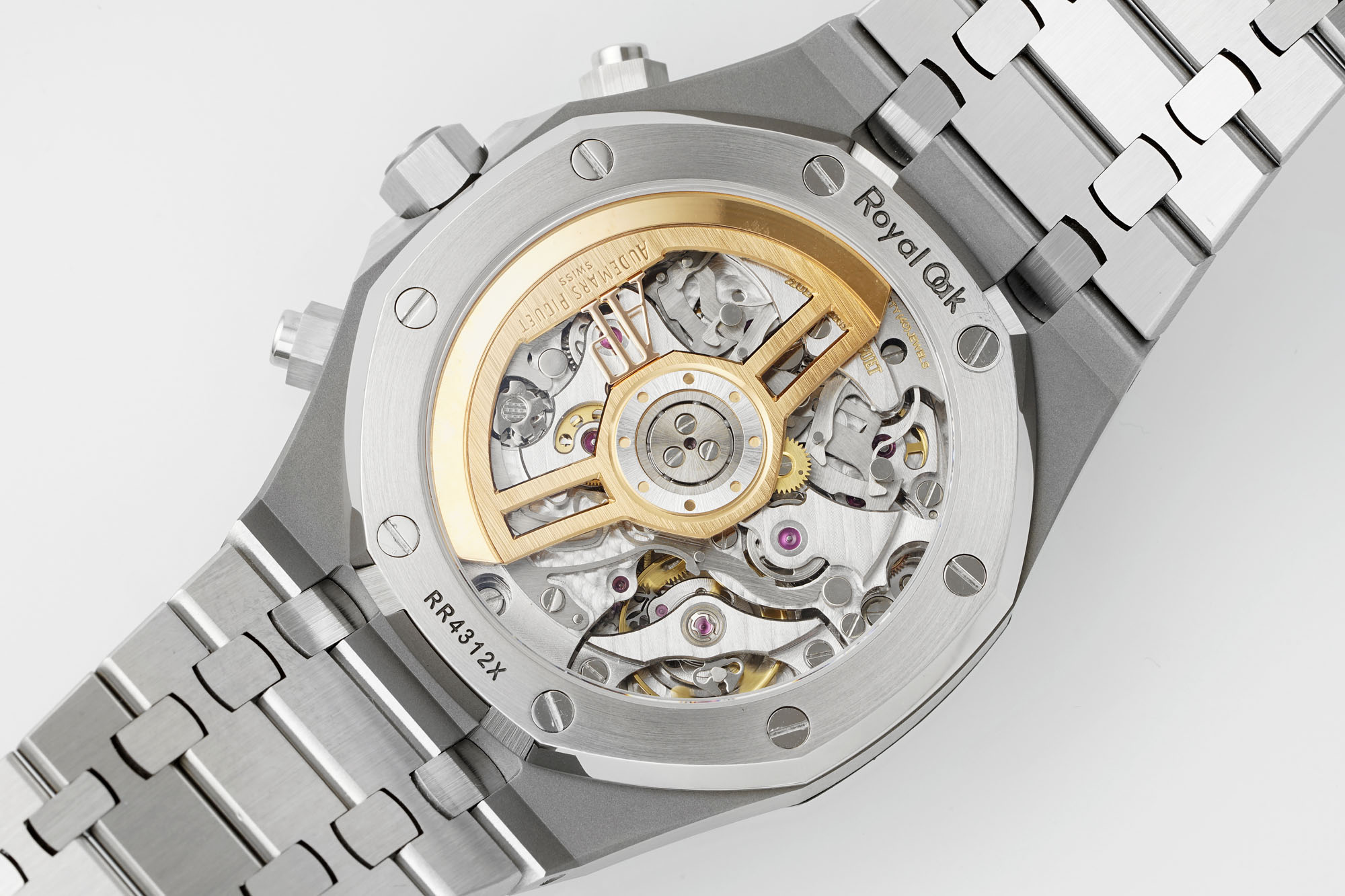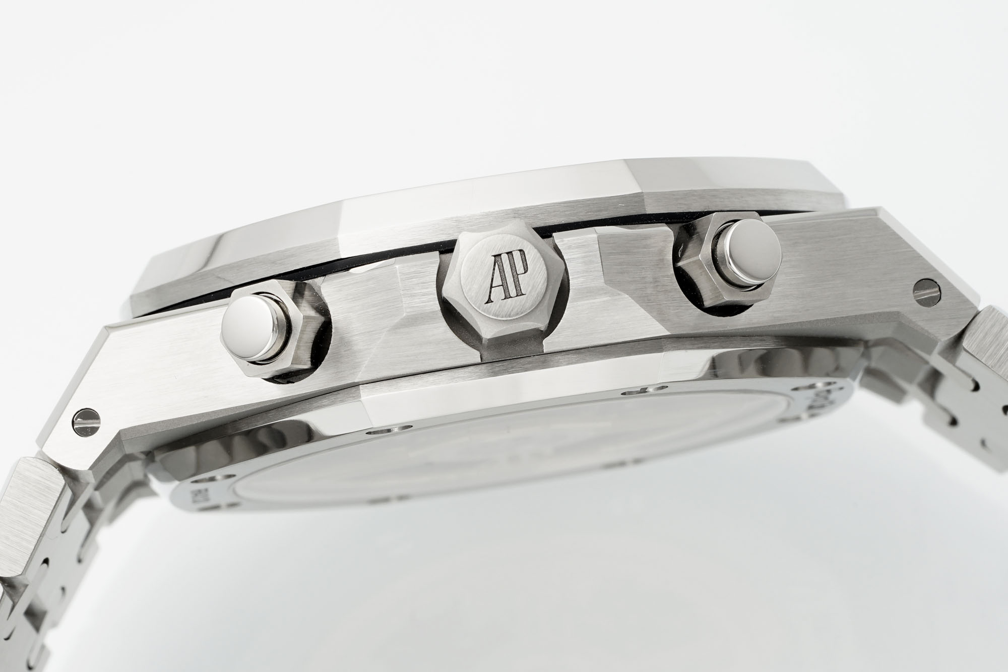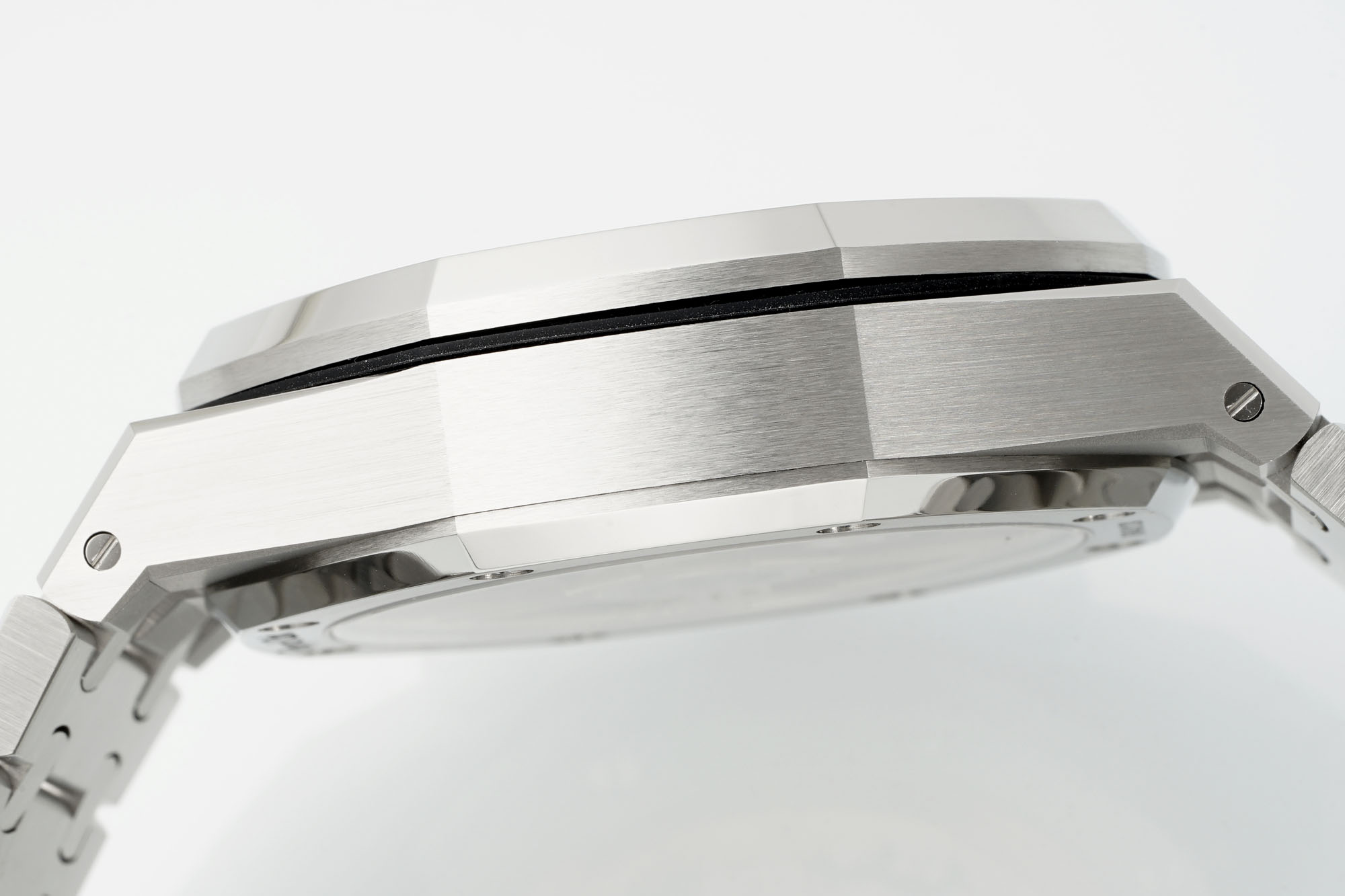 DDFロイヤルオークのケースの印象的なデザインは、オリジナルの六角形ベゼルを高光沢のネジで完璧に再現していることを見逃せません。ブラッシュ仕上げとポリッシュ仕上げの微妙な組み合わせが時計の各面を強調し、面取りされたエッジとケースパーツ間のシームレスな移行がロイヤルオークに特有の構造的な一体感を維持しています。