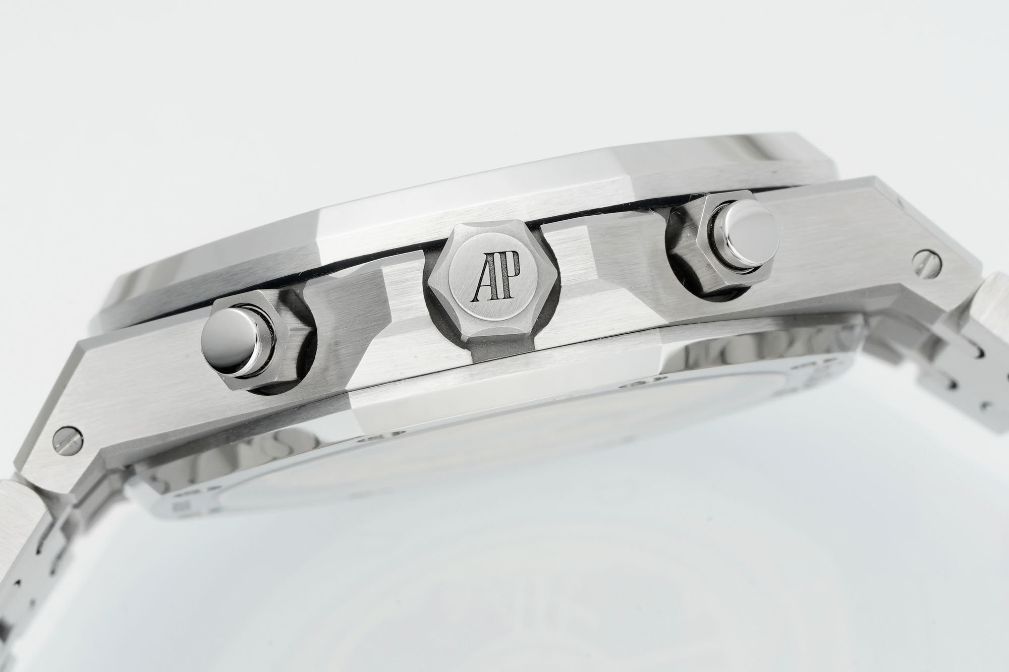 DDFは、ロイヤル オークを定義するデザイン要素を細部に至るまで忠実に再現しました。文字盤には正確にスケールされたロゴがあり、特に「A」の長い脚や「E」の斜めの中線は、オリジナルの美学を正確に反映しています。この注意は、文字盤の背景の複雑なワッフルパターンにまで及び、レーザー技術を用いて均一で立体的な効果を実現しています。こうしたデザインの忠実性は、レプリカの技術力の証明であると同時に、模倣市場における現代技術の能力を示すものです。