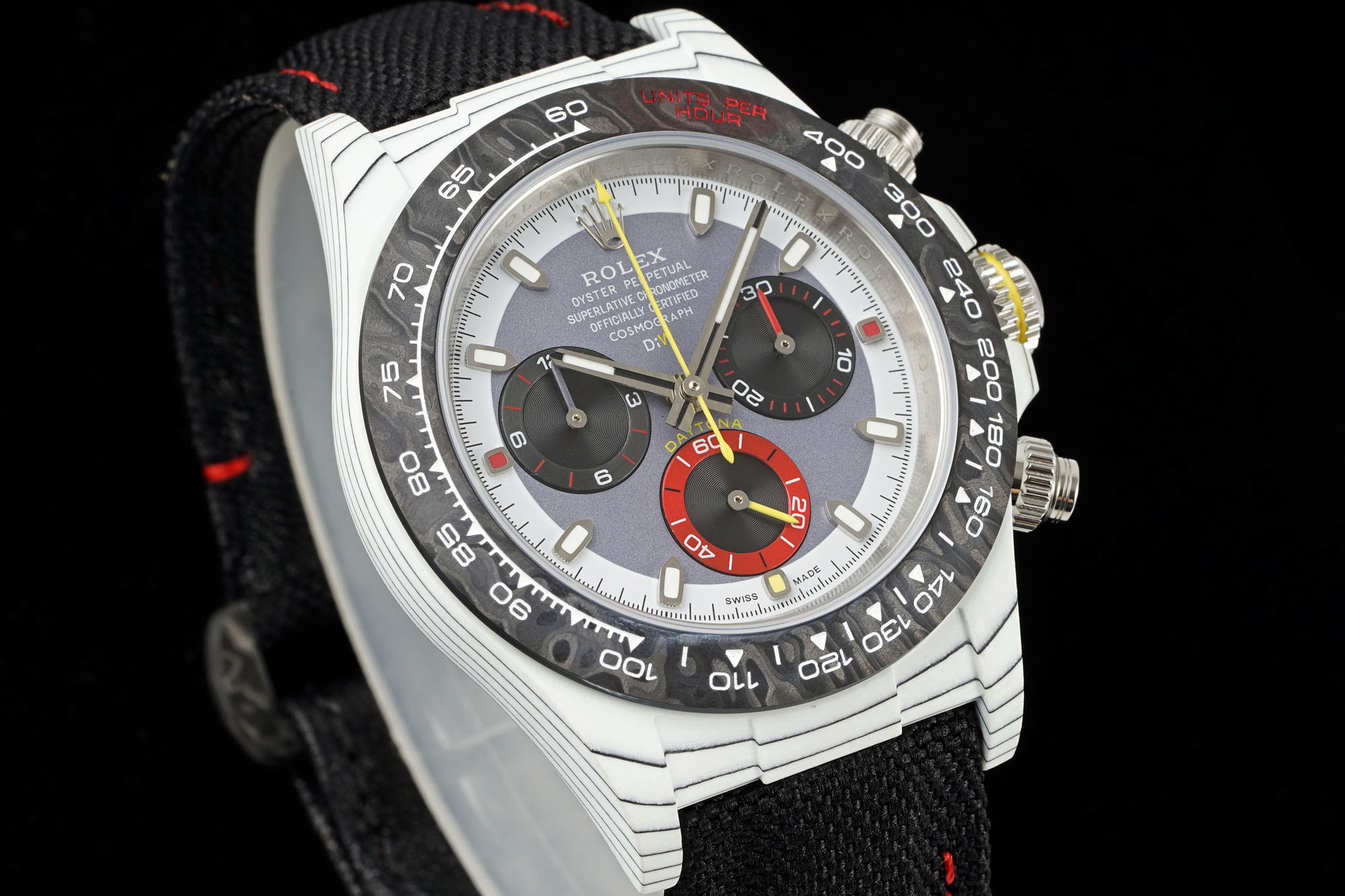 DiWカーボンファイバー デイトナは、細心の注意を払ってアップグレードされたカーボンファイバーケースで差別化されています。この再構築は単なる美的な強化を超え、新しい装着体験を提供します。伝統的に高級時計は金やスチールのような素材に大きく依存してきましたが、カーボンファイバーはその軽量で耐久性のある特性から重要な素材として浮上しています。その結果、このアップグレードにより、時計の重量が軽減されつつも構造的な一体性が保たれ、従来の金属ケースと比べて独特の触感を提供します。