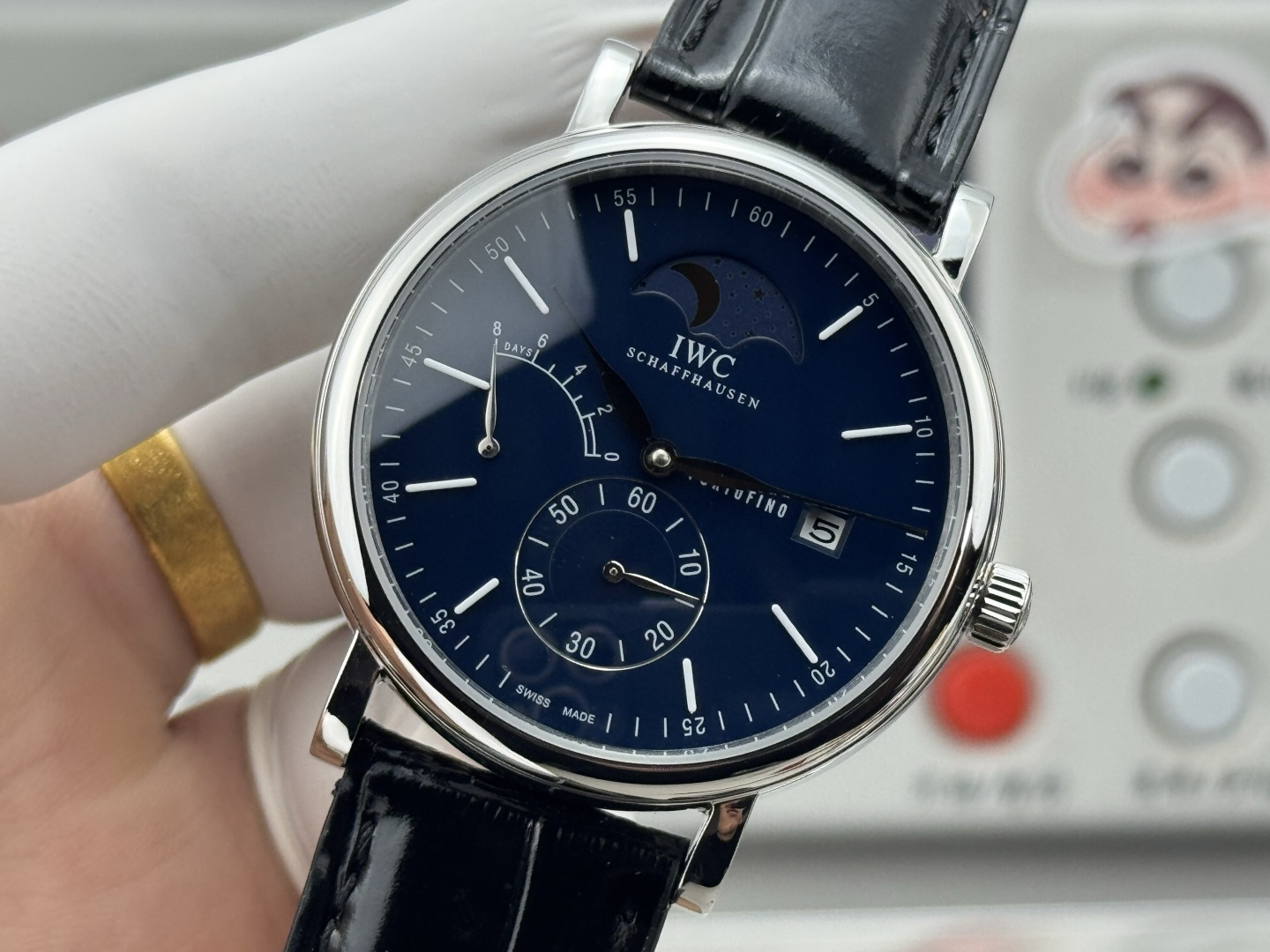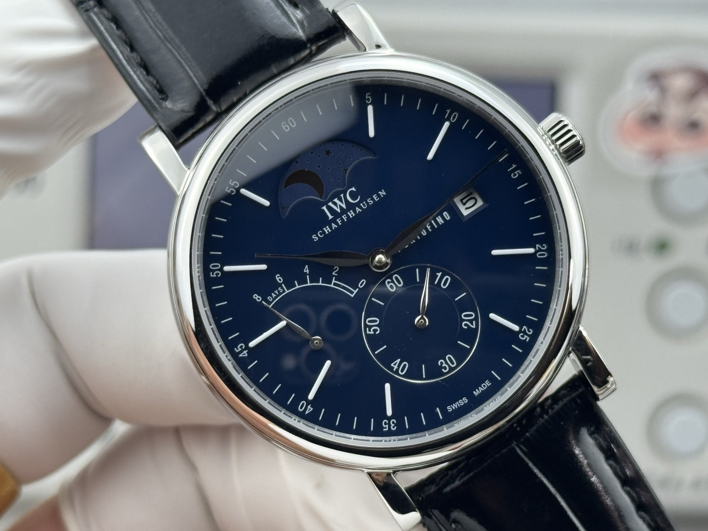 時計の文字盤には、しっかりとしたバーインデックスとローマ数字が飾られ、クラシックでありながら現代的な印象を与えます。9時位置に配置されたパワーリザーブインジケーターは、3時位置のデイトウィンドウと調和を保ち、その縁には「Portofino」の文字が刻まれています。興味深いことに、デイトウィンドウは文字盤の端に位置し、パワーリザーブ表示との調和を維持しています。リーフ型の針は反射防止サファイアクリスタルでコーティングされており、明るい場所でも時間の読み取りが容易です。