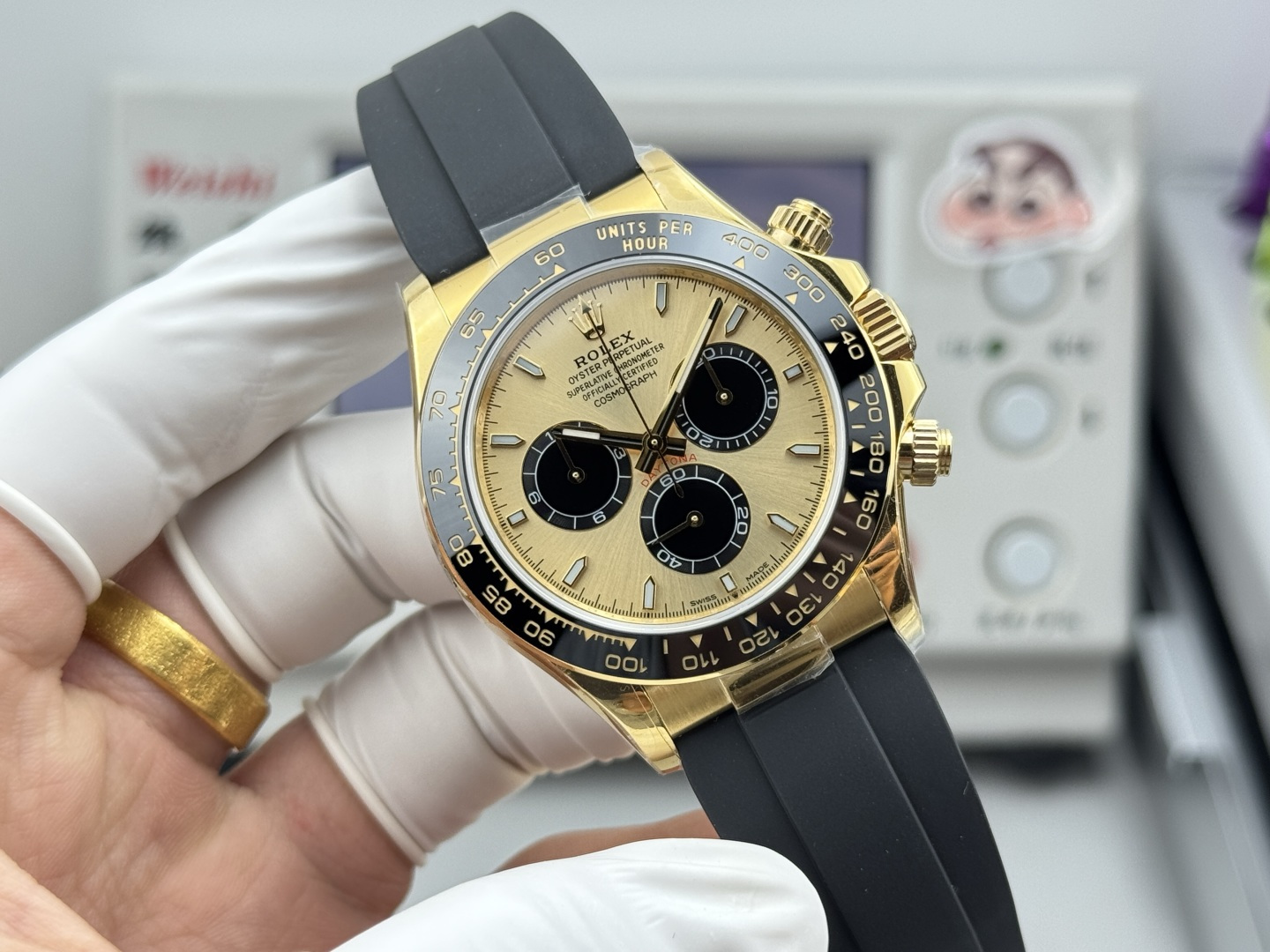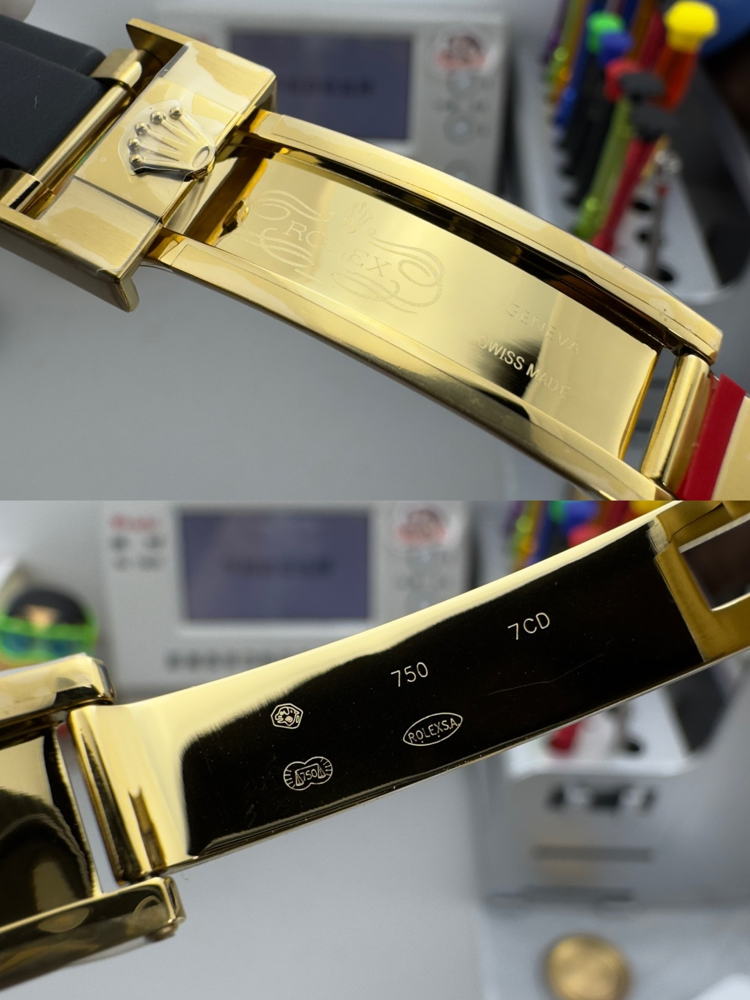 40mmのケースは、オリジナルサイズのゴールドの寸法と厚さ12.1mmを備え、4つの貴金属ホールマークを持ち、本物のディテールを再現しています。このディテールへのこだわりは、レプリカが劣っている、あるいは露骨に偽物であるという固定観念に挑戦する精密さへのコミットメントを強調しています。