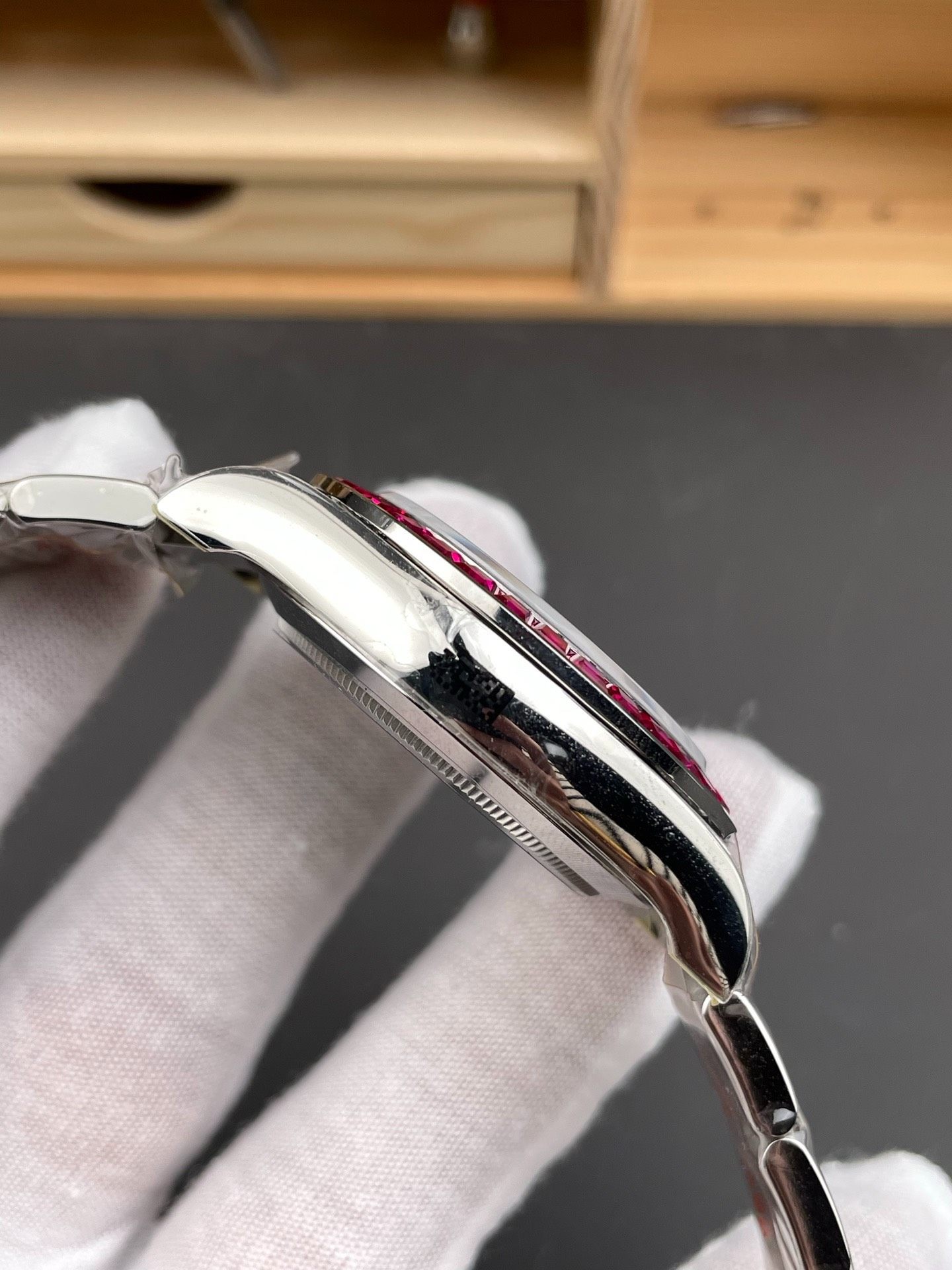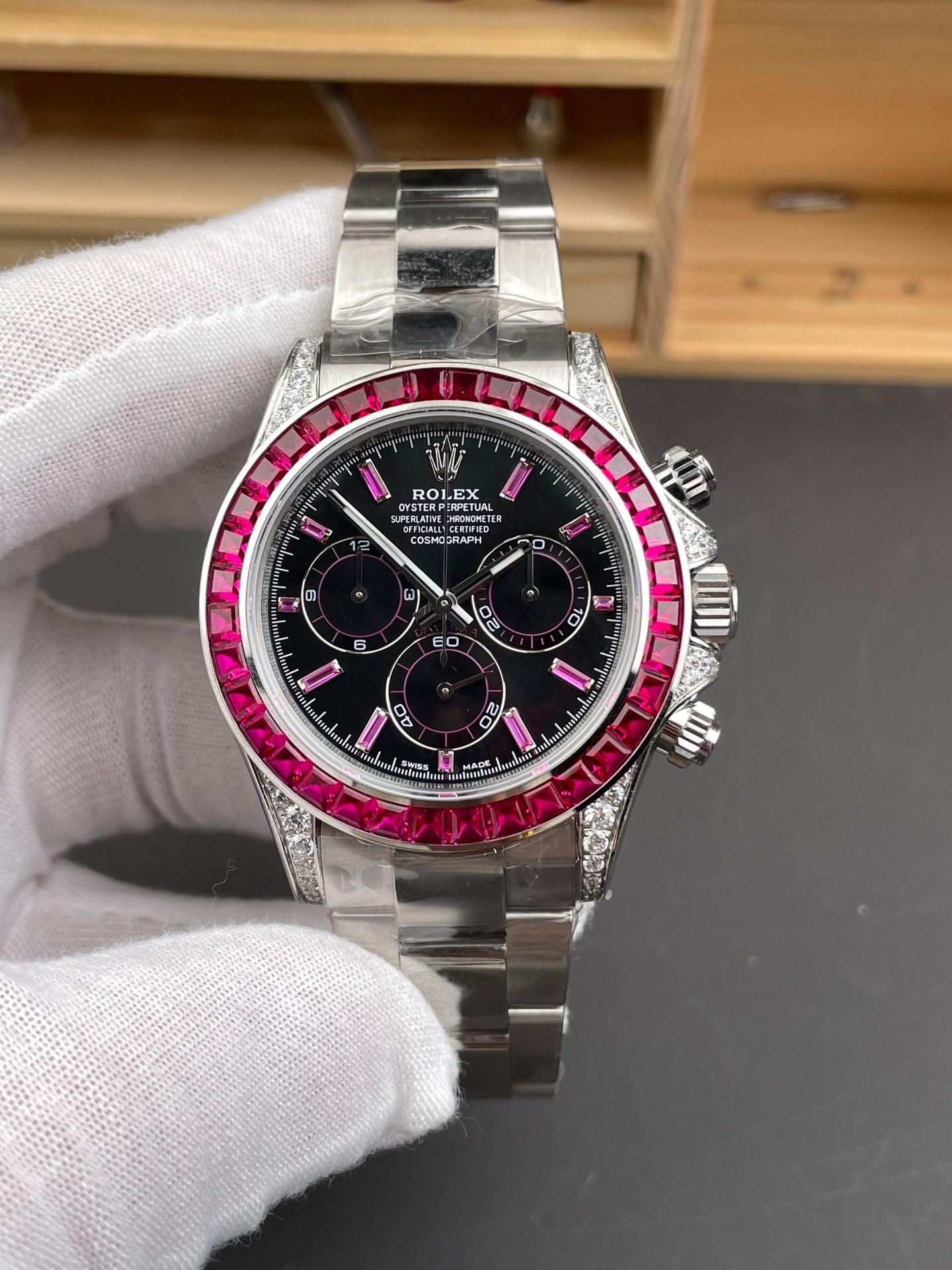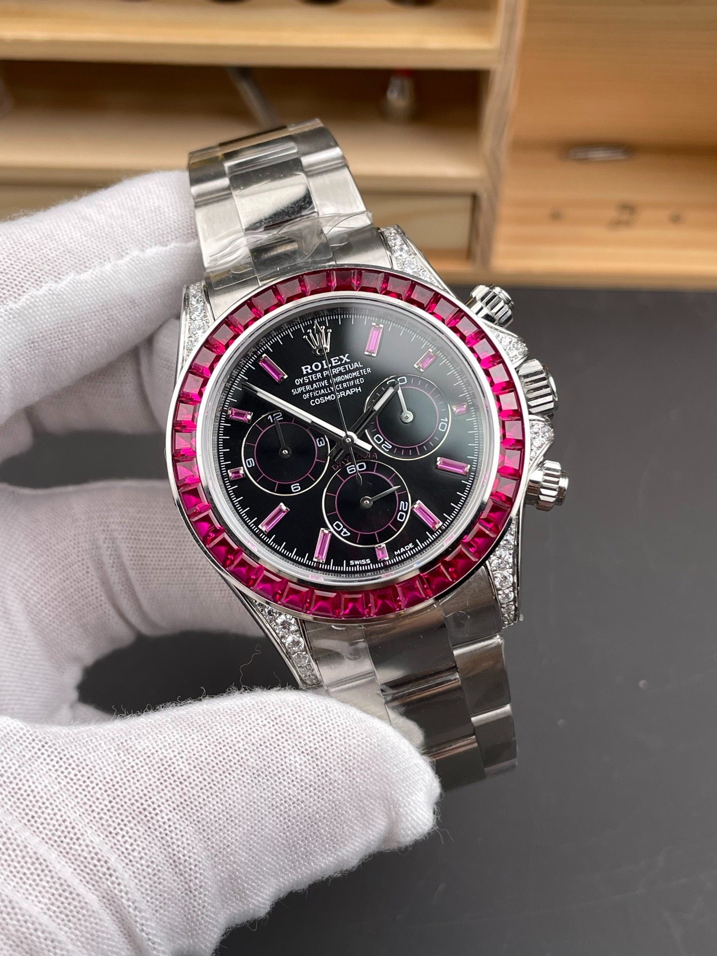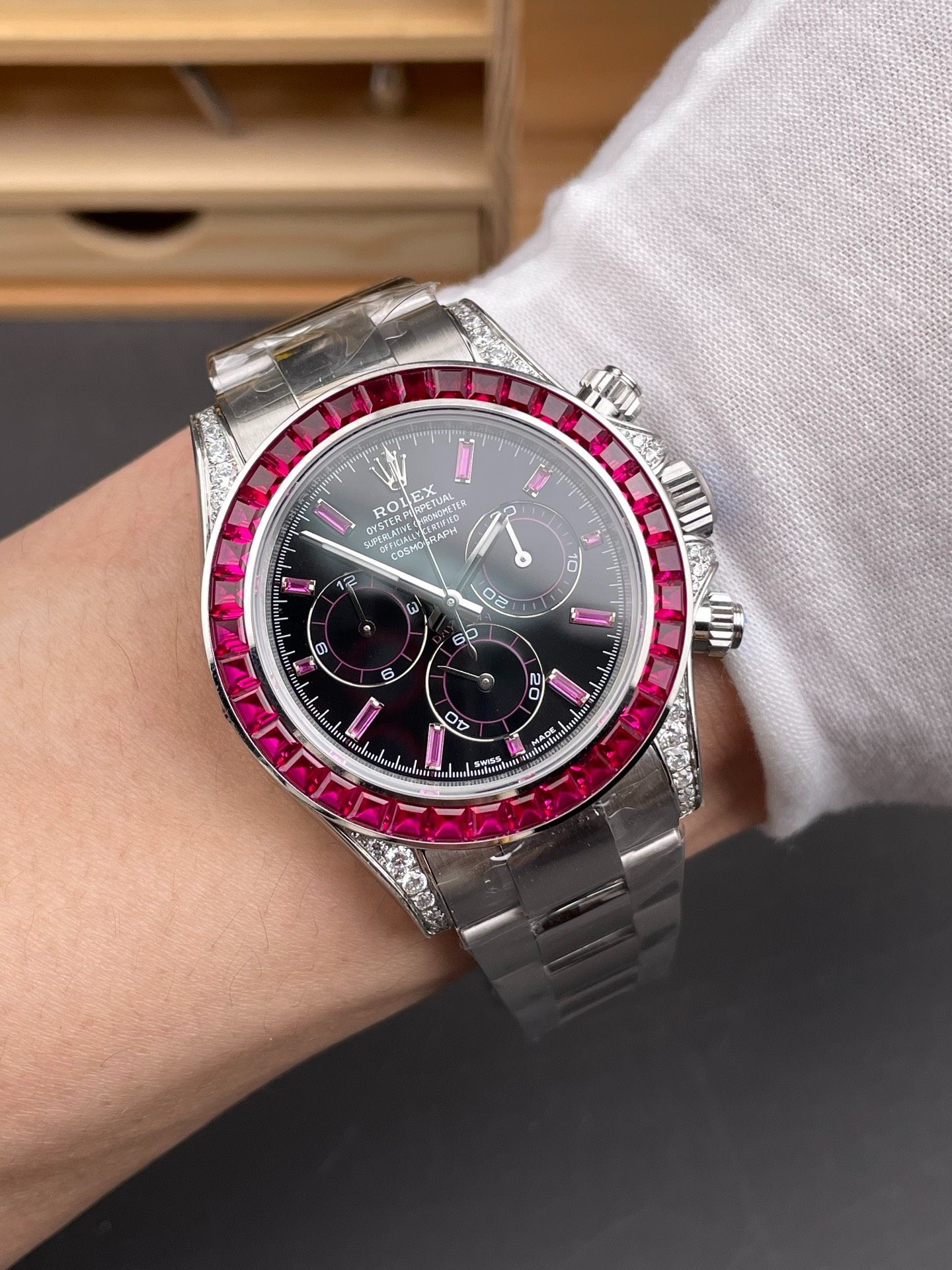 PPMデイトナは、赤いラボ育成(CVD)ストーンをセットしたベゼルを精巧に作り上げ、頑丈なステンレススチールフレームとサファイアクリスタルガラスと組み合わせています。この素材の融合は、デイトナに期待される耐久性を強調するだけでなく、従来のデザインから逸脱した活気ある美学を導入します。黒い文字盤には赤いインデックスが施され、クラシックとコンテンポラリーなデザイン要素を取り入れた印象的なコントラストを生み出します。