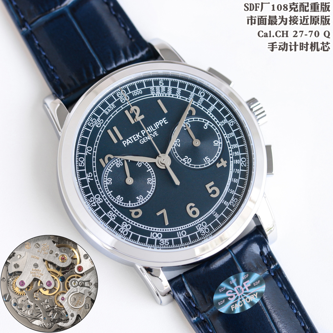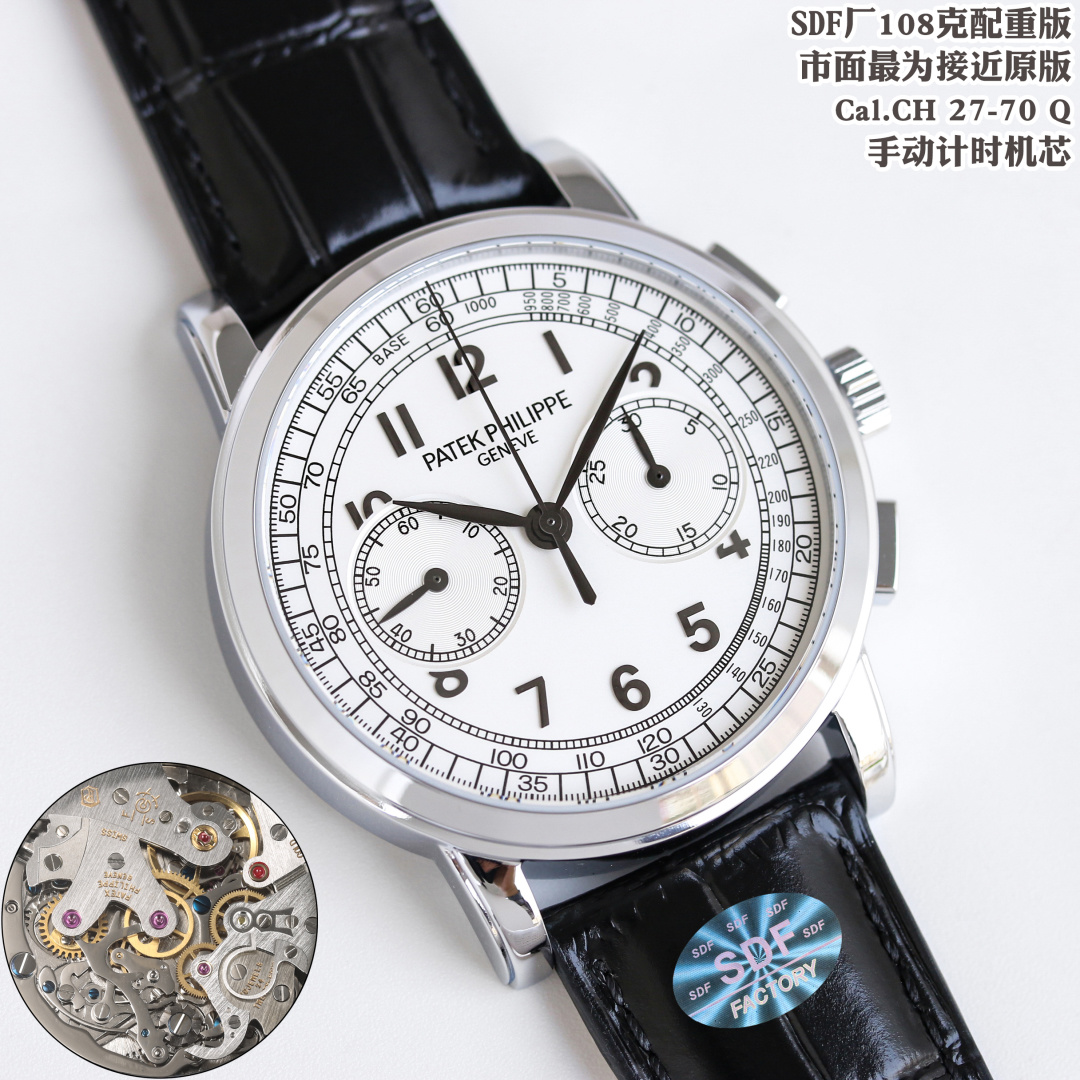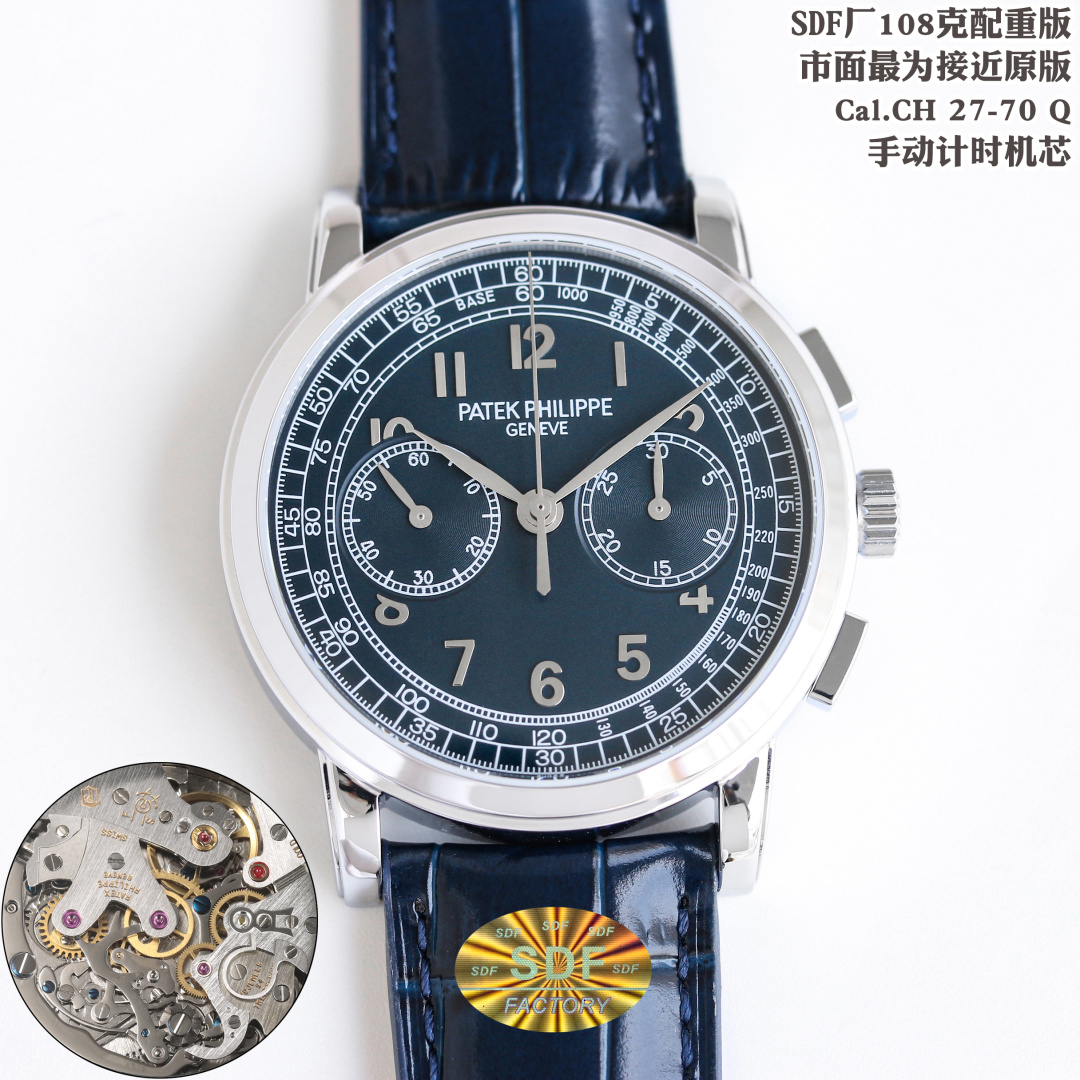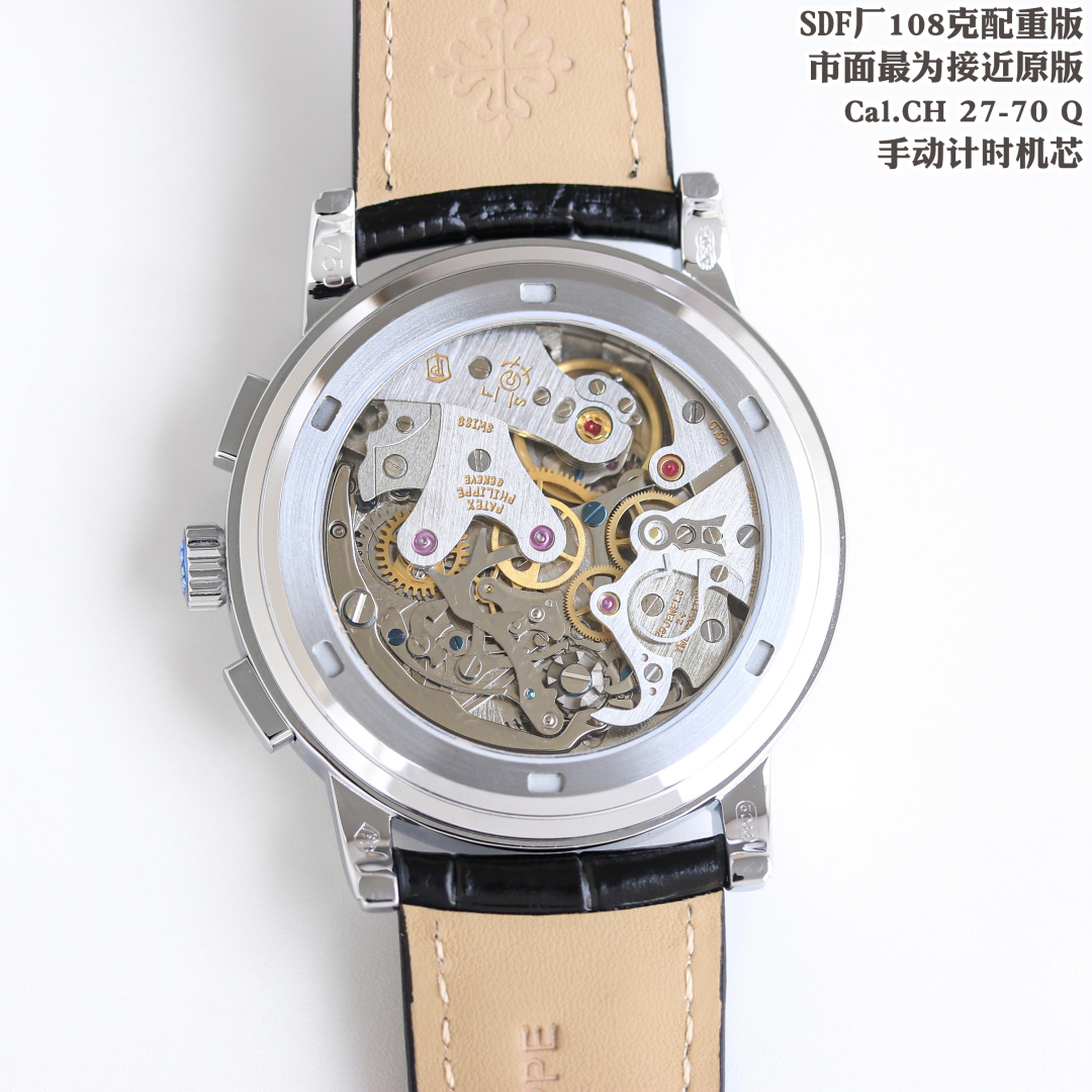 このレプリカの中心には、独自にカスタム改良されたCal.CH 27-70 Q手巻きクロノグラフムーブメントがあります。これは市場でオリジナルのパテック・フィリップ機構に最も近いとされています。このムーブメントは、高級時計に求められる美的魅力と機械的な優秀さの両方を再現し、オマージュと偽造の微妙な境界線を強調しています。このような精密さに焦点を当てることで、SDFファクトリーはレプリカ時計は品質や性能を提供できないという従来の認識に挑戦しています。
