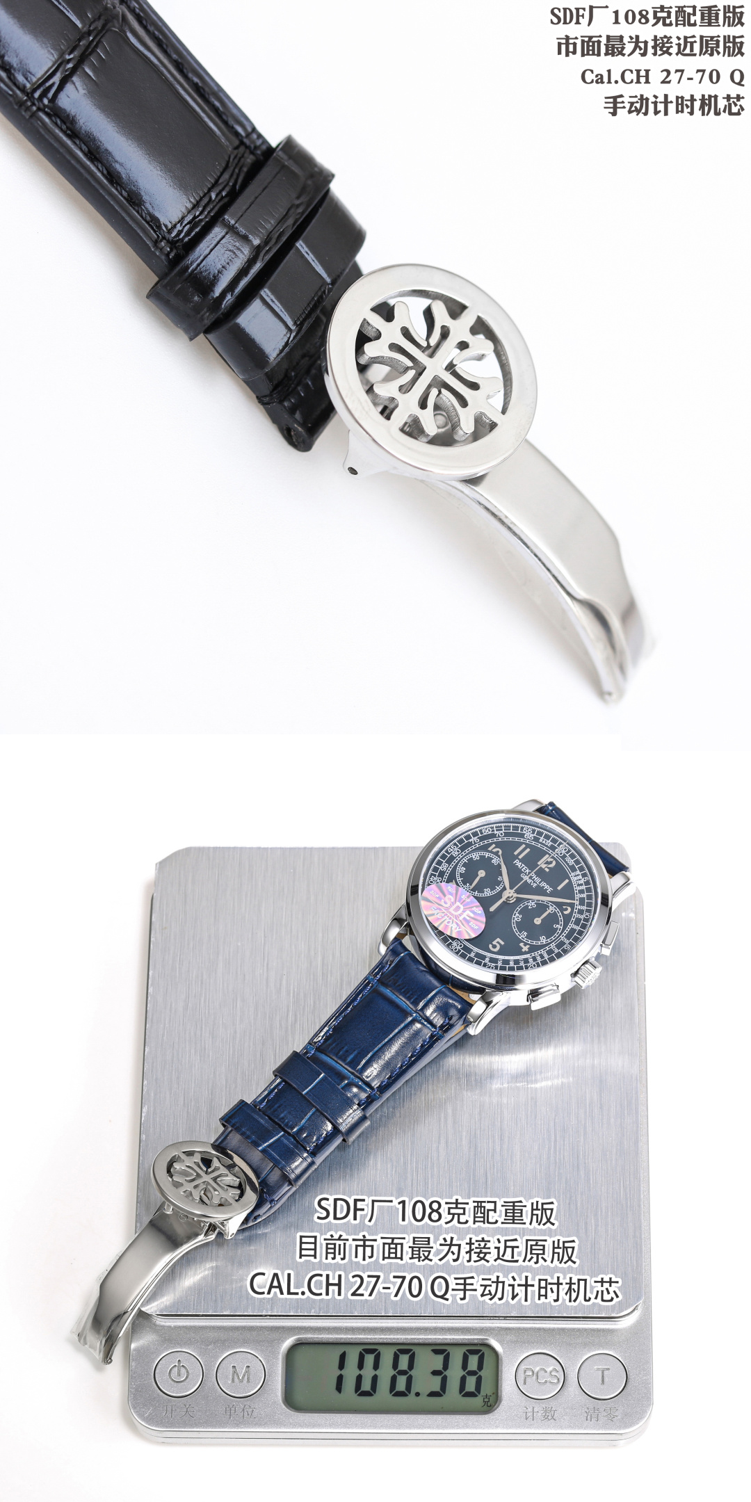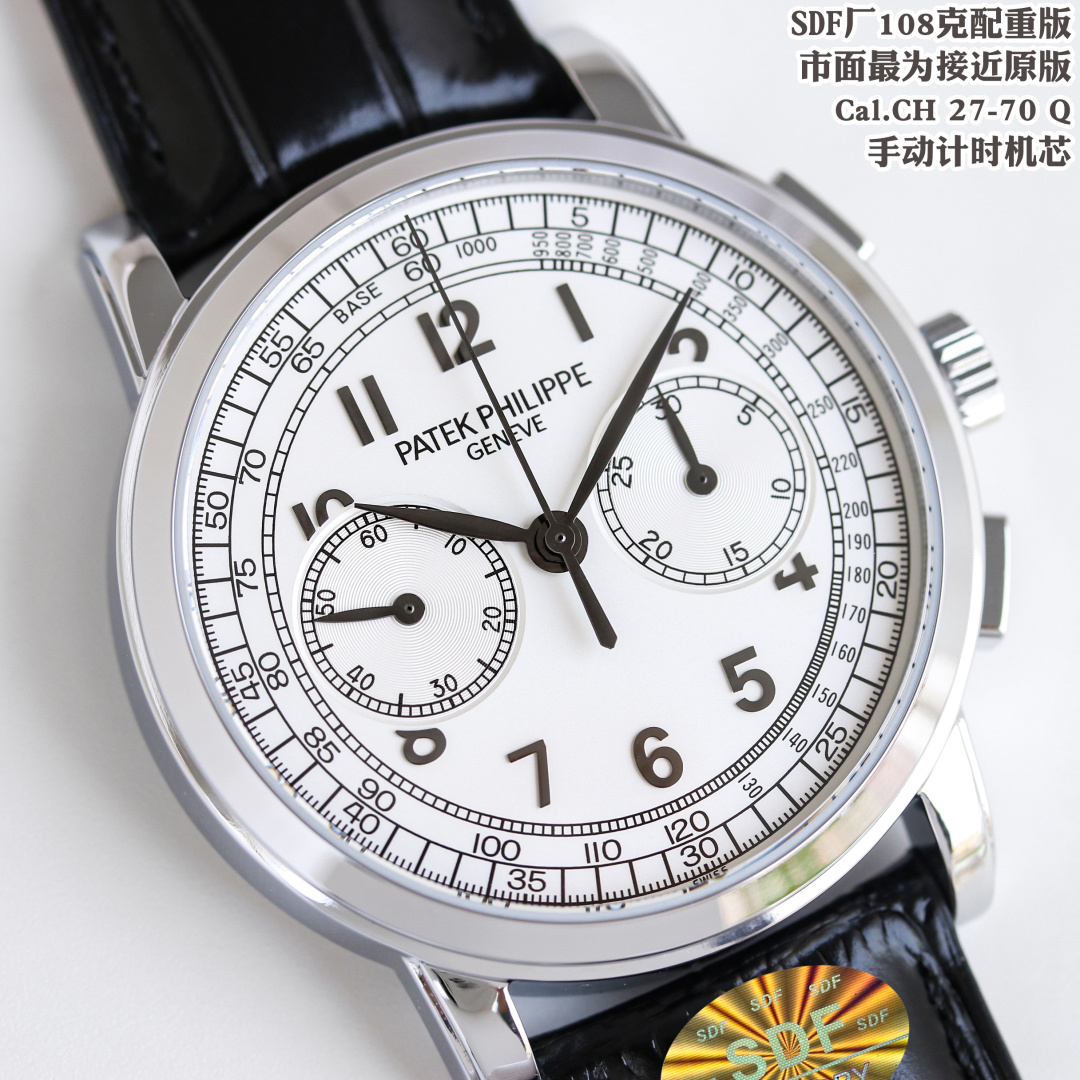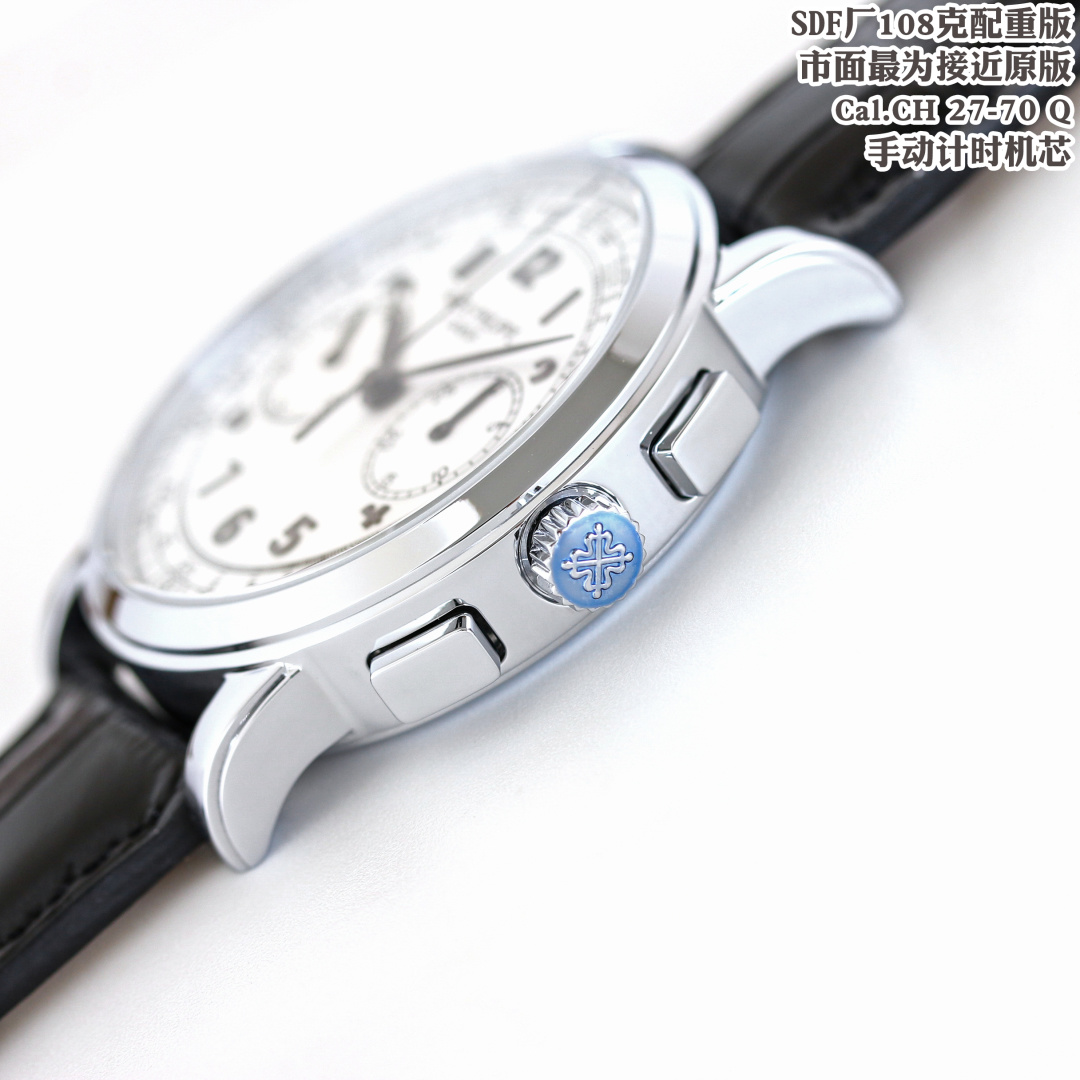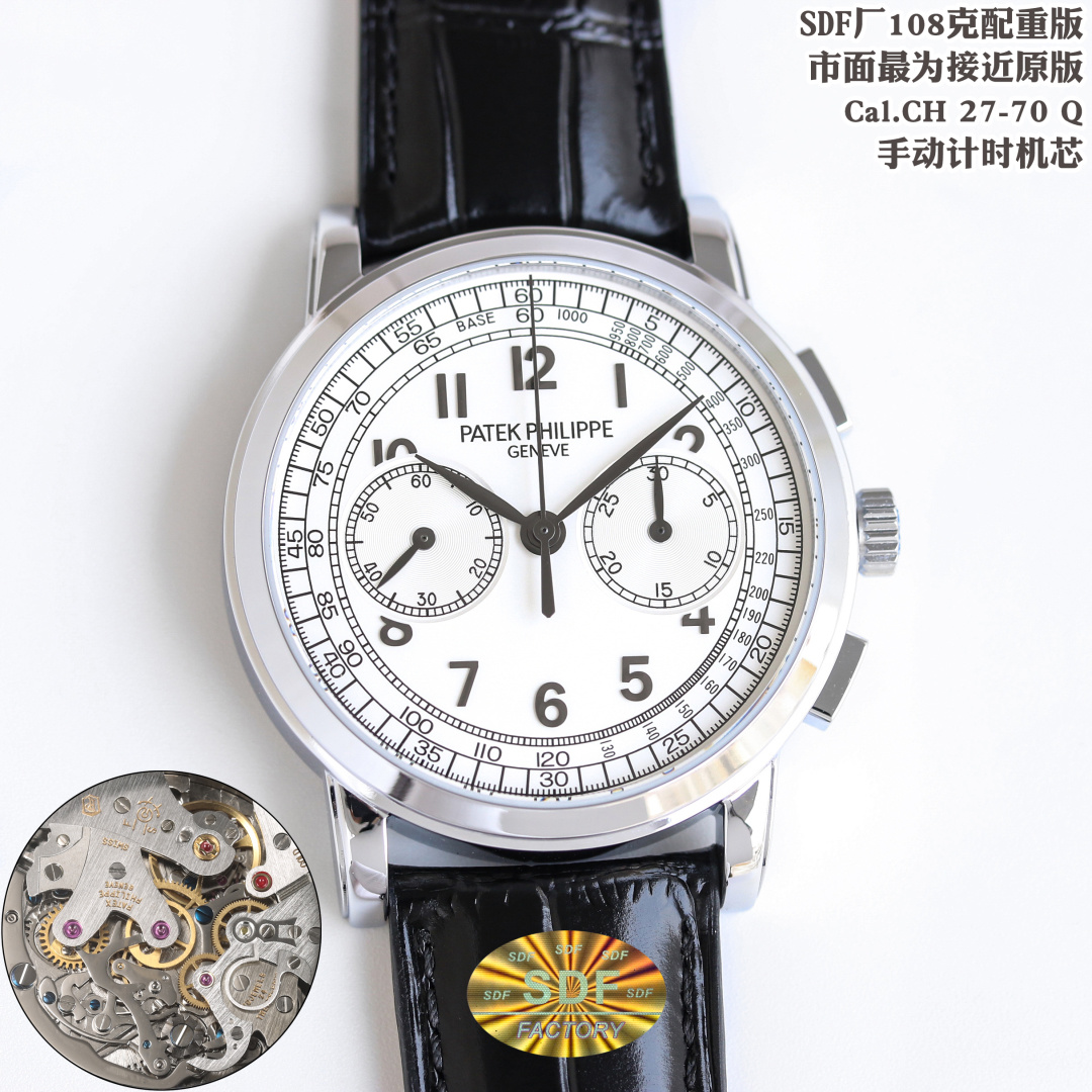 このレプリカの中心には、独自にカスタム改良されたCal.CH 27-70 Q手巻きクロノグラフムーブメントがあります。これは市場でオリジナルのパテック・フィリップ機構に最も近いとされています。このムーブメントは、高級時計に求められる美的魅力と機械的な優秀さの両方を再現し、オマージュと偽造の微妙な境界線を強調しています。このような精密さに焦点を当てることで、SDFファクトリーはレプリカ時計は品質や性能を提供できないという従来の認識に挑戦しています。