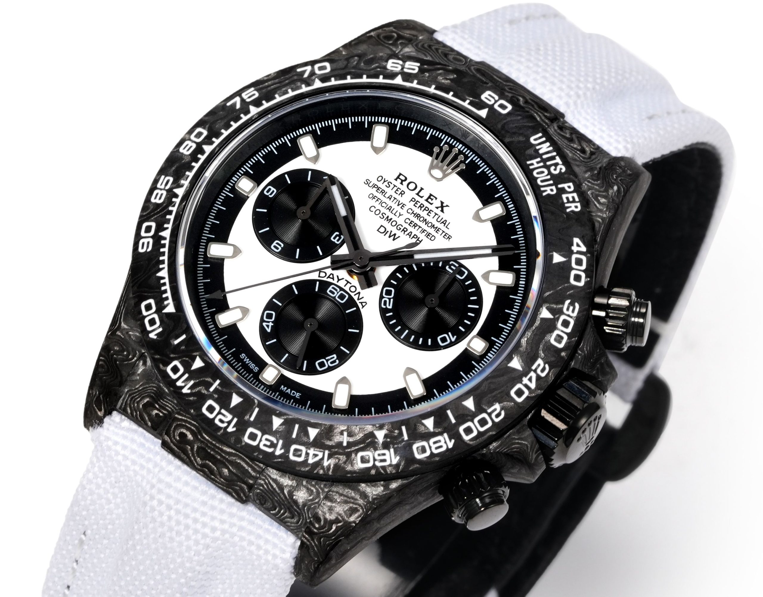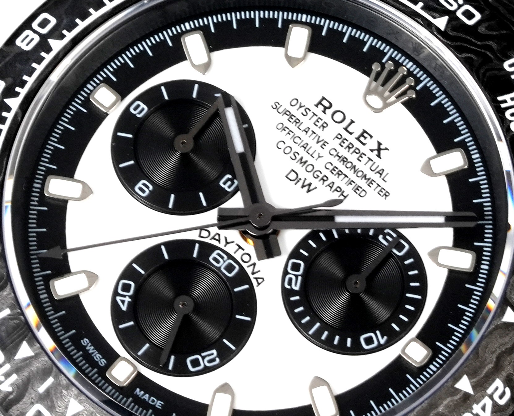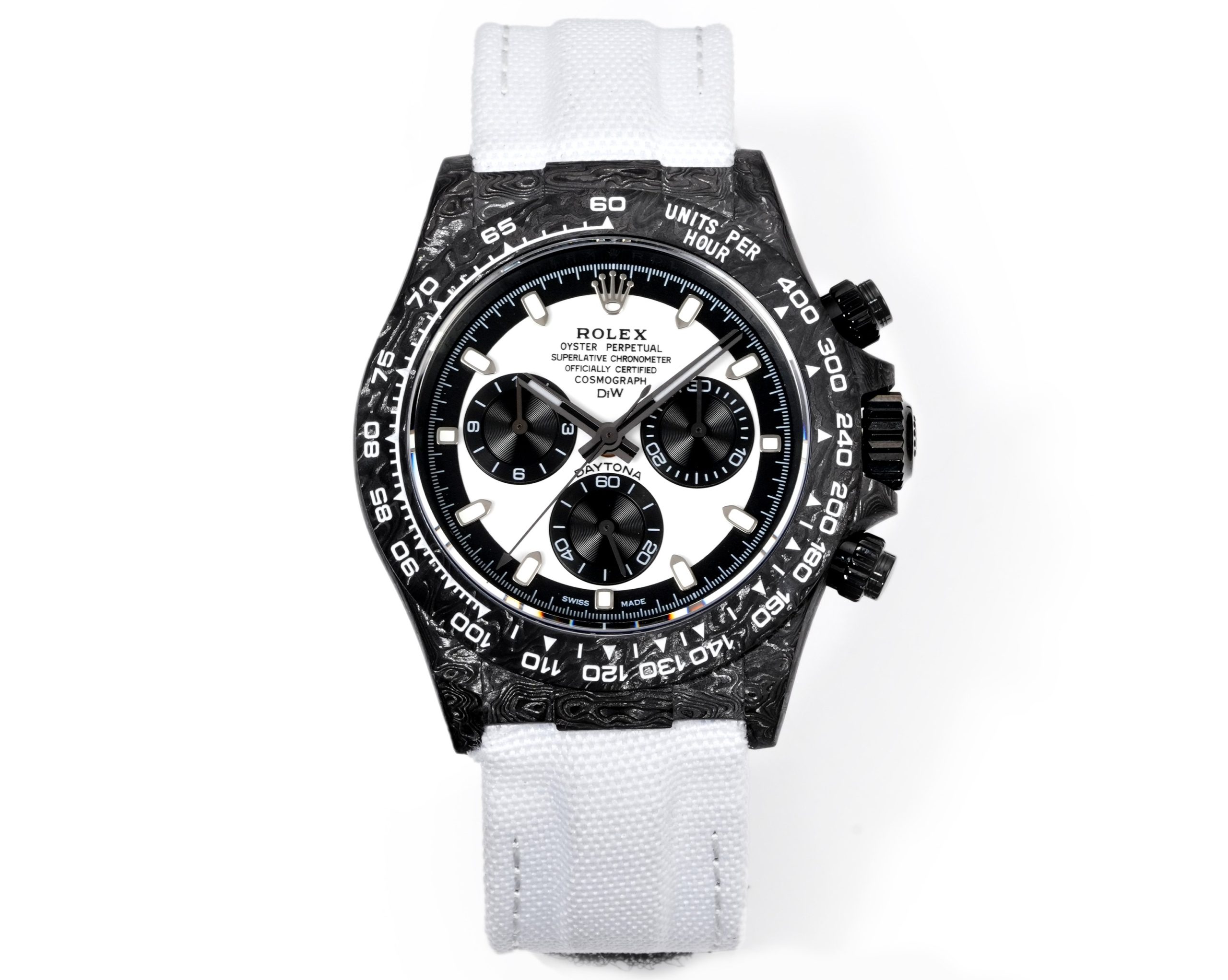 TWファクトリーのロレックスデイトナの注目すべき特徴は、間違いなく高複合カーボンファイバーによる構造です。それぞれの時計は独自のカーボンファイバーパターンを持ち、その美的魅力を高めています。ケース、ベゼル、ケースバックはこの先進的な素材で作られ、頑丈でありながら軽量なプロファイルを主張しています。時計の直径は40mm、厚さは12.4mmで、オリジナル仕様に近いながらも、素材の使用を通じて現代的な再解釈を提供しています。