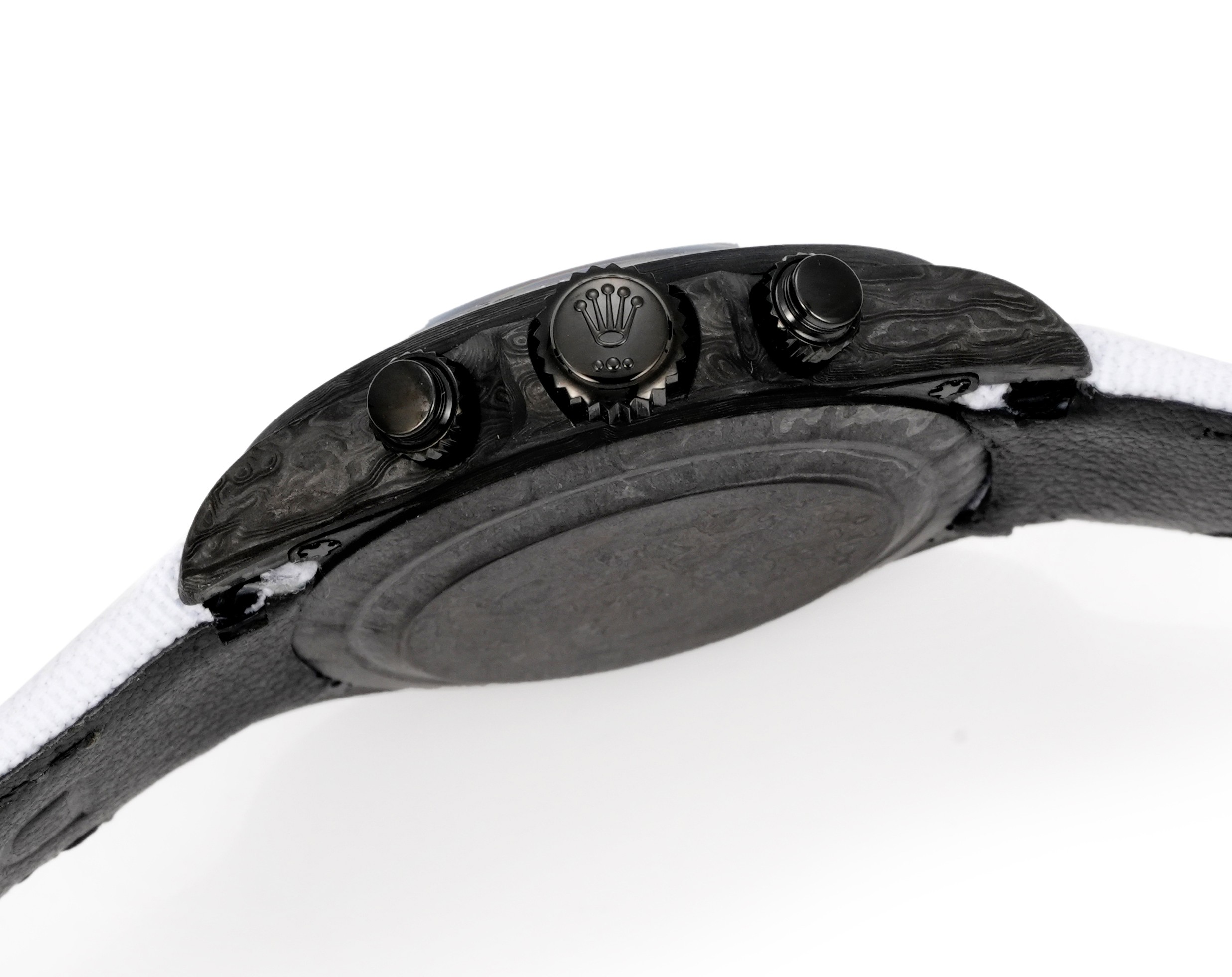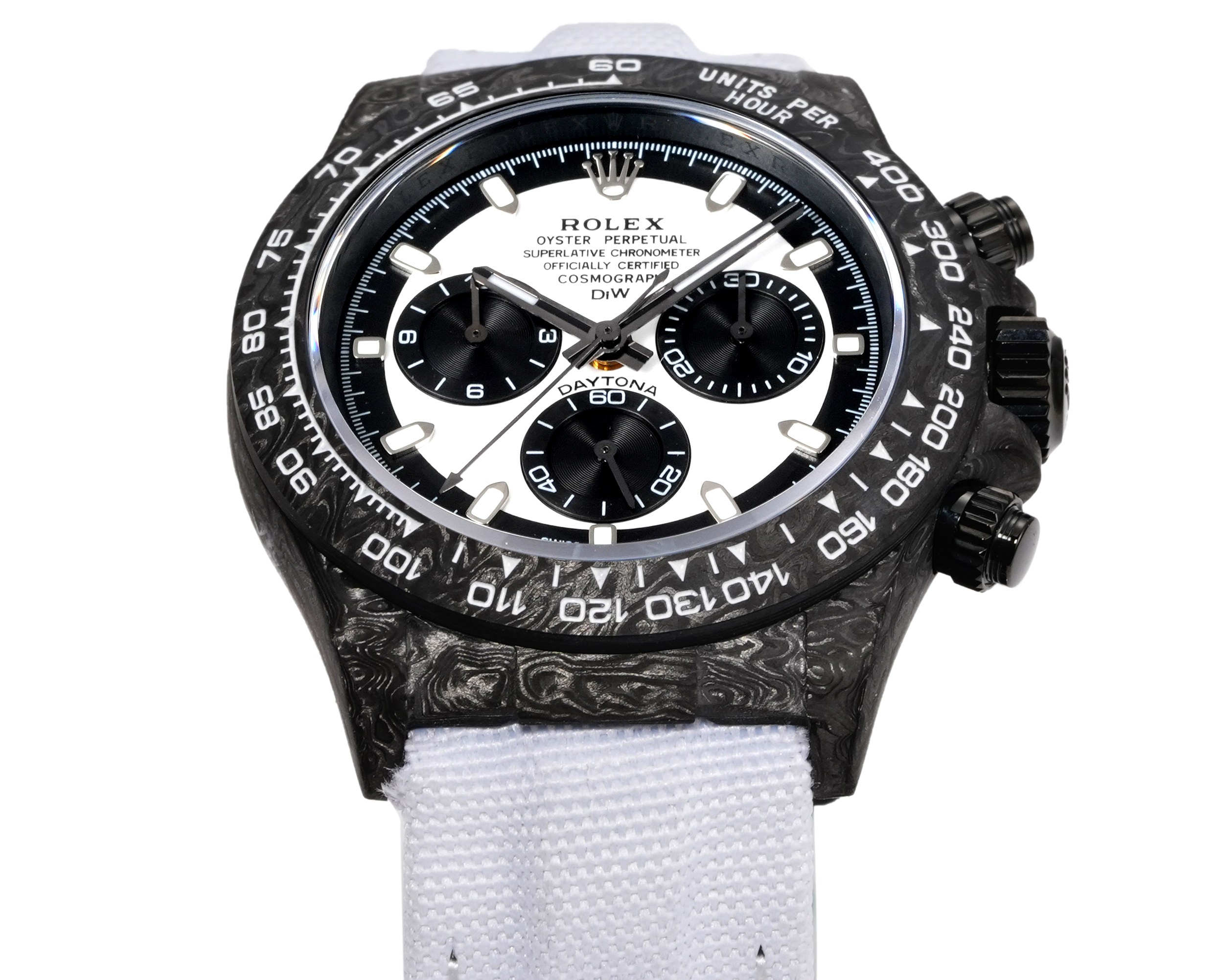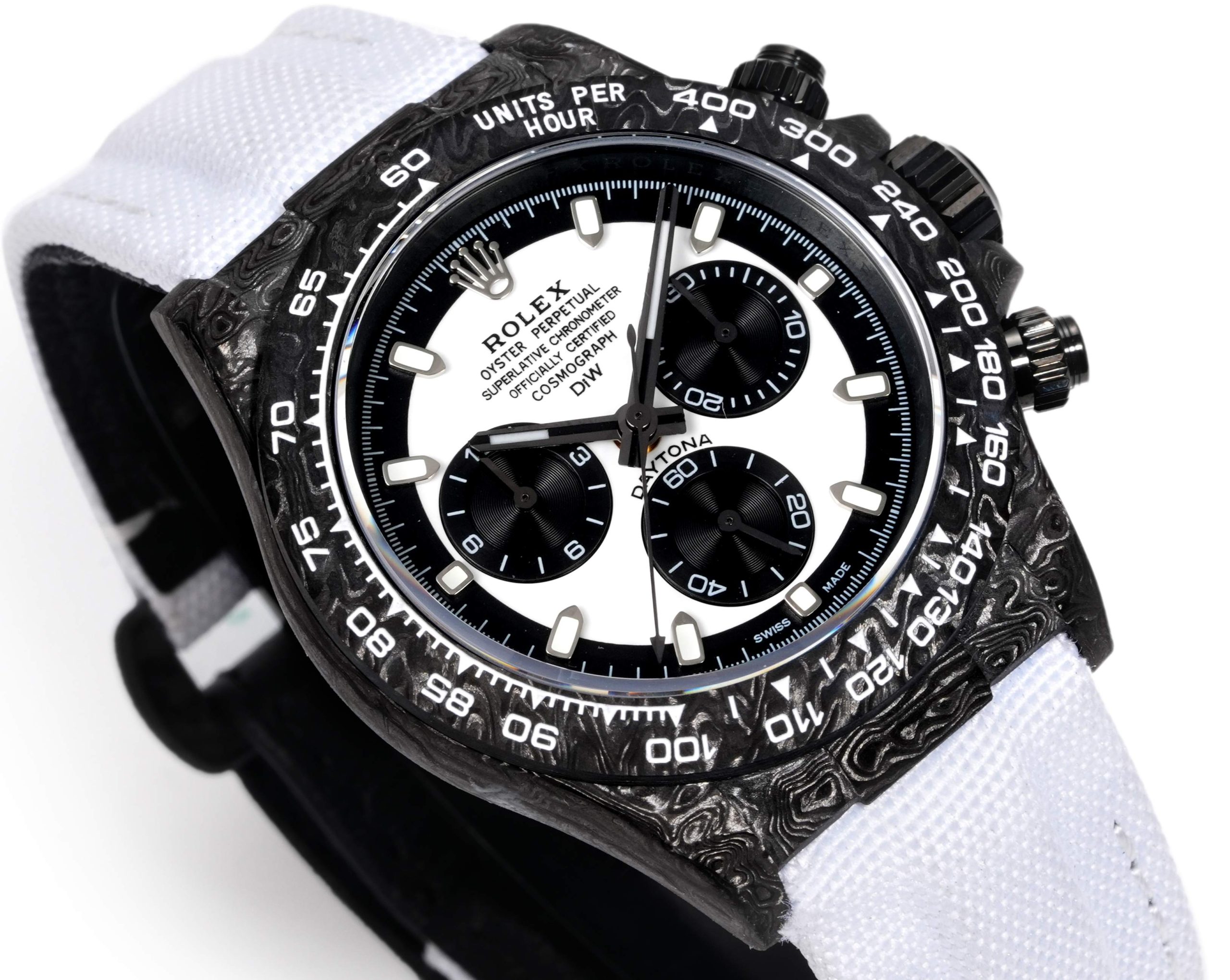 TWファクトリーのロレックスデイトナの注目すべき特徴は、間違いなく高複合カーボンファイバーによる構造です。それぞれの時計は独自のカーボンファイバーパターンを持ち、その美的魅力を高めています。ケース、ベゼル、ケースバックはこの先進的な素材で作られ、頑丈でありながら軽量なプロファイルを主張しています。時計の直径は40mm、厚さは12.4mmで、オリジナル仕様に近いながらも、素材の使用を通じて現代的な再解釈を提供しています。