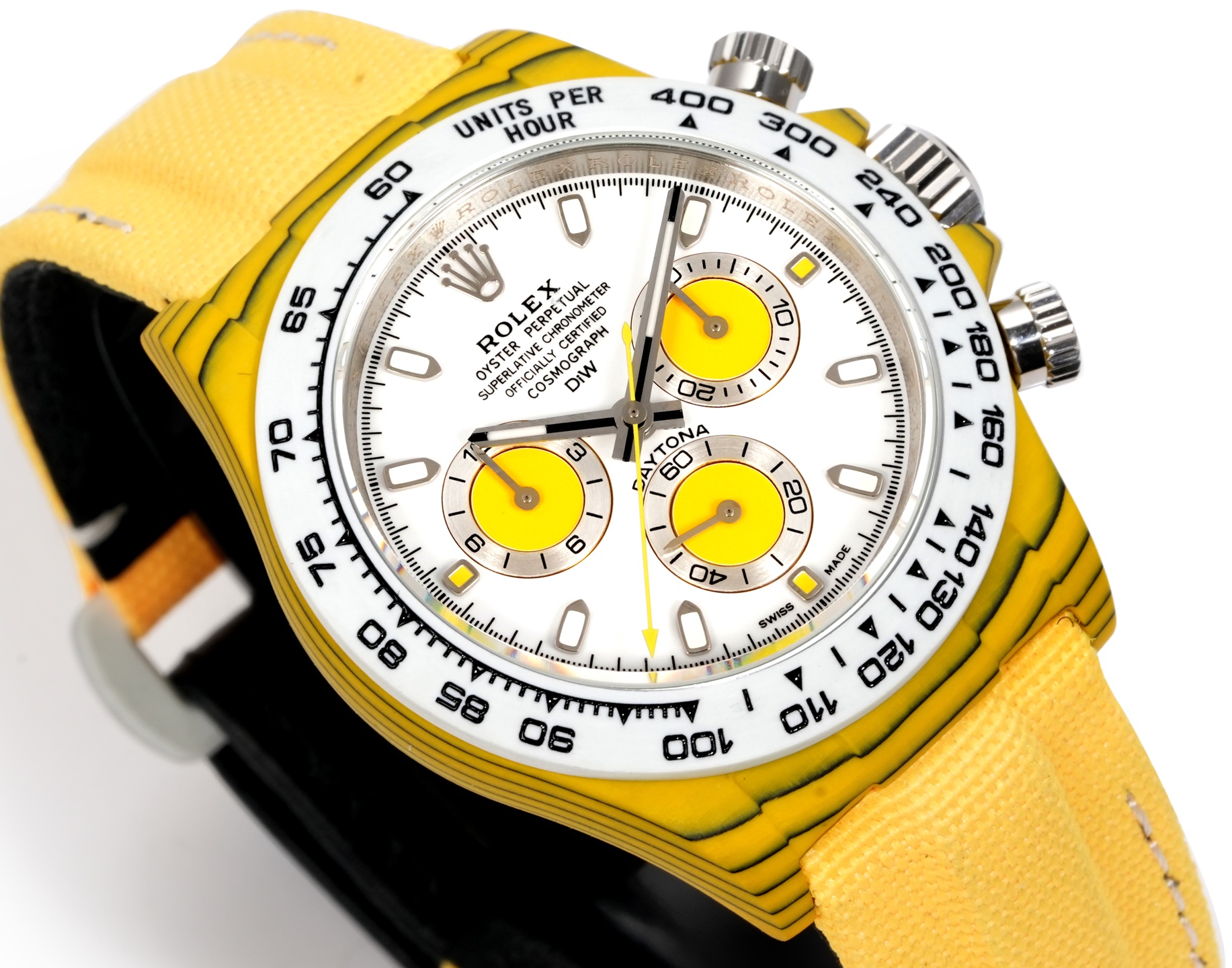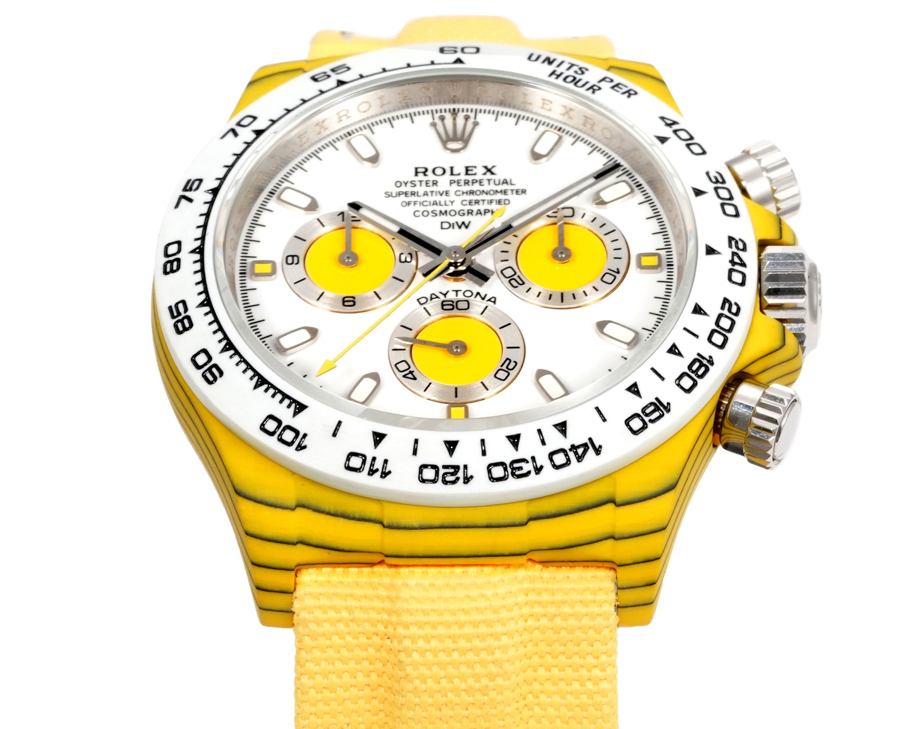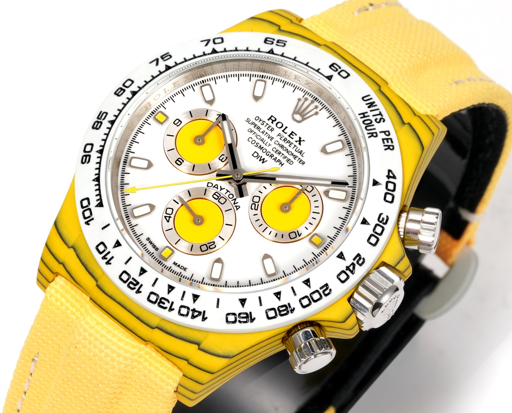 TWファクトリーのロレックスデイトナは、カーボンファイバーを用いることで伝統的な時計素材から興味深い逸脱を見せています。40mm x 12.4mmの寸法はオリジナルに忠実ですが、ケース、ベゼル、ケースバックにわたる高複合カーボンファイバーの使用がそれを際立たせます。各時計のカーボンファイバーパターンは独自のものであり、2つとして同じものは存在しません。これは、高級オーダーメイドモデルに通常見られる排他的なアプローチです。