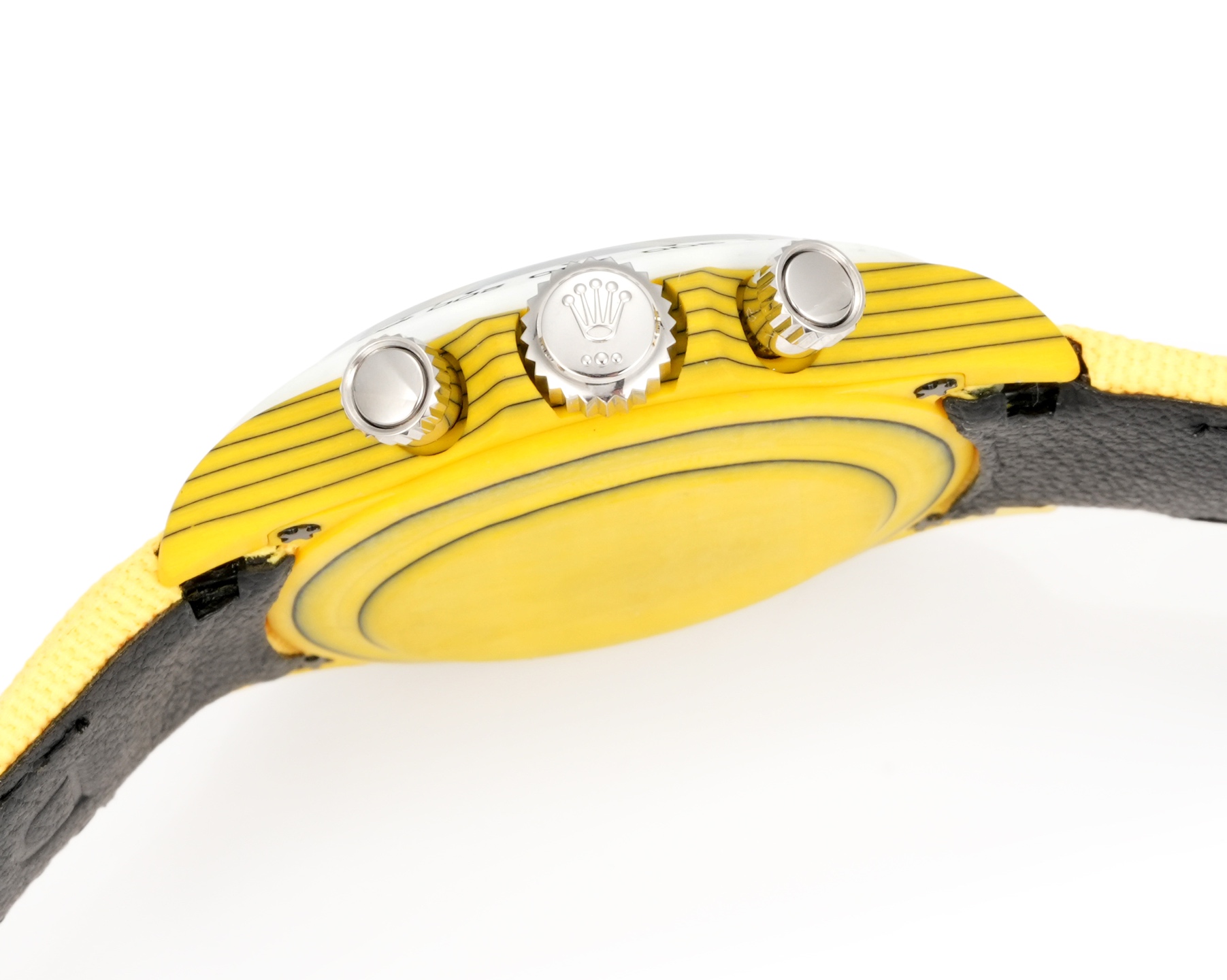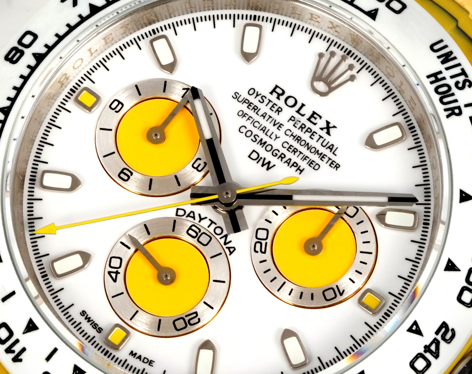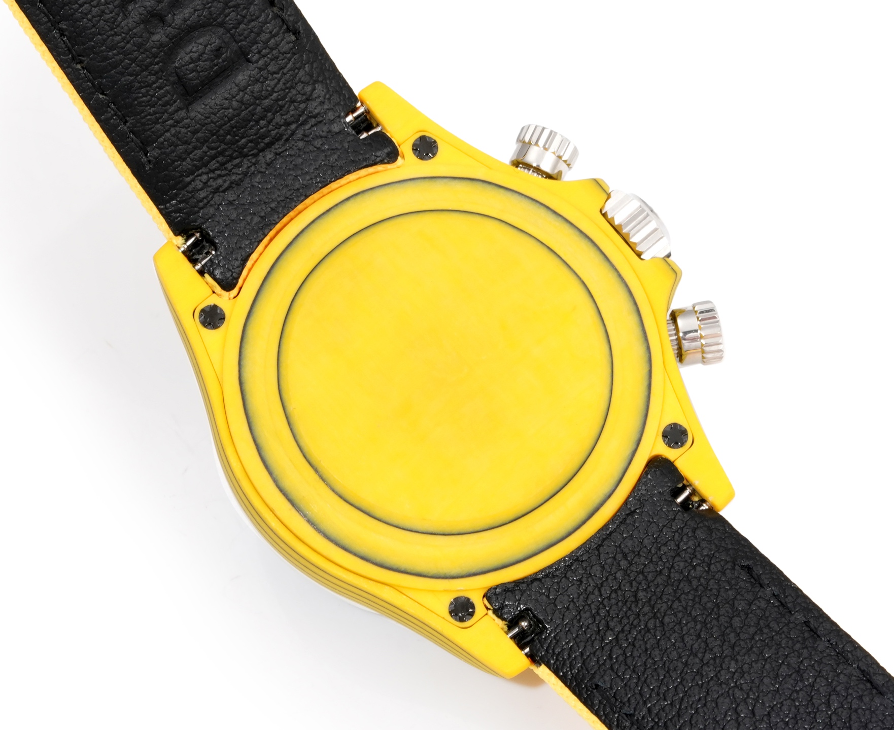 TWファクトリーのロレックスデイトナは、カーボンファイバーを用いることで伝統的な時計素材から興味深い逸脱を見せています。40mm x 12.4mmの寸法はオリジナルに忠実ですが、ケース、ベゼル、ケースバックにわたる高複合カーボンファイバーの使用がそれを際立たせます。各時計のカーボンファイバーパターンは独自のものであり、2つとして同じものは存在しません。これは、高級オーダーメイドモデルに通常見られる排他的なアプローチです。