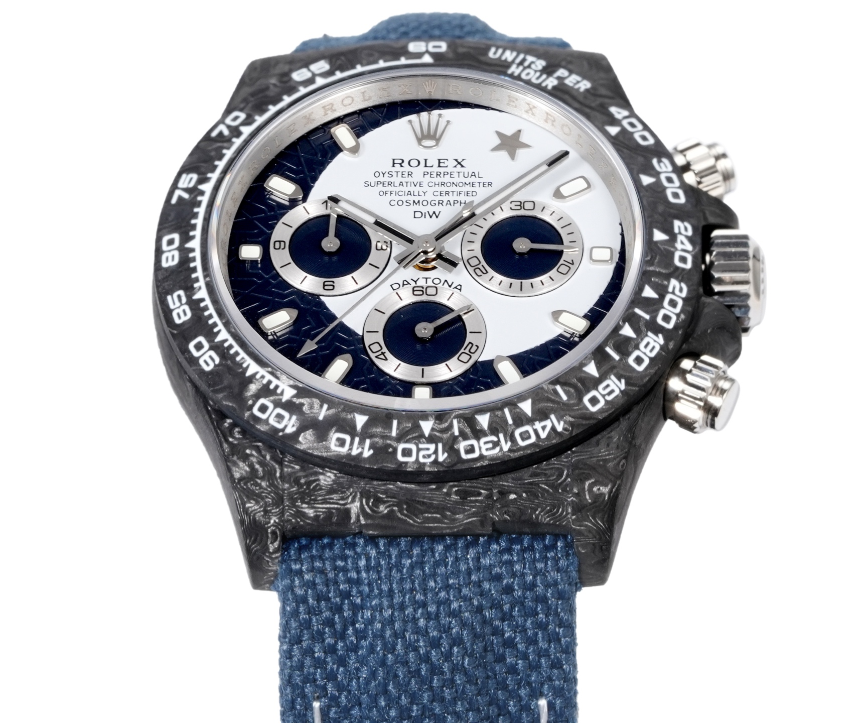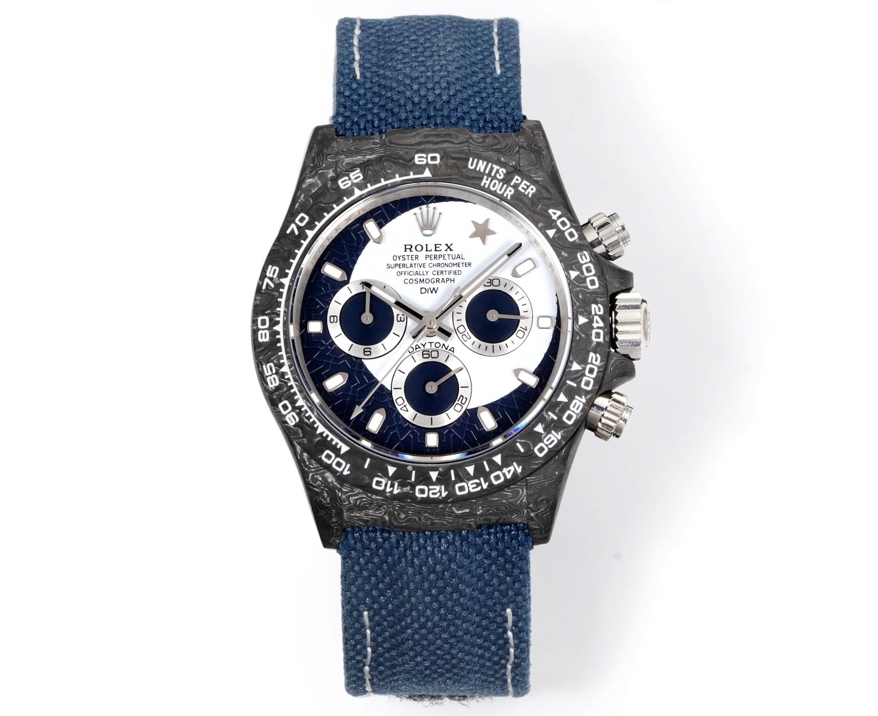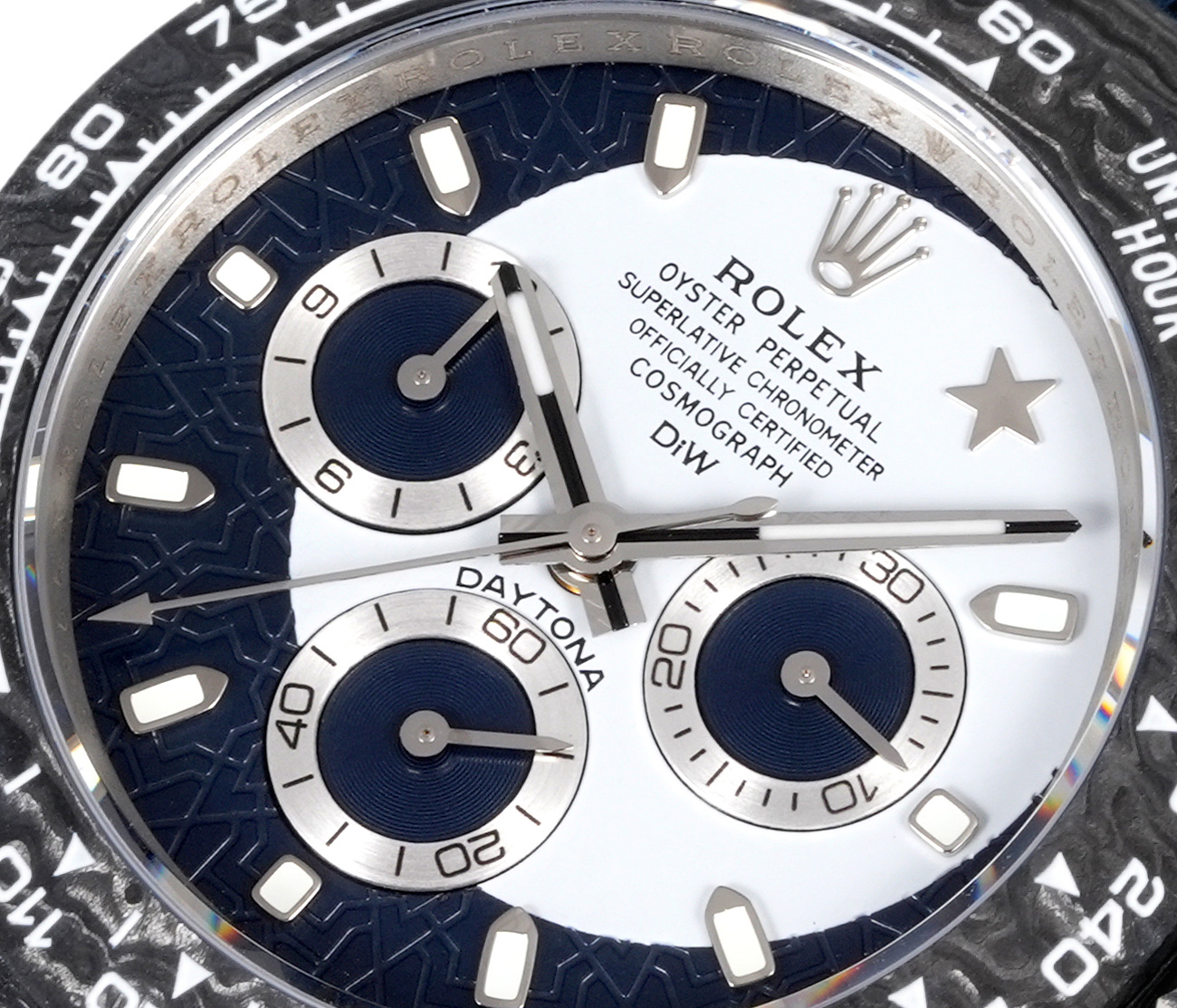 TWファクトリーデイトナの最初の特徴は、高複合カーボンファイバーの独特な使用です。各時計はユニークなカーボンファイバーのパターンを持ち、同じものは二つとありません。このデザインの個性は、芸術性と先進的な製造プロセスの両方を物語ります。ケース、ベゼル、ケースバックはすべてこの素材で作られており、軽量で耐久性のある洗練された頑丈な構造を示しています。直径40mm、厚さ12.4mmで、デイトナシリーズのクラシックなプロポーションを保ちながらも、全く新しい触感を提供します。