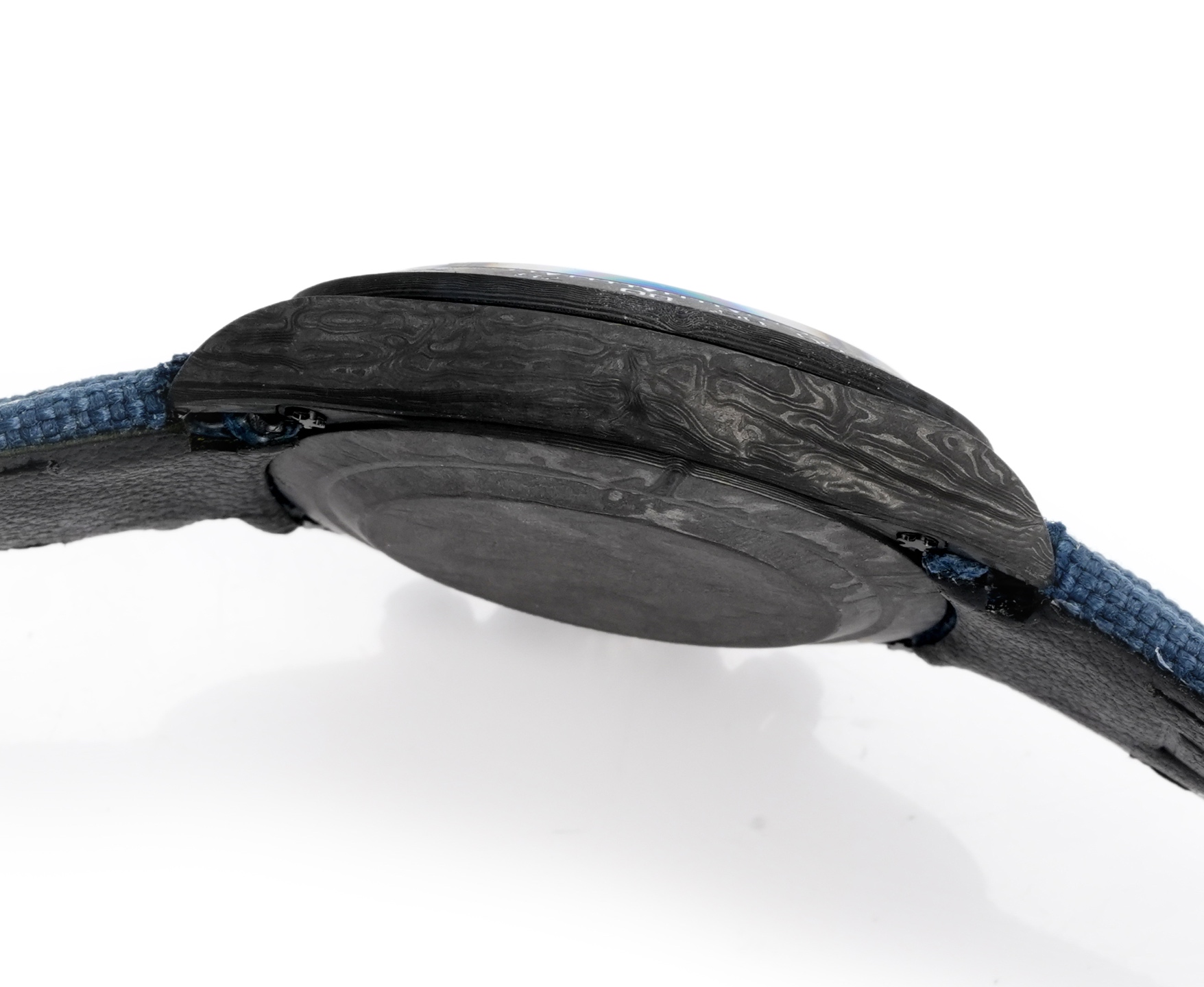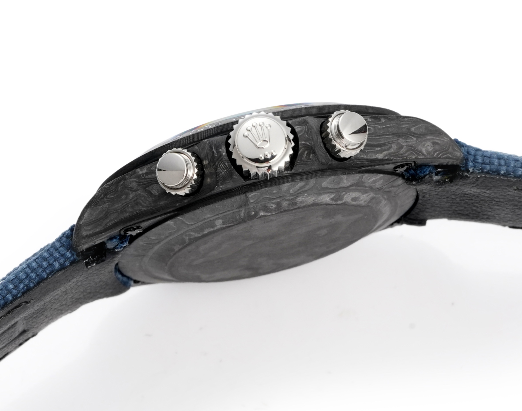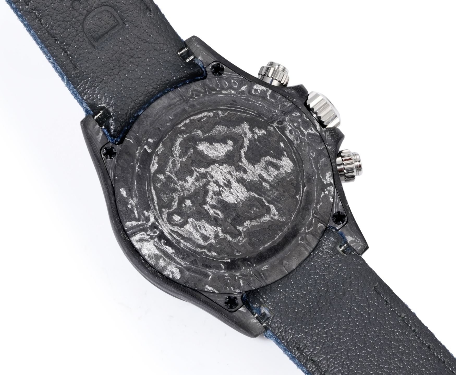 TWファクトリーデイトナの最初の特徴は、高複合カーボンファイバーの独特な使用です。各時計はユニークなカーボンファイバーのパターンを持ち、同じものは二つとありません。このデザインの個性は、芸術性と先進的な製造プロセスの両方を物語ります。ケース、ベゼル、ケースバックはすべてこの素材で作られており、軽量で耐久性のある洗練された頑丈な構造を示しています。直径40mm、厚さ12.4mmで、デイトナシリーズのクラシックなプロポーションを保ちながらも、全く新しい触感を提供します。