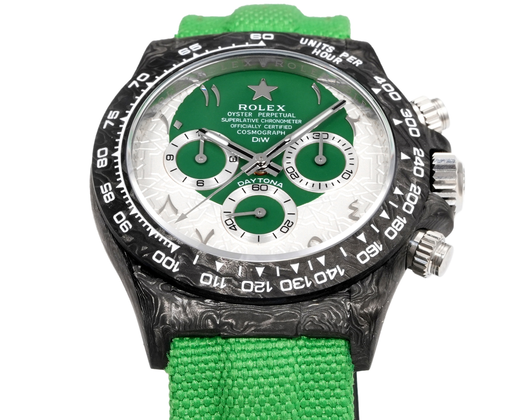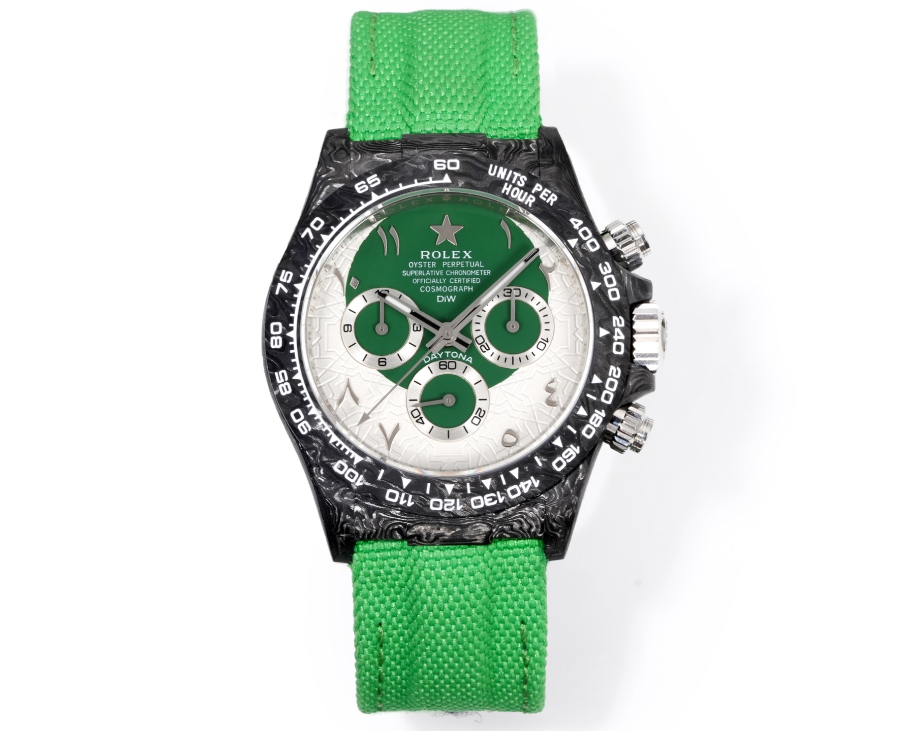 TWファクトリーの職人技に対する献身は、デイトナ カーボンファイバーエディションの寸法と仕上げに明らかです。40mmのケースは、オリジナルと同じサイズで、ブランドの象徴的なデザインに対する深い敬意を示しつつ、ケース、ベゼル、ケースバック全体に高複合カーボンファイバーを革新的に使用することで独自のアイデンティティを主張しています。超強力な発光パウダーの適用により、昼間の鑑賞の喜びだけでなく、薄暗い環境でも機能的かつ印象的であることを保証します。素材におけるこのような革新は、美学と実用性を融合させたレプリカ時計における大胆な一歩を示しています。