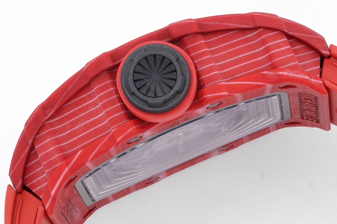 RM35-02のケースは、工学と材料科学の勝利を象徴しています。高性能クォーツTPTで製作されており、45マイクロメートルの厚さのクォーツファイバーと二酸化ケイ素のブレンドで、強度と優雅さを兼ね備えています。サイズは49.94×44.5mmで、正確な45度の角度で織り込まれたファイバーが120°Cの3段階の炉で加熱される独自の構造を持ちます。最終形態はProArtで実現され、軽量でありながら非常に耐衝撃性に優れた構造を保証します。さらに、ケースは低アレルギー性と紫外線への耐性を備えており、耐久性と快適さを確保し、美的にも機能的にも際立つ選択肢となっています。